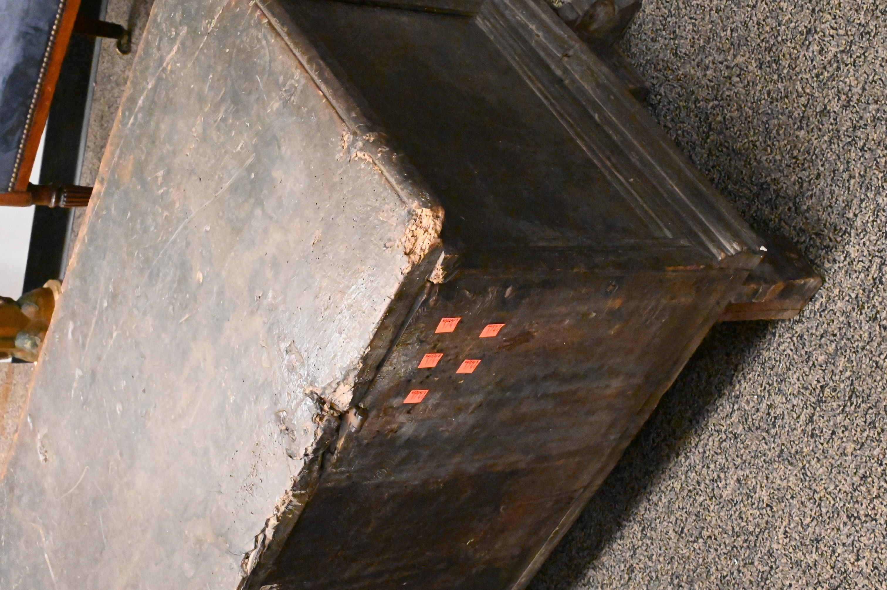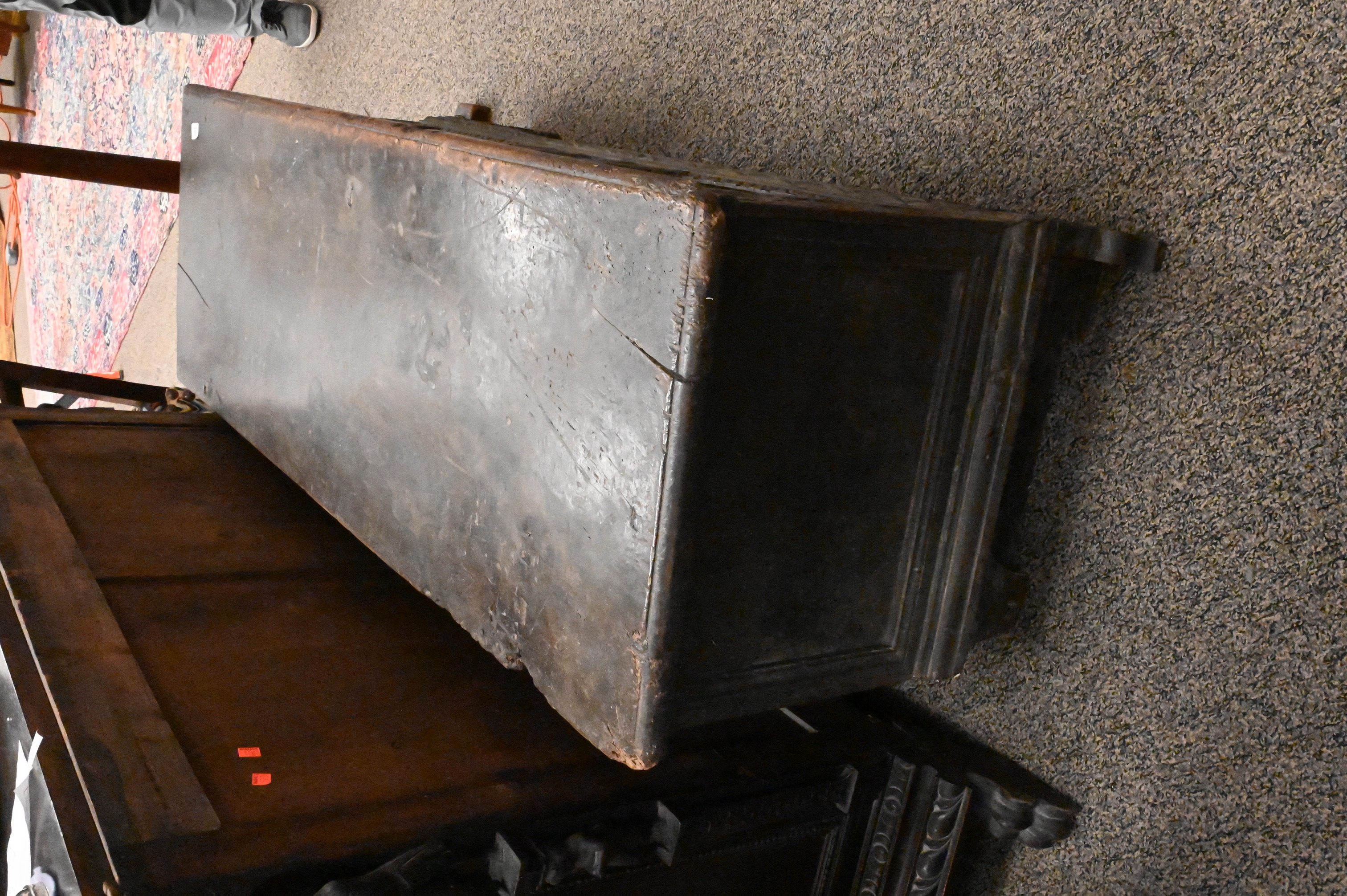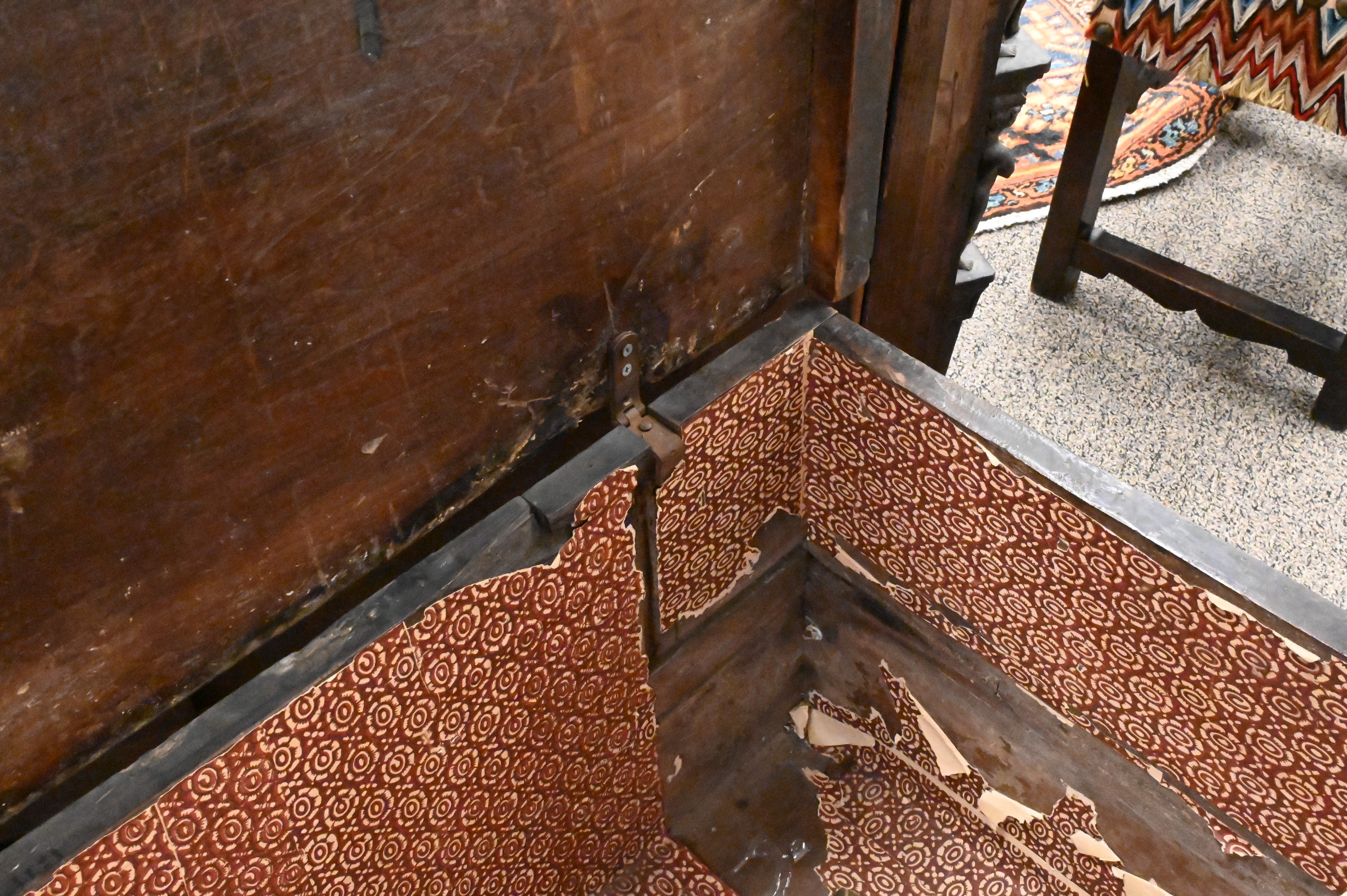 having lift top front with panels of pinwheels, set on carved bracket base, probably 17th century
