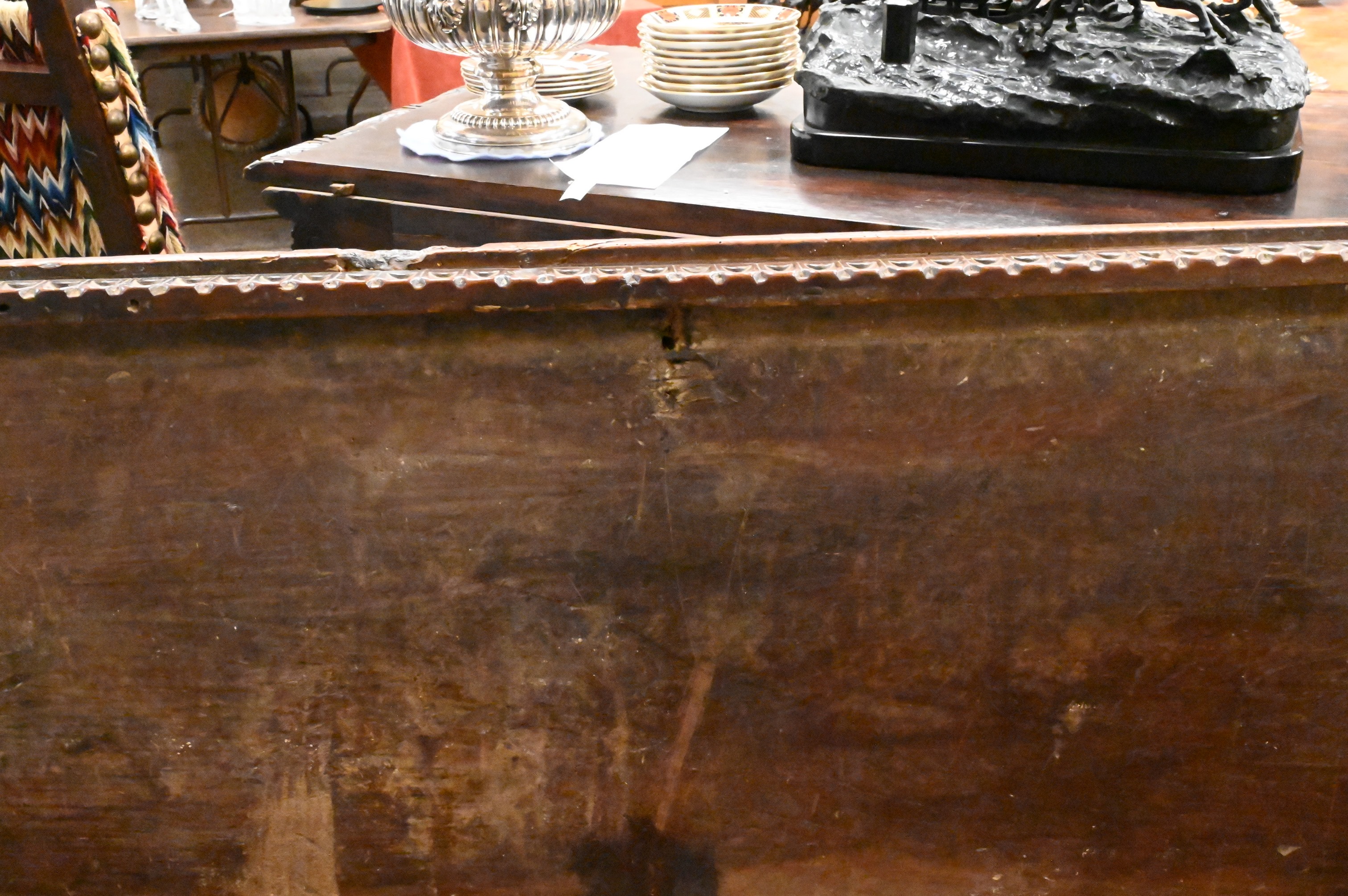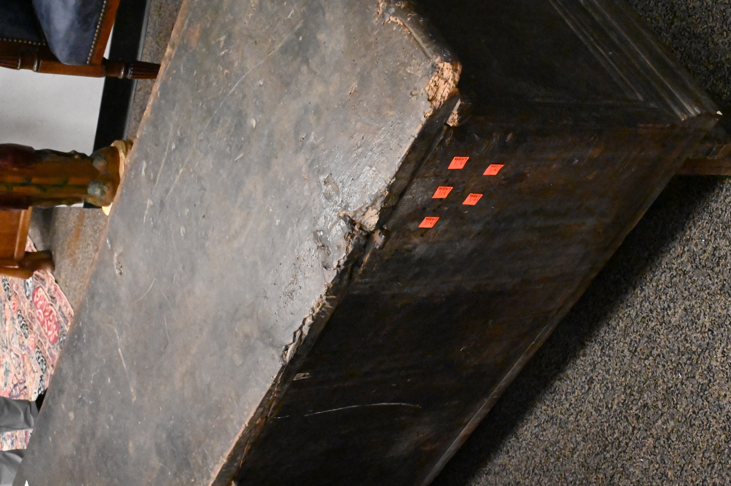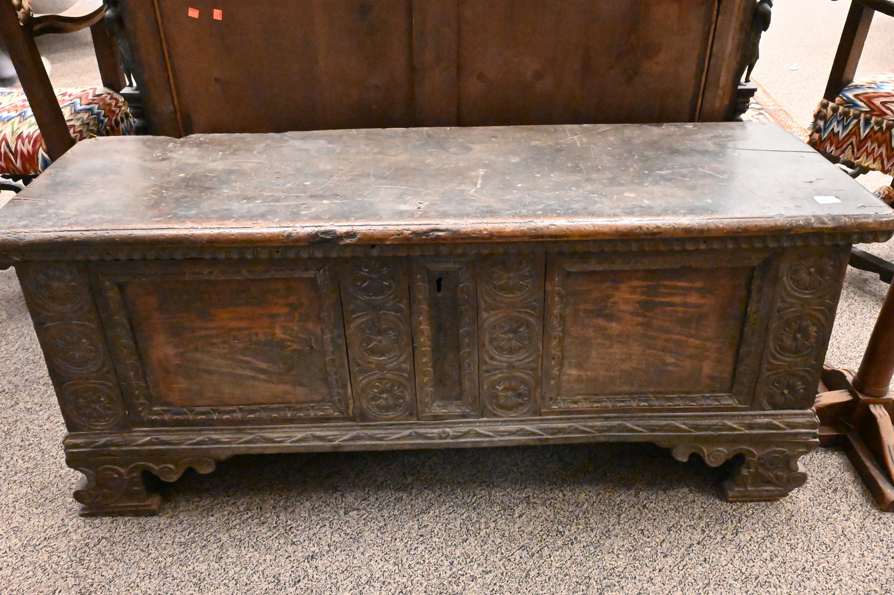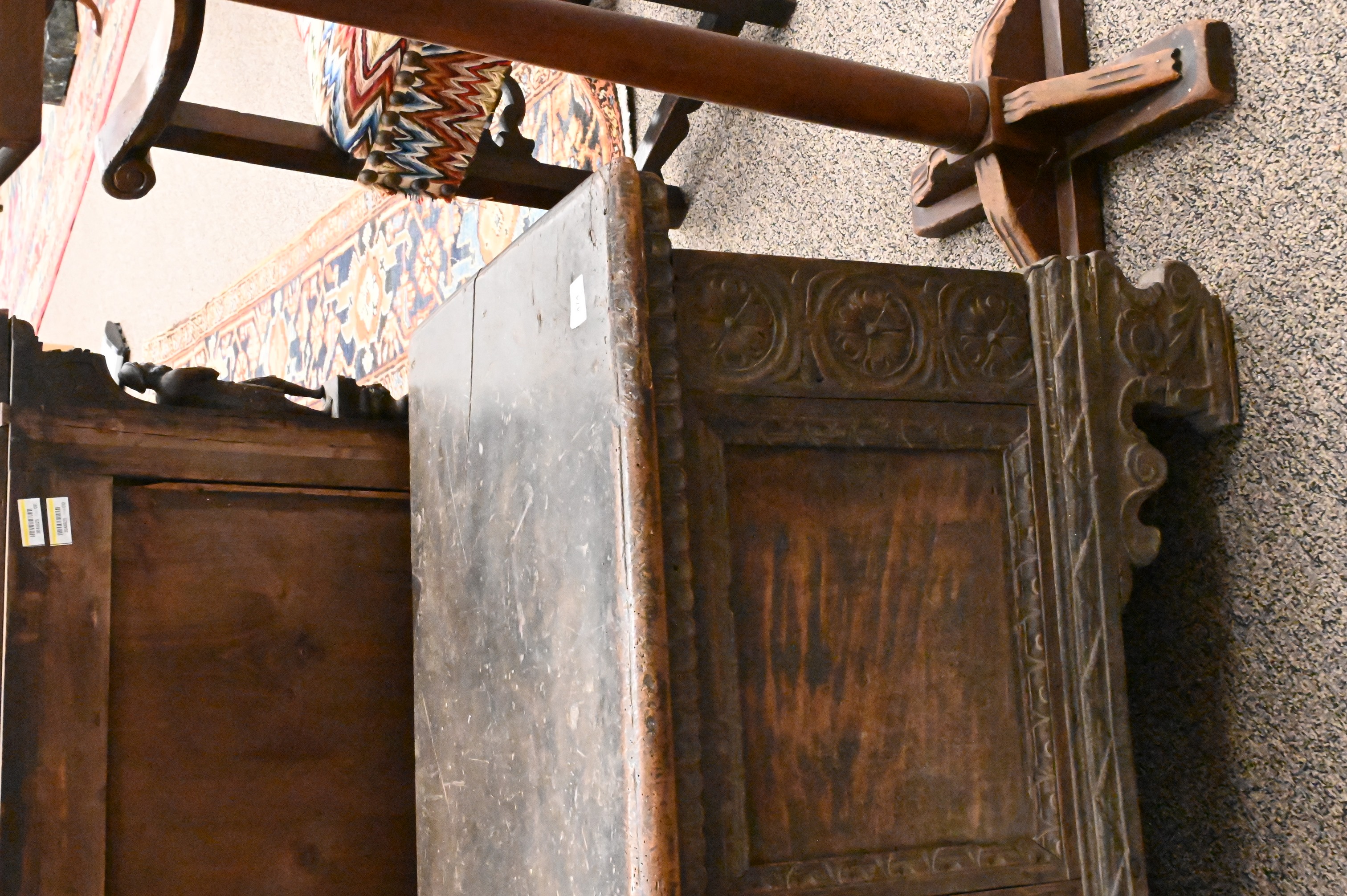 having lift top front with panels of pinwheels, set on carved bracket base, probably 17th century