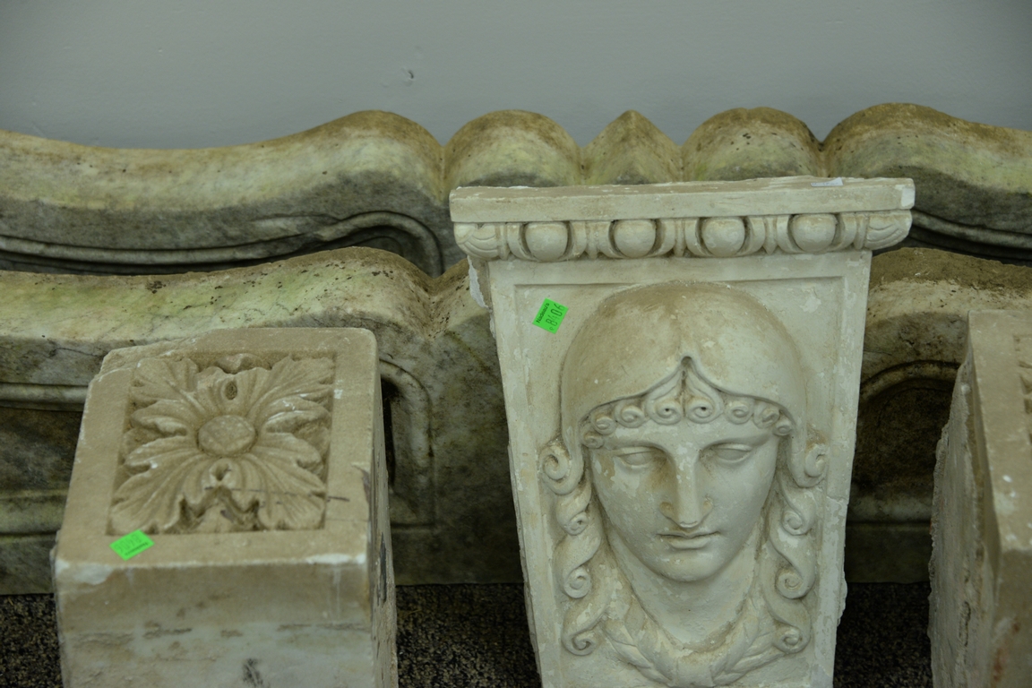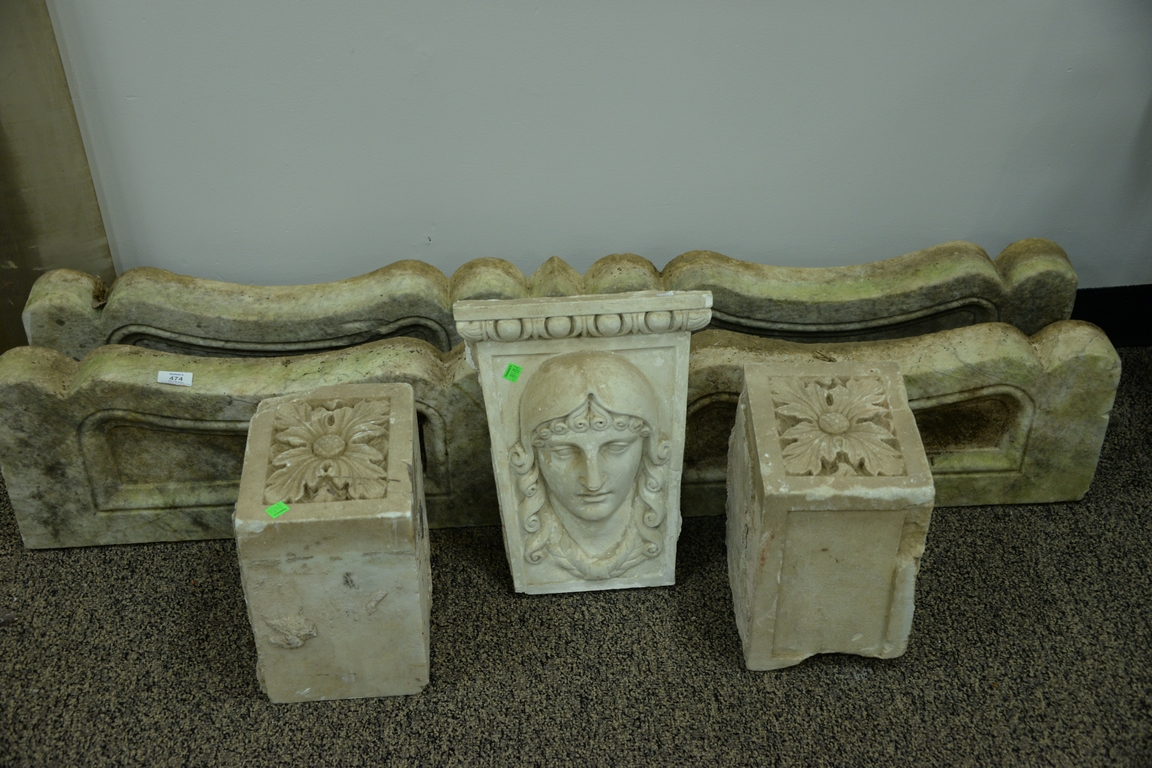 Lot 474: Five piece lot of marble including two long supports, two blocks with flowers, and a stone carved bust of a woman. 53 x 10 x 3 Pr…