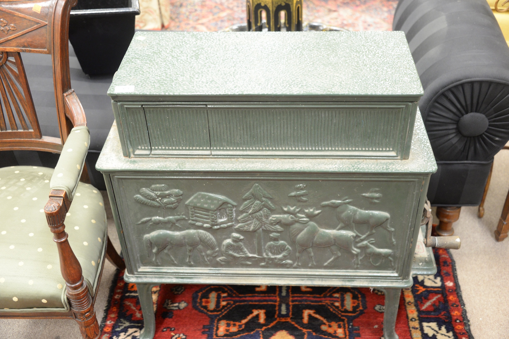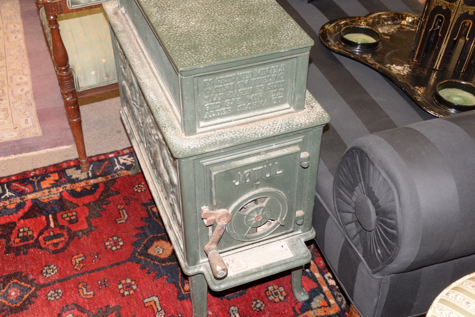 Jotul Enamel Wood Stove, height 31 inches, length 28 1/2 inches, width 14 inches.
