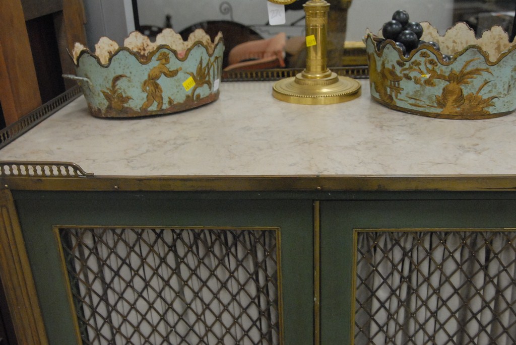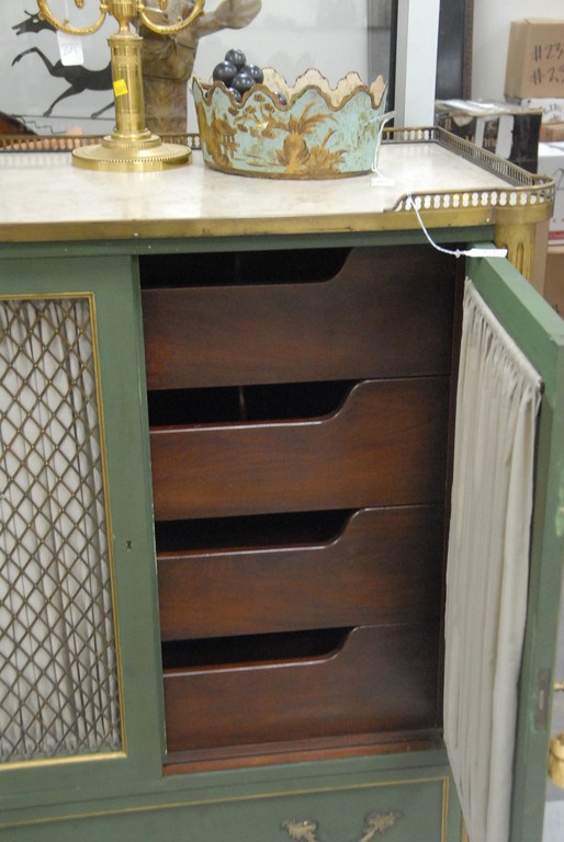 Louis XVI style chest with brass gallery top with inset beige marble, two grillwork doors opening to reveal fitted drawer interior over two drawers on turned legs with all over green paint highlighted with gold, early 20th century. Provenance: property from a home in Rockville Center, New York which was decorated by Iris Apfel. ht. 53in. wd. 36in.