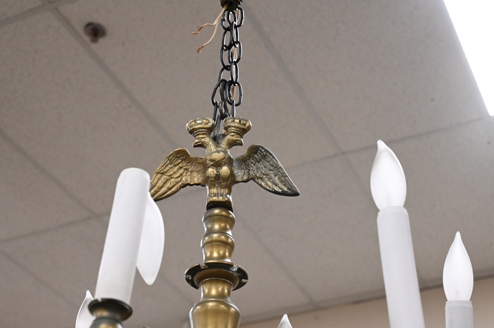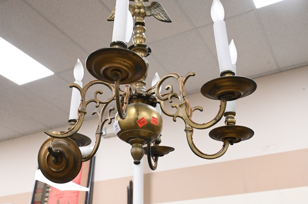 Lot 474: Northern European Baroque Brass Six Light Chandelier, late 18th / early 19th century, having spherical pendant and turned body supporting six scrolling candle arms, each with circular drip-pan and shaped nozzle, the whole fitted with shaped brass reflectors and surmounted by a double headed eagle, fitted for hanging, length approx 31 inches, length of body approx 21 inches, width 22 inches, one arm as is.