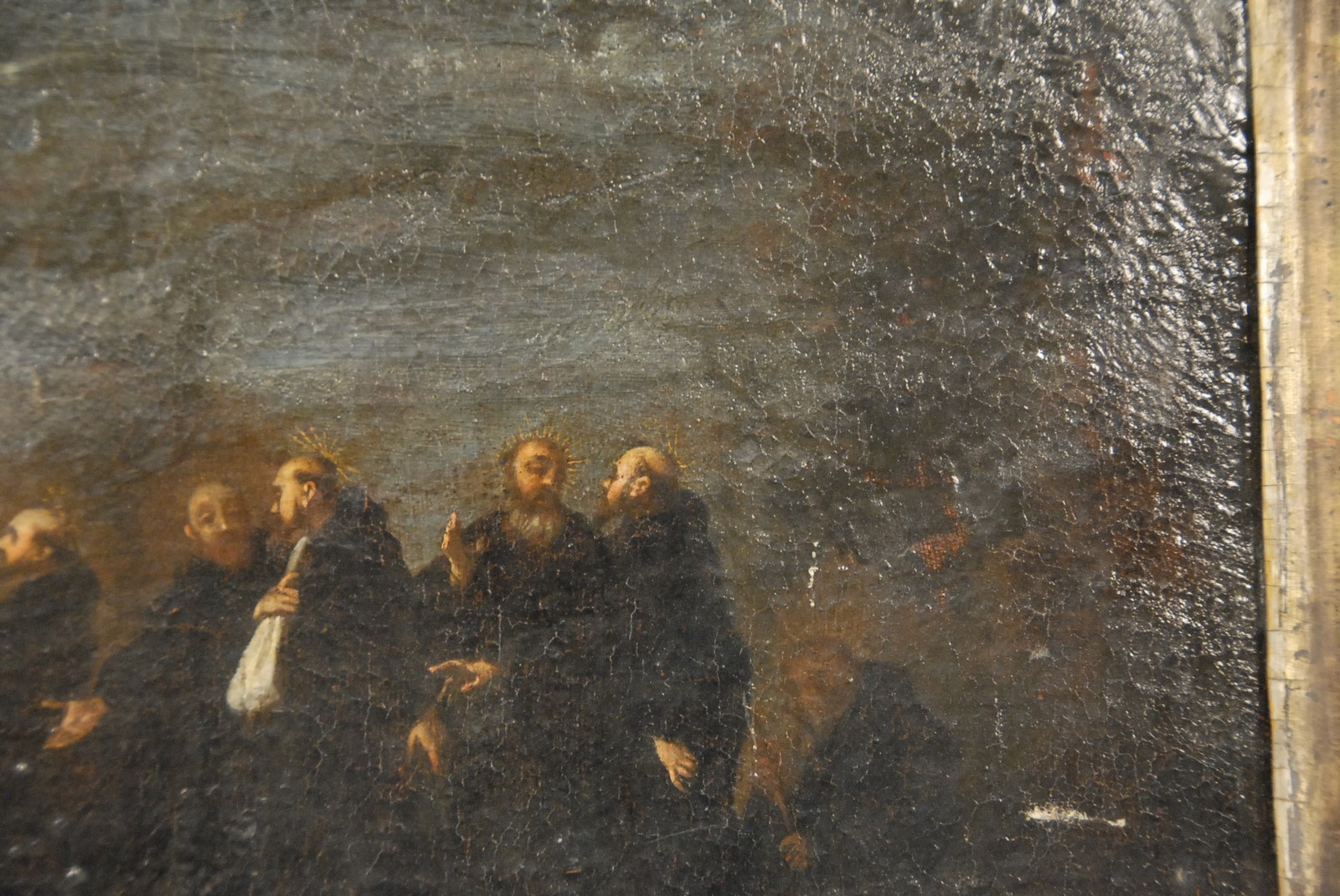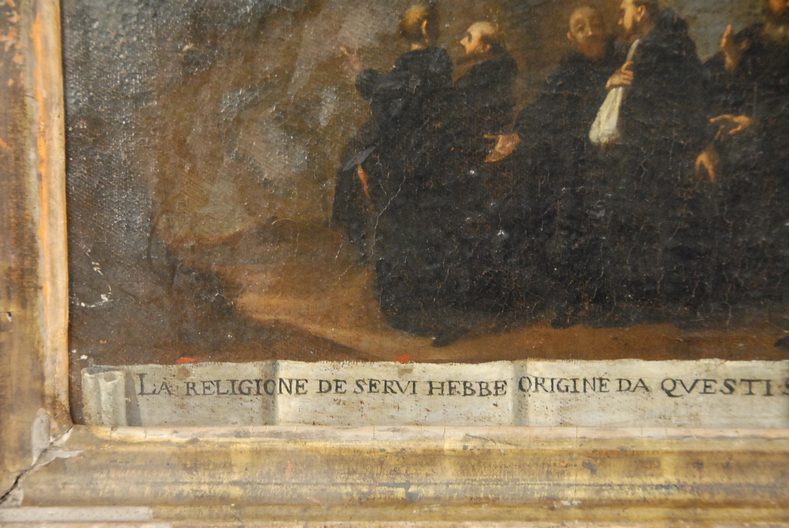 Lot 474: Old Master RELIGIOUS SCENE oil on canvas written on bottom La Religione De Servi Hebbe Origine Da Questi Sette Beati Fiorentini 1233 oil on canvas mounted on canvas 16th/17th century 9 3/4 x 14