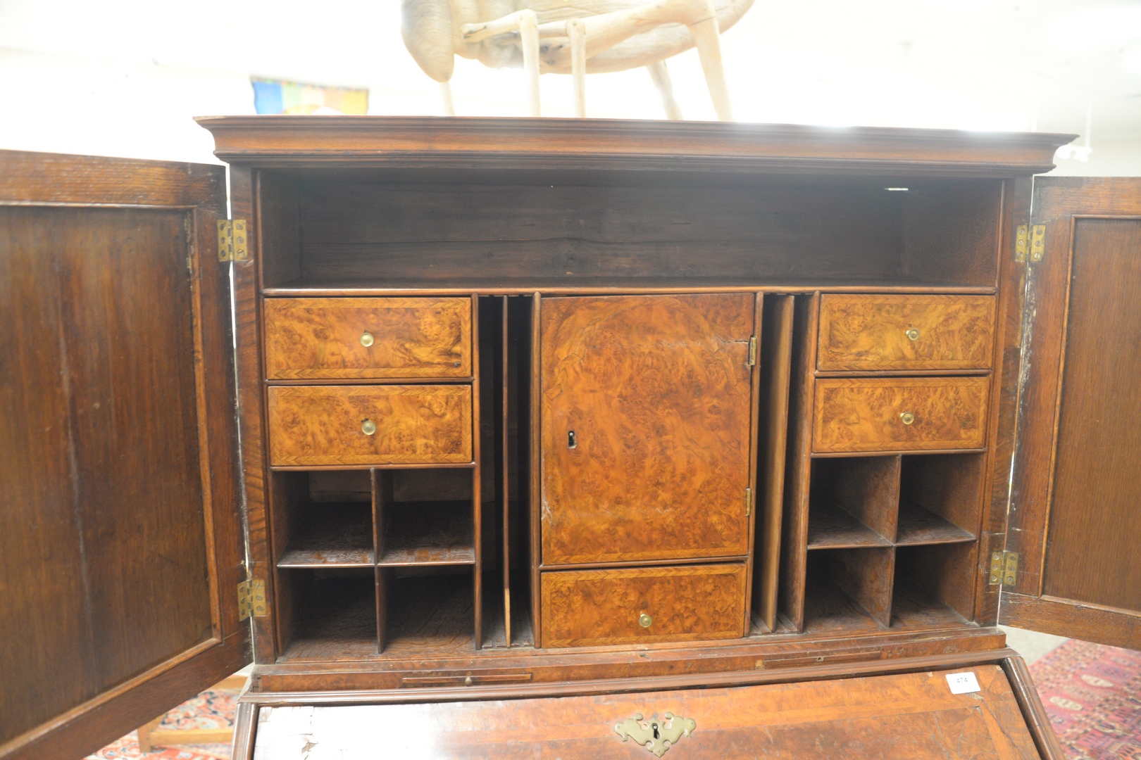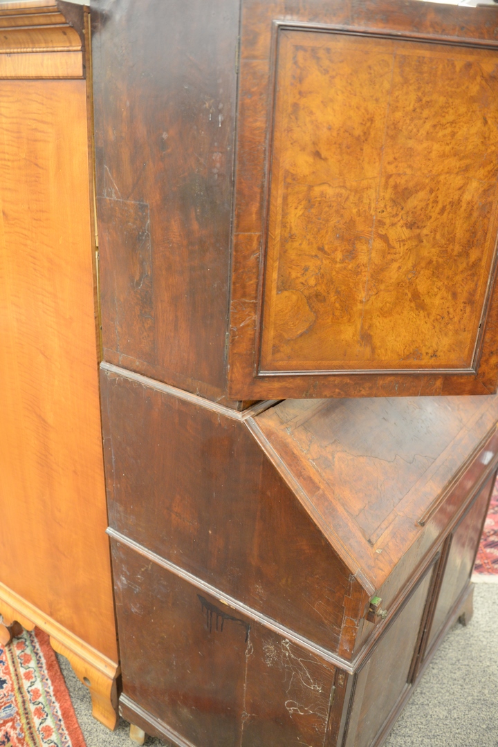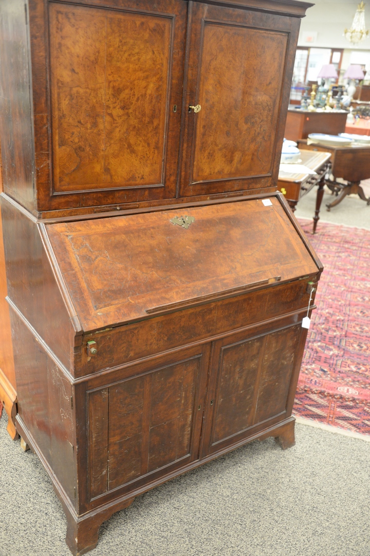 Lot 474: Queen Anne Walnut and Burl Walnut Secretary Desk in two parts, upper section having two doors opening to reveal center door hiding drawers flanked by drawers over slant lid over two doors all set on bracket base, circa 1780, England, height 68 inches