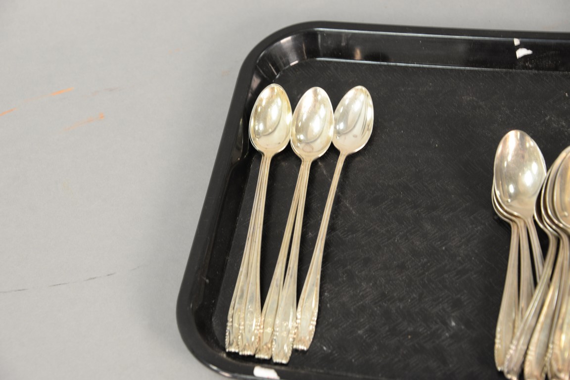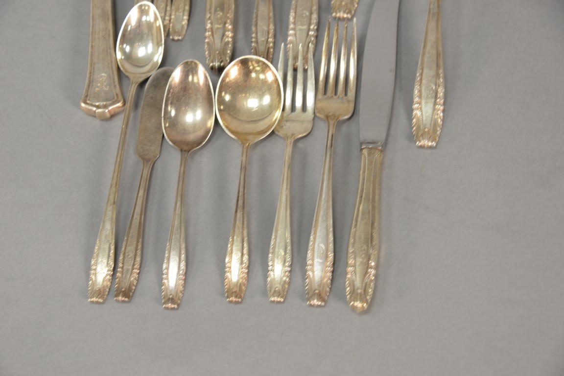 Lot 474: Sterling silver flatware set by Wallace, 93 total pieces to include 12 dinner forks, 12 luncheon forks, 8 soups, 6 ice tea spoons, 2…