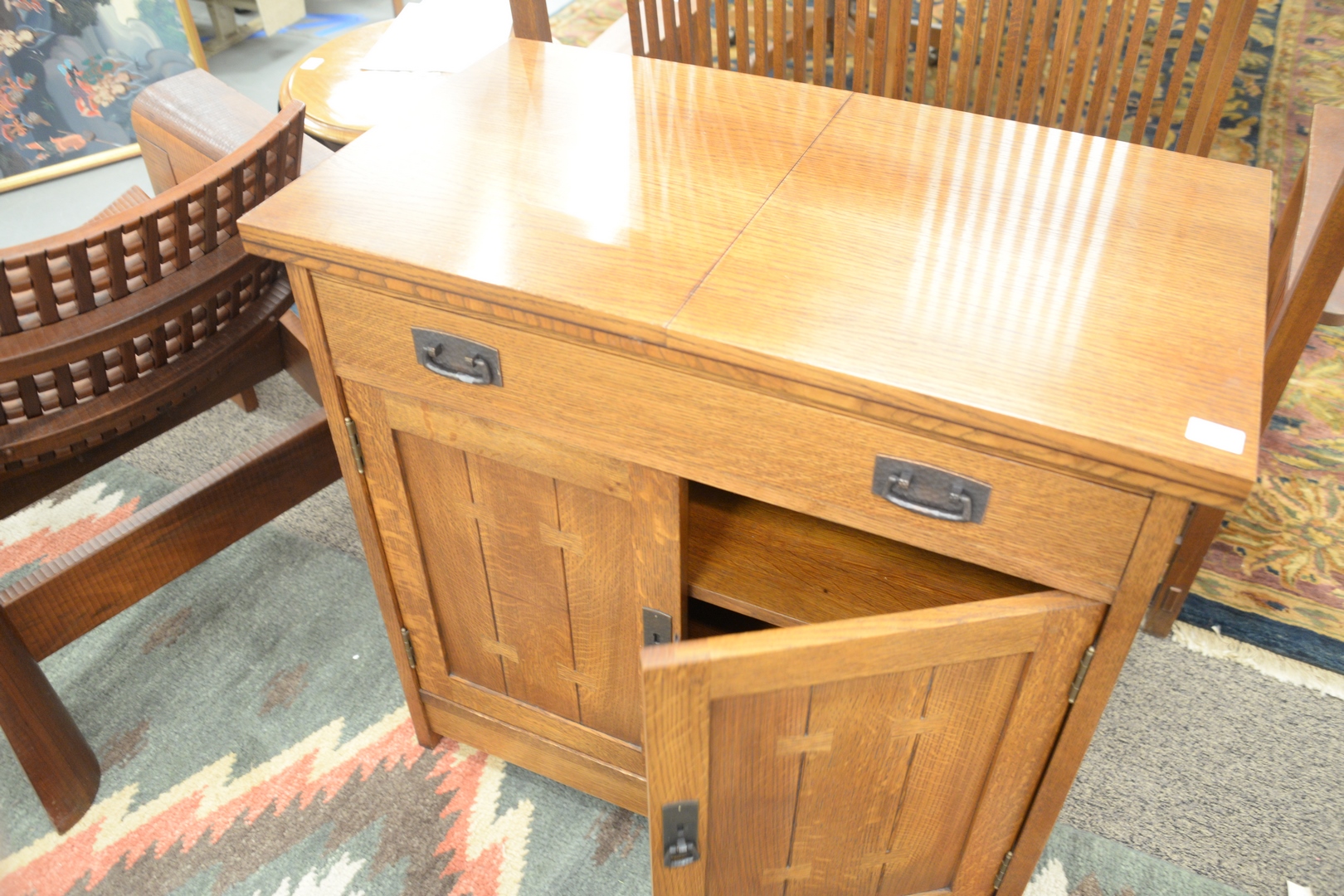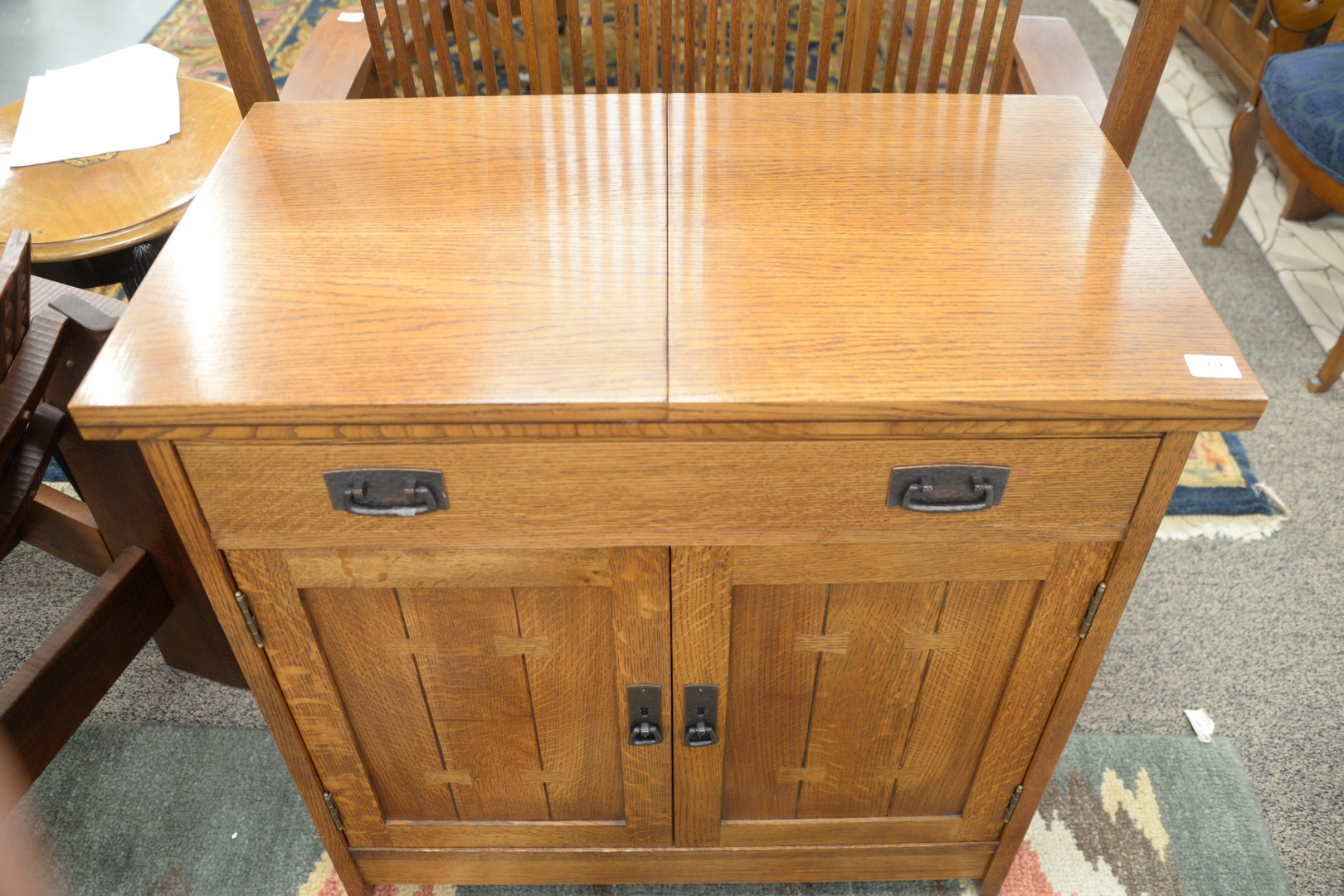 Lot 474: Stickley Mission Oak Bar Cabinet, with lift top drawer and two doors, height 33 1/2 inches, width 35 inches, depth 20 inches.