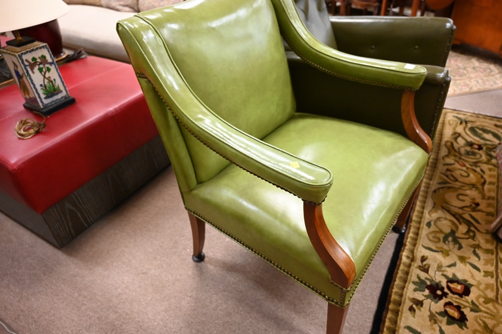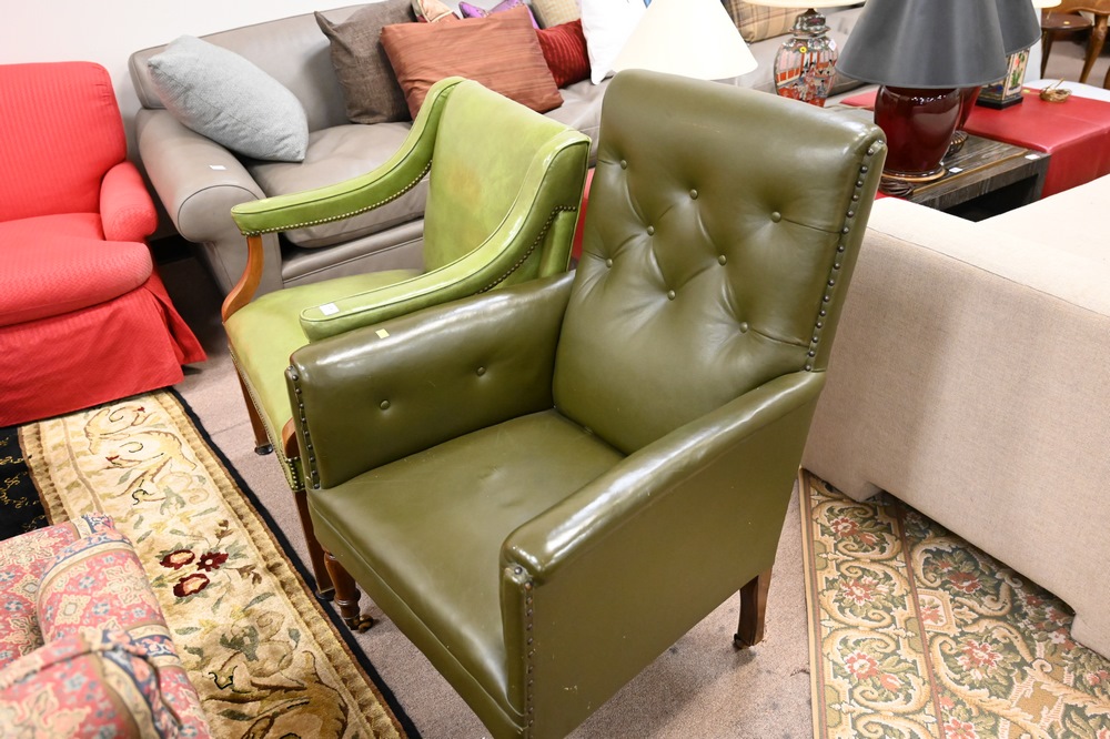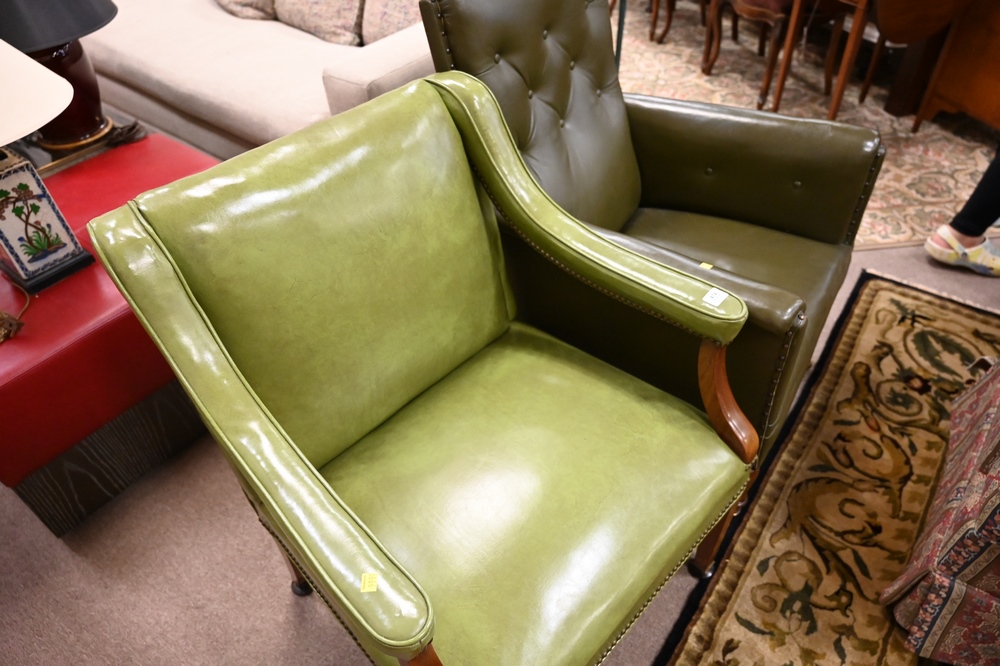 Lot 474: Two Green Leather Armchairs, each having brass tacks, one having tufted back and ending in castors.