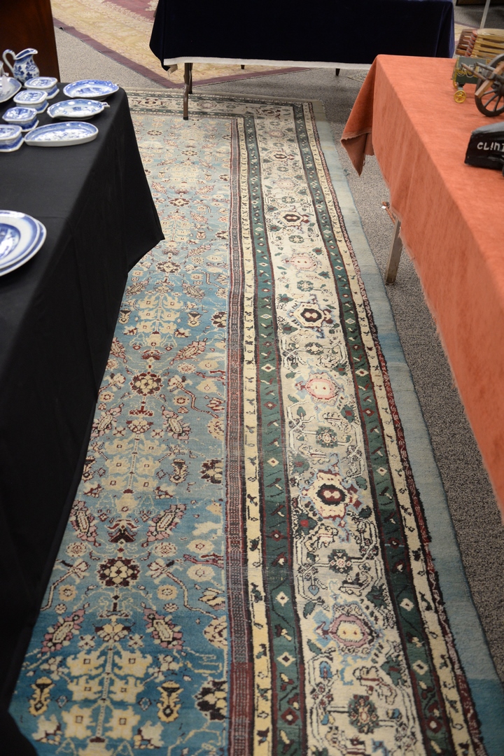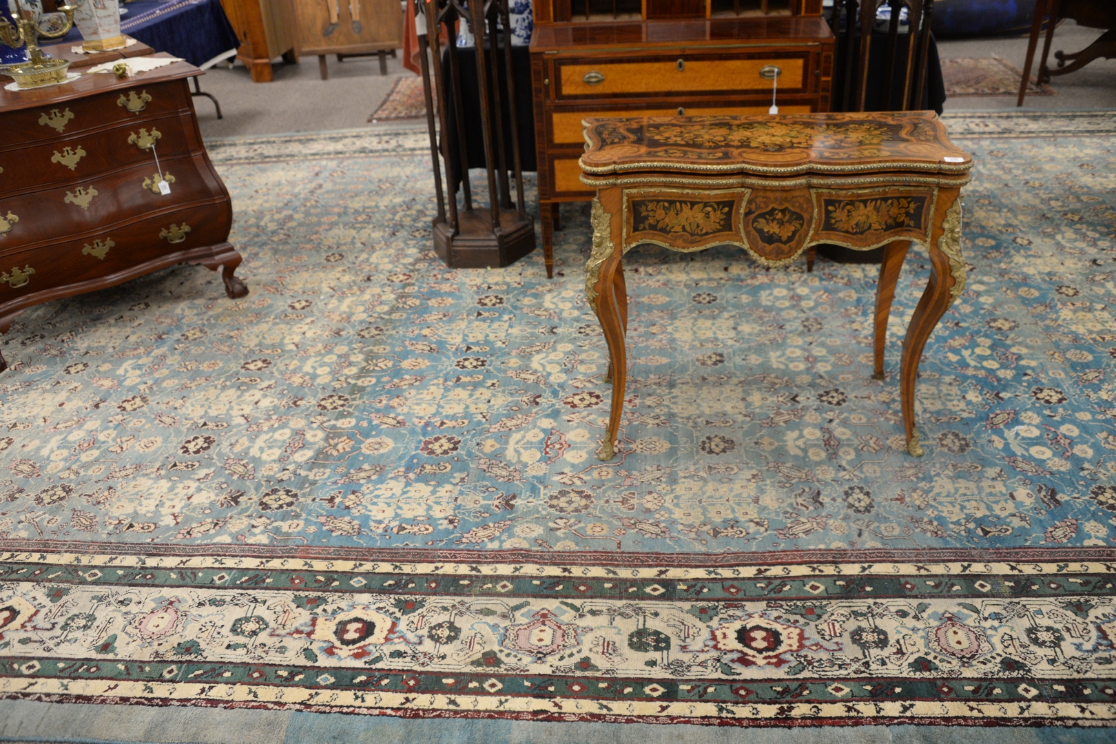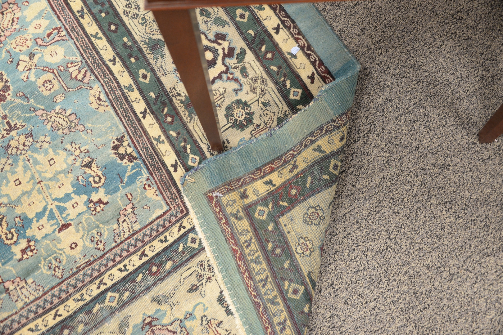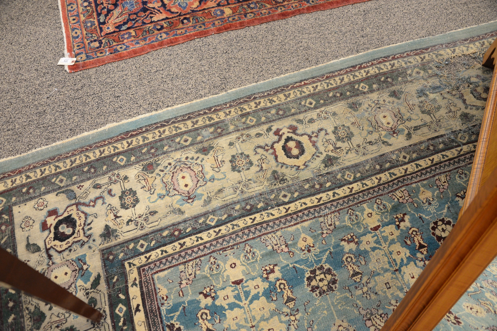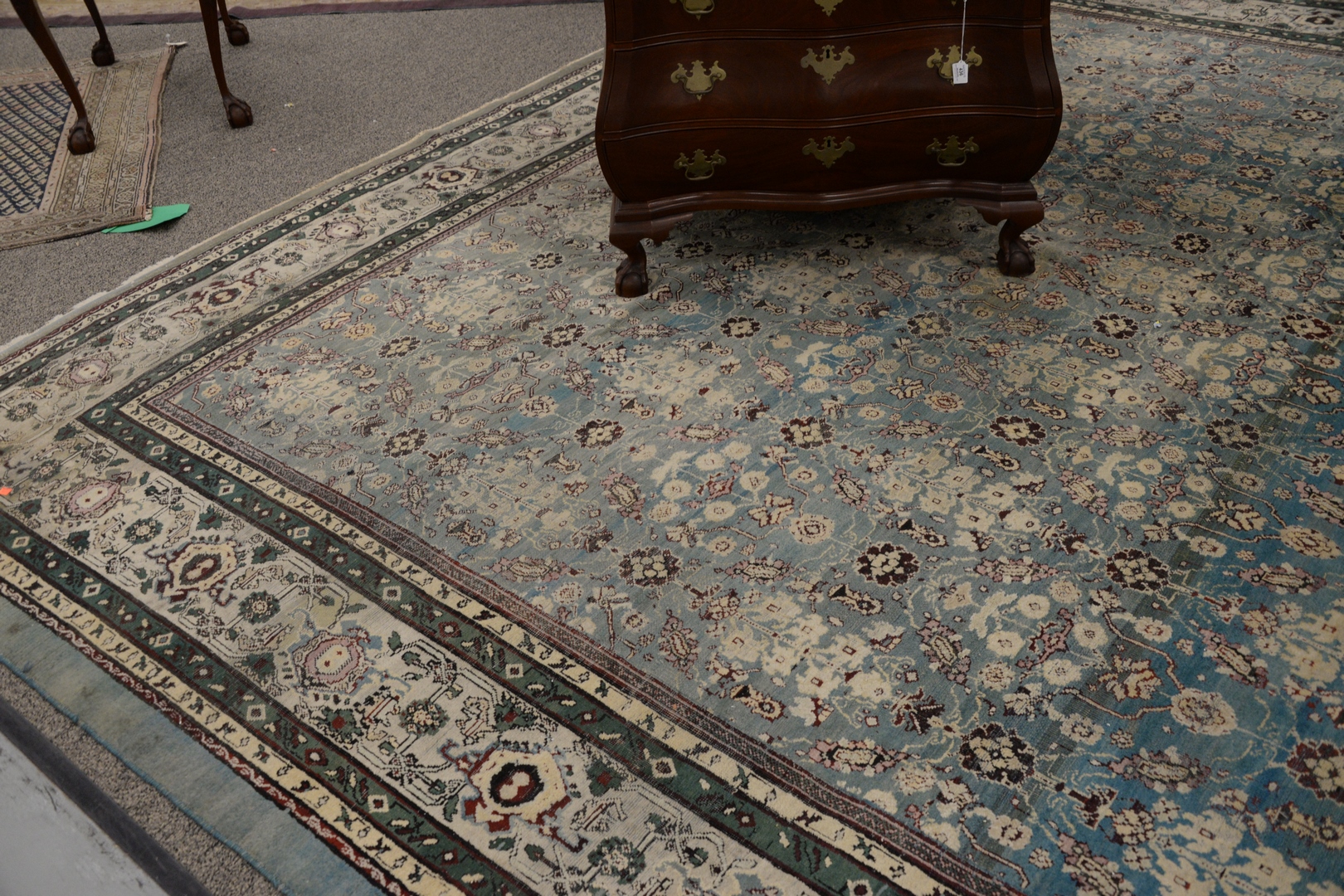 Lot 475: Agra Oriental Carpet, having pale blue field, 13′ 5 x 22′, one end border is very worn with hole, rug cut and reduced on one end.
