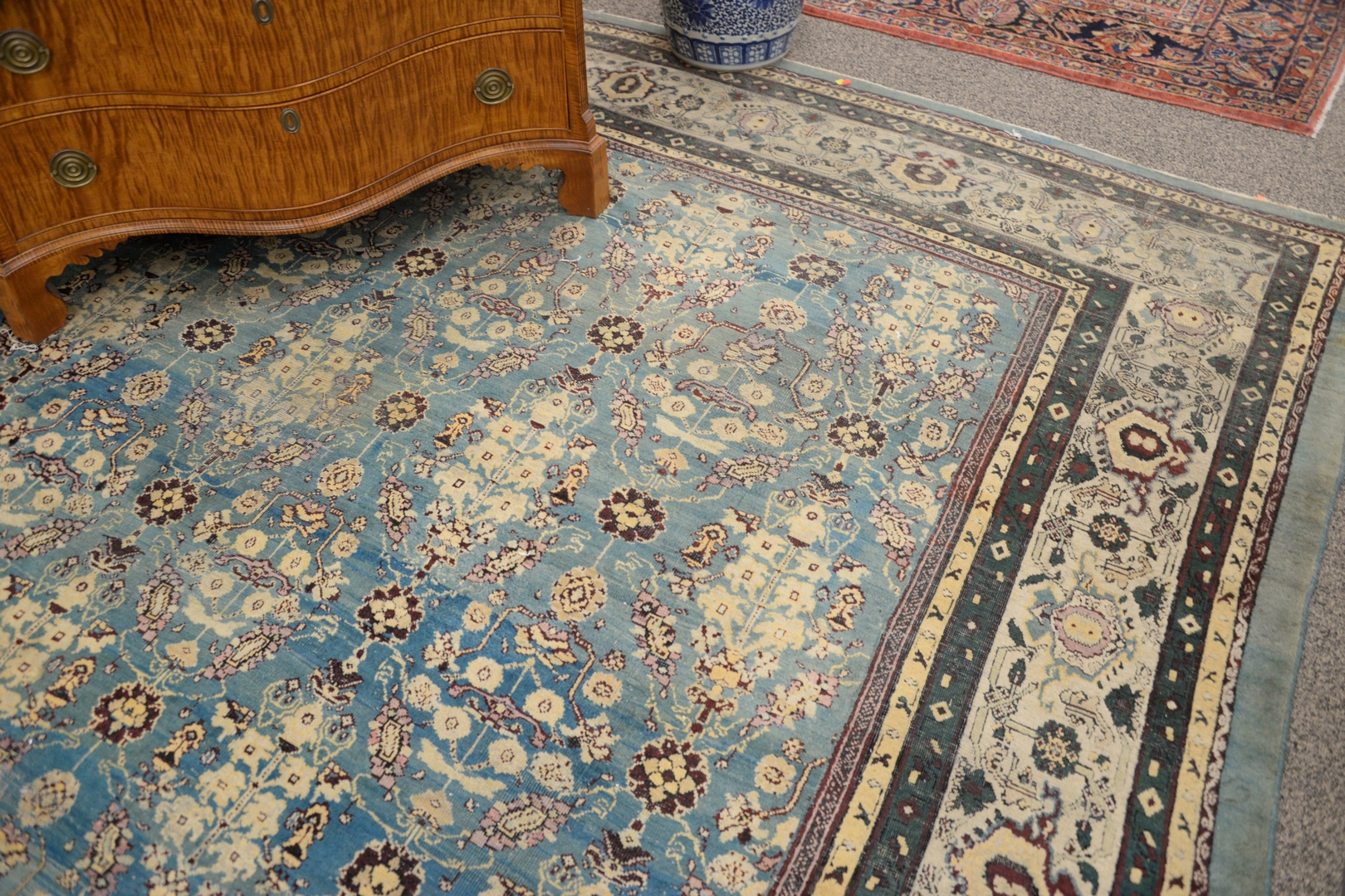 Agra Oriental Carpet, having pale blue field, 13′ 5 x 22′, one end border is very worn with hole, rug cut and reduced on one end.