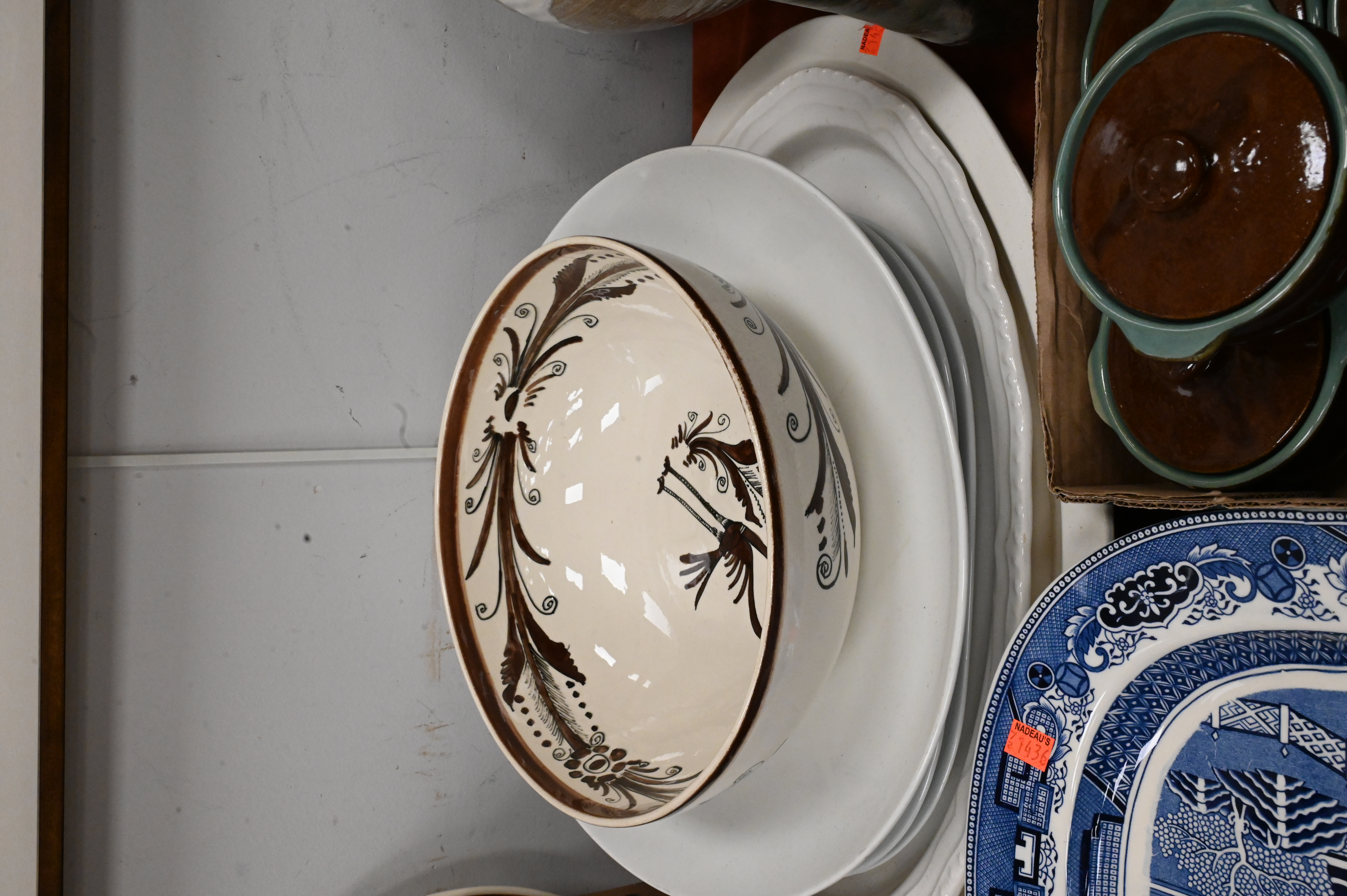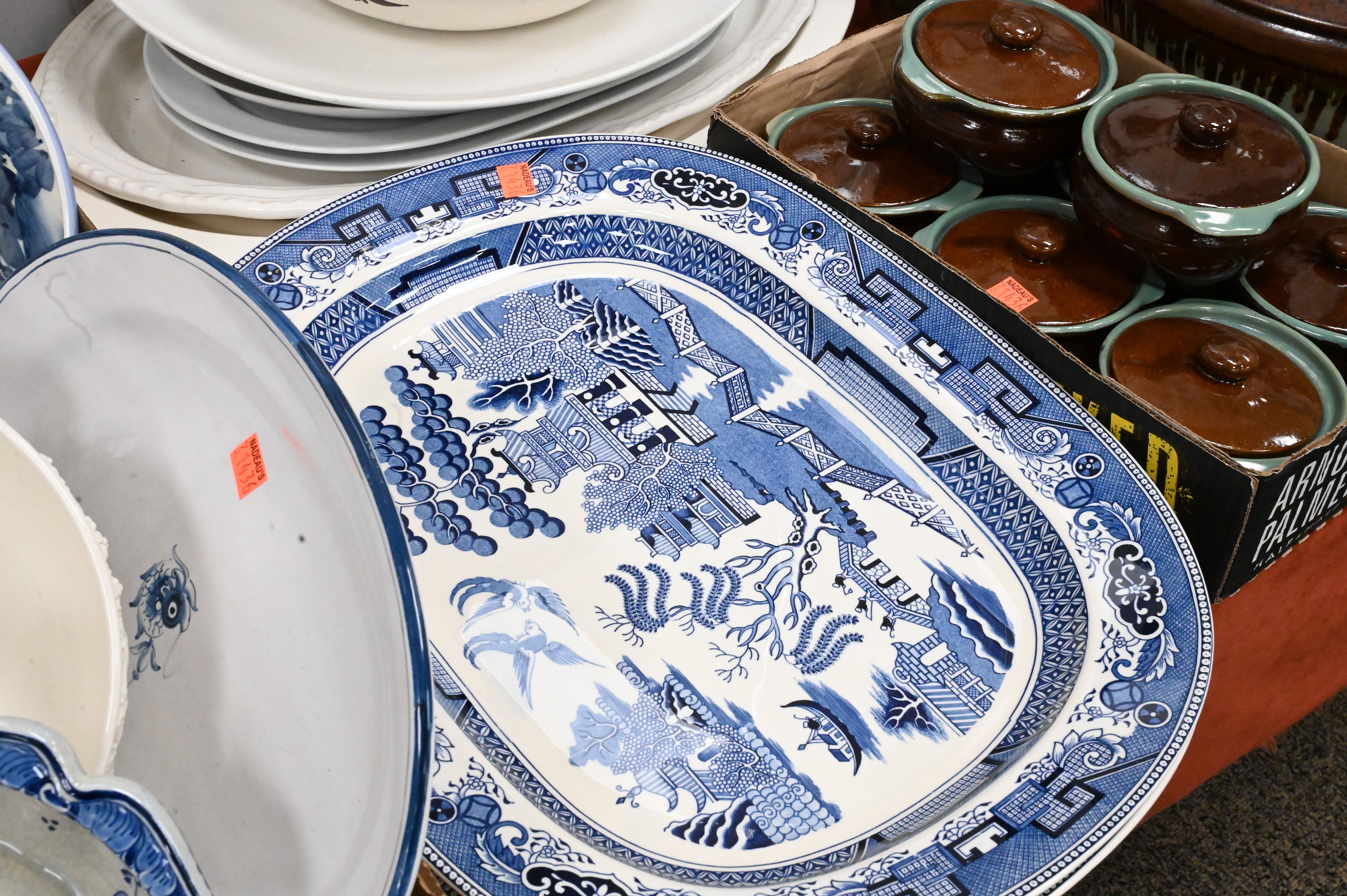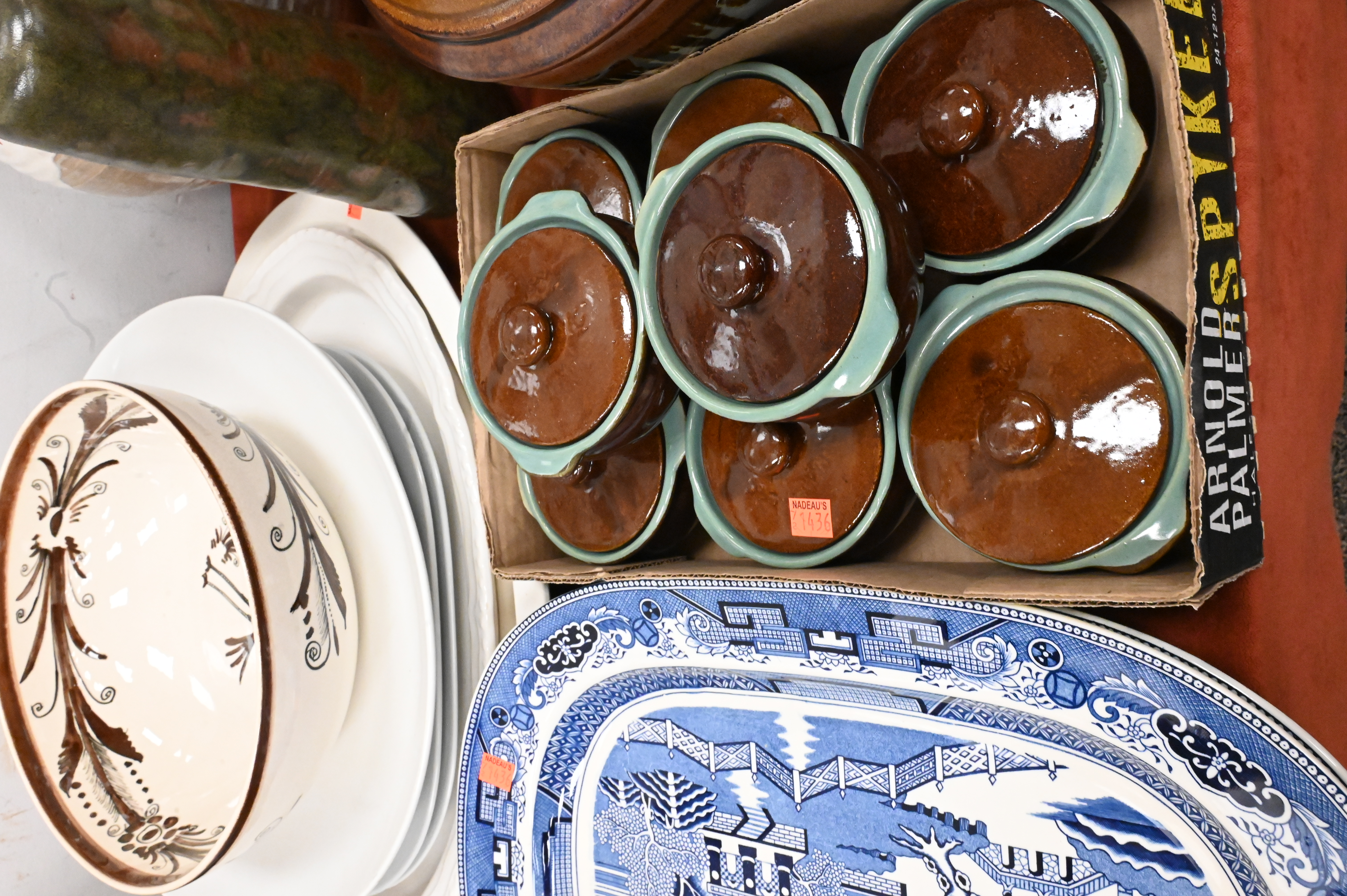 Four Tray Lots of Various Bowls, to include a Wissler Stoneware glazed jar, signed “Wissler, 71”; a porcelain covered pot, signed illegibly on the bottom; soup bowls; along with blue and white platters.