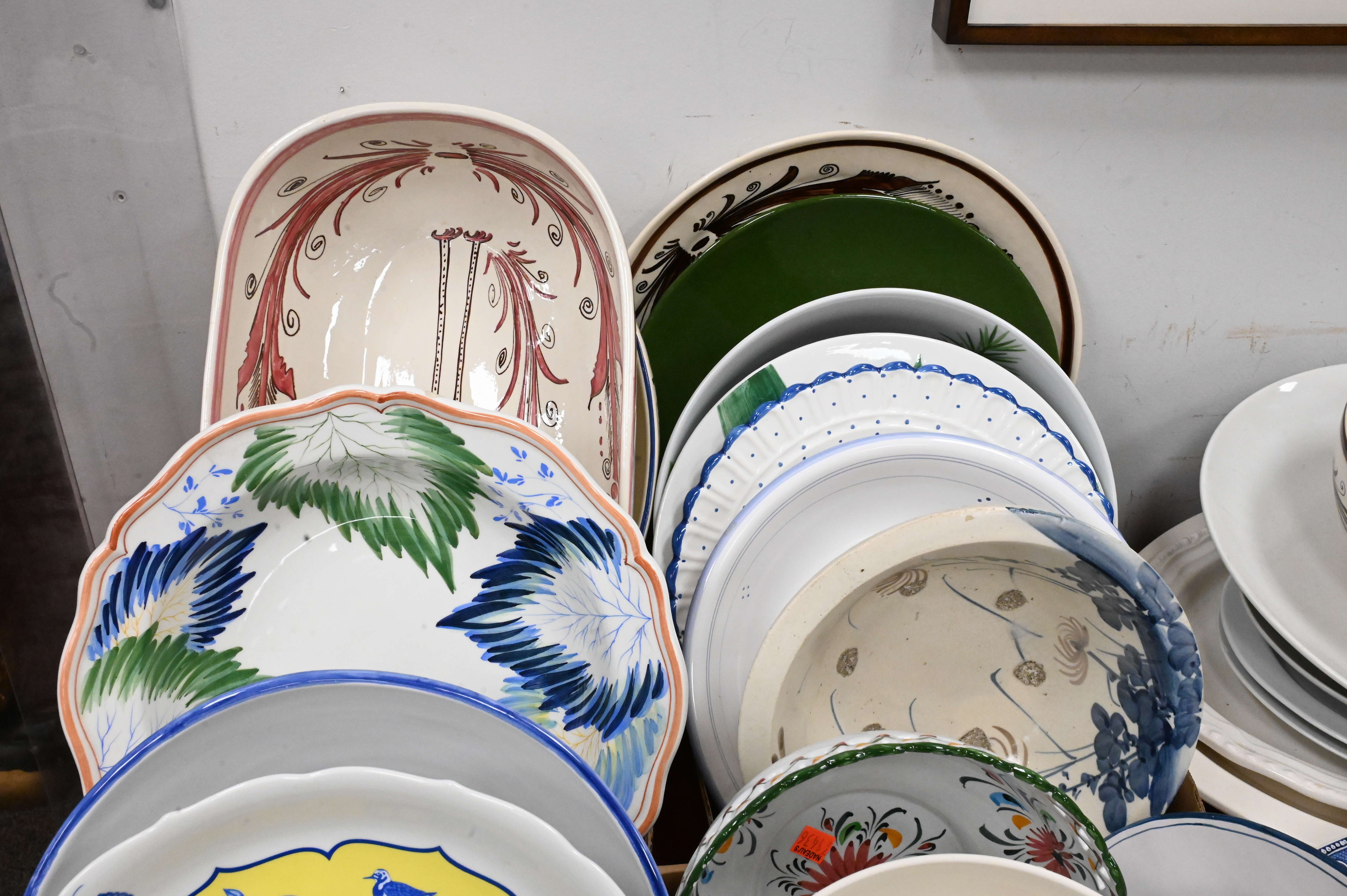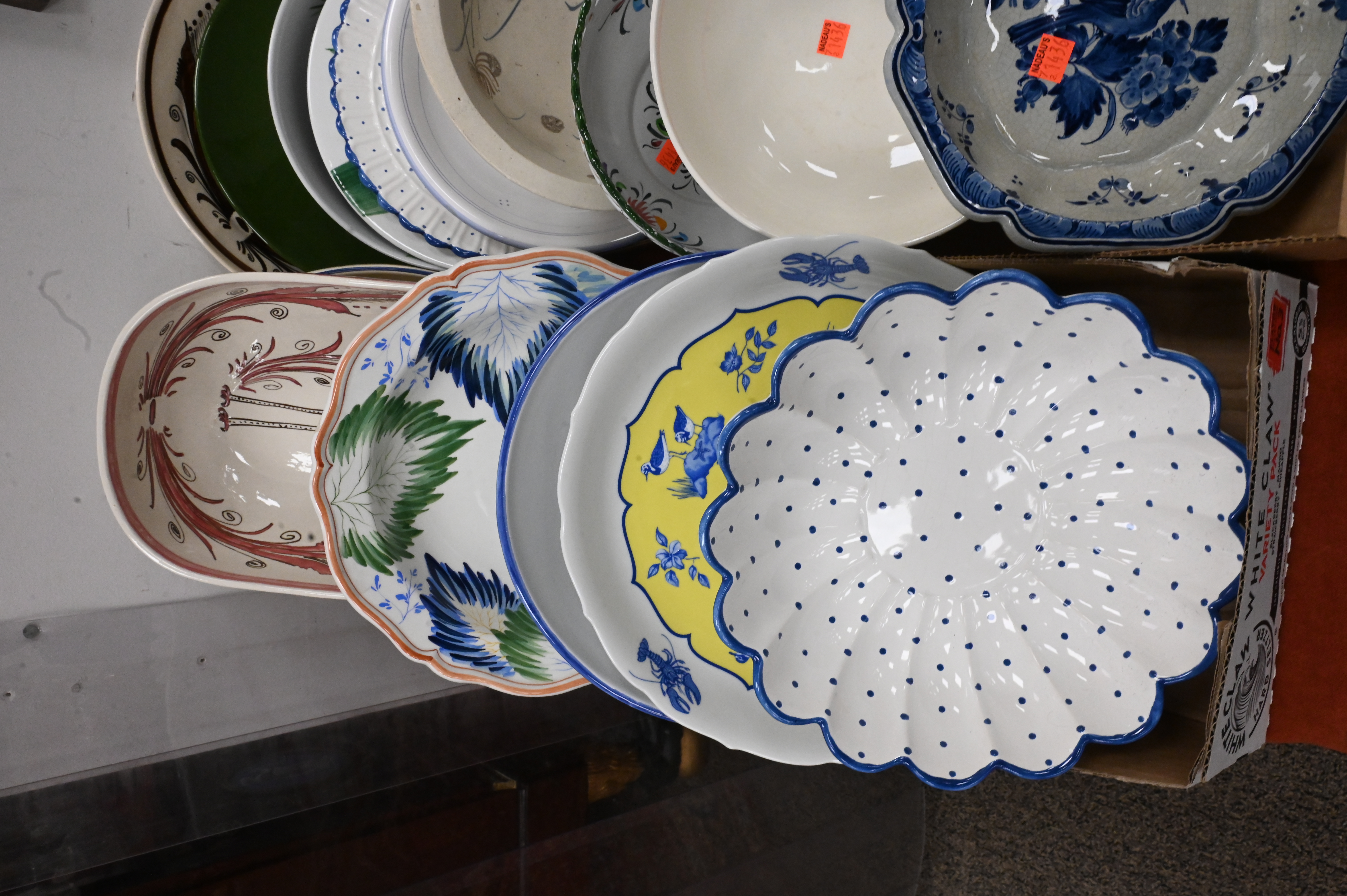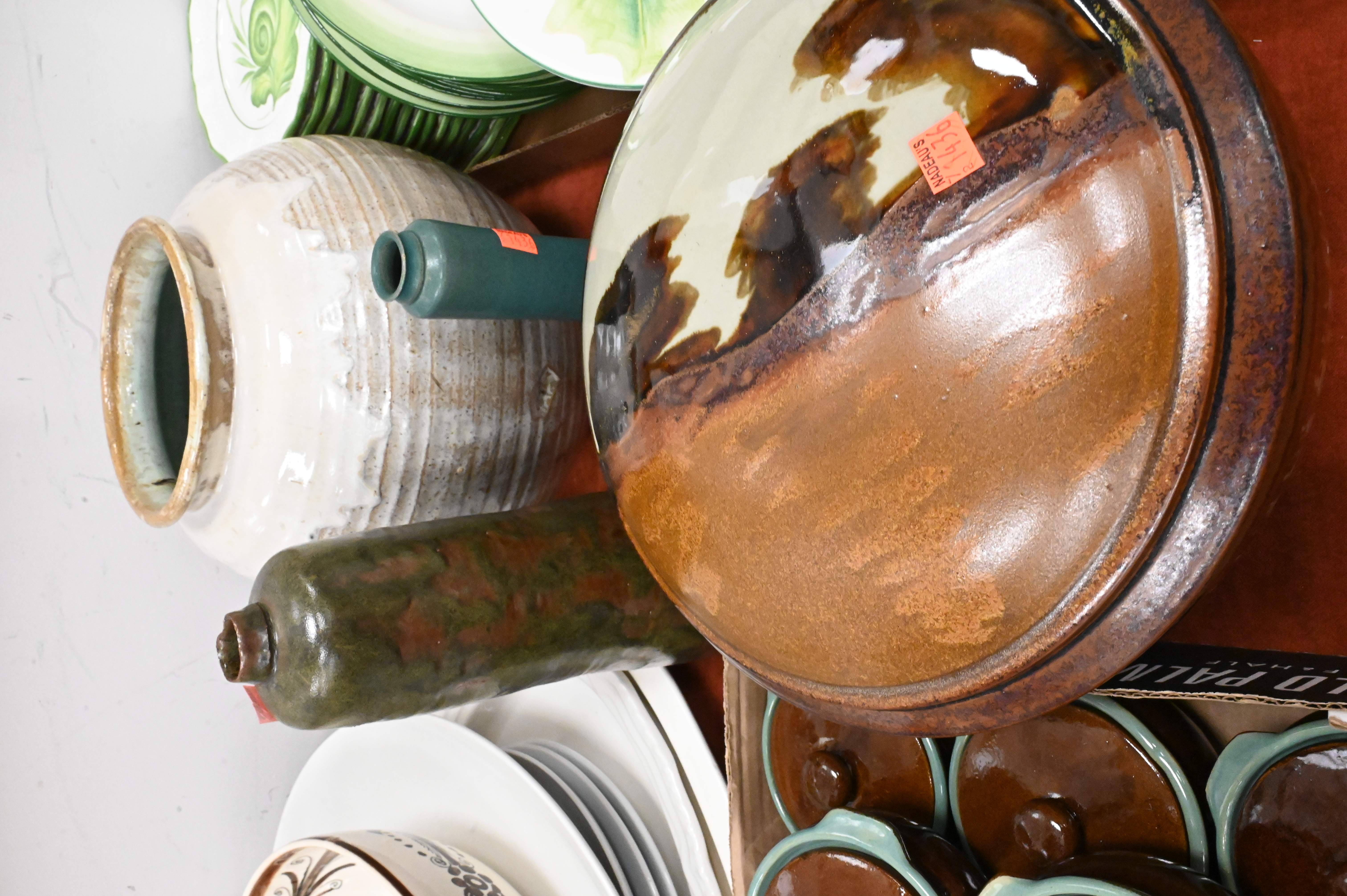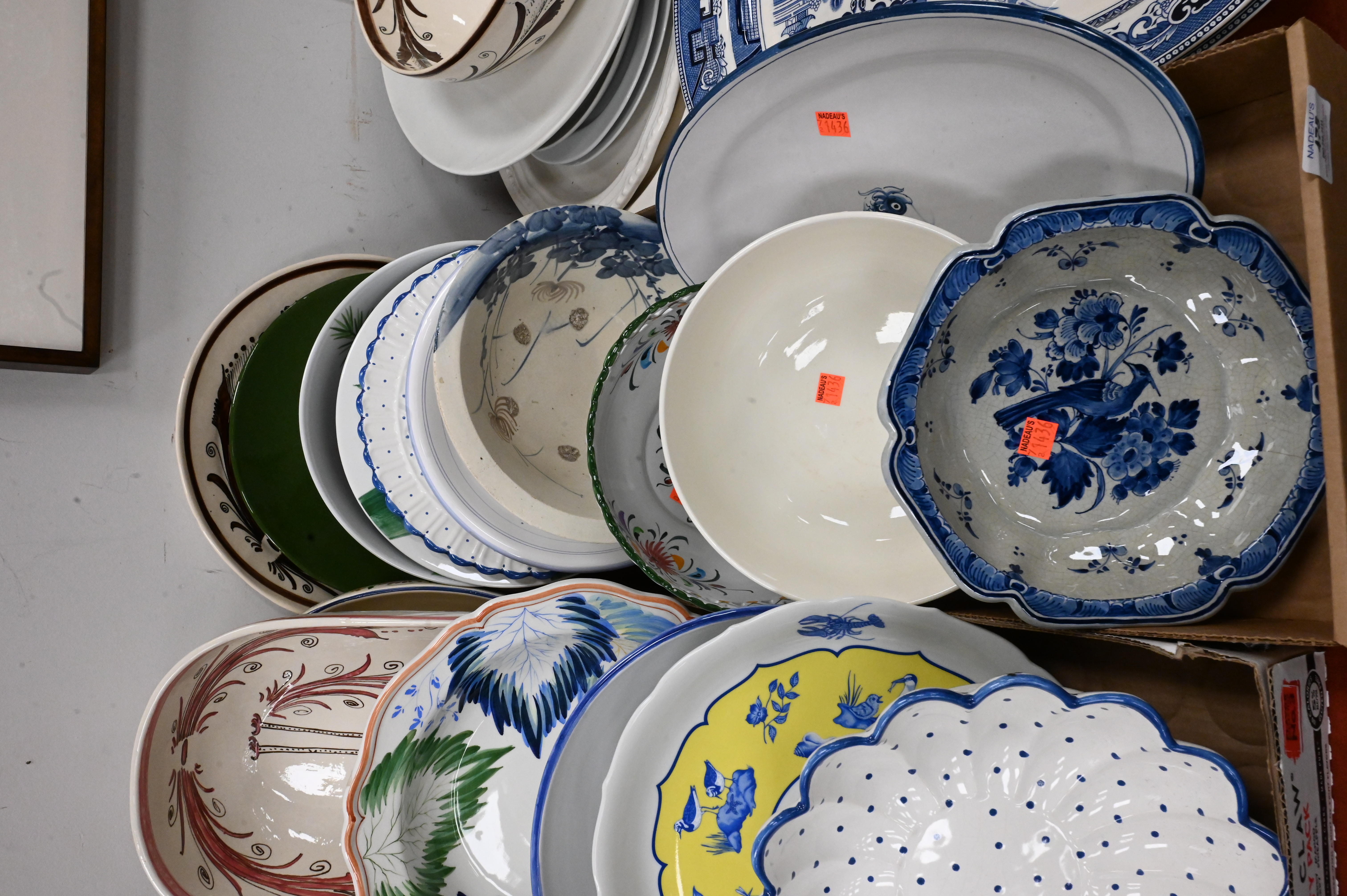 Four Tray Lots of Various Bowls, to include a Wissler Stoneware glazed jar, signed “Wissler, 71”; a porcelain covered pot, signed illegibly on the bottom; soup bowls; along with blue and white platters.