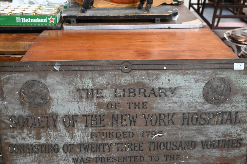 Lot 475: Gorham Bronze Enameled Plaque, The Library of the Society of the New York Hospital, founded 1796, consisting of twenty three thousand volumes, was presented to The New York Academy of Medicine, by the Board of Governors of the Society 1898, marked Gorham. 30″ x 42″