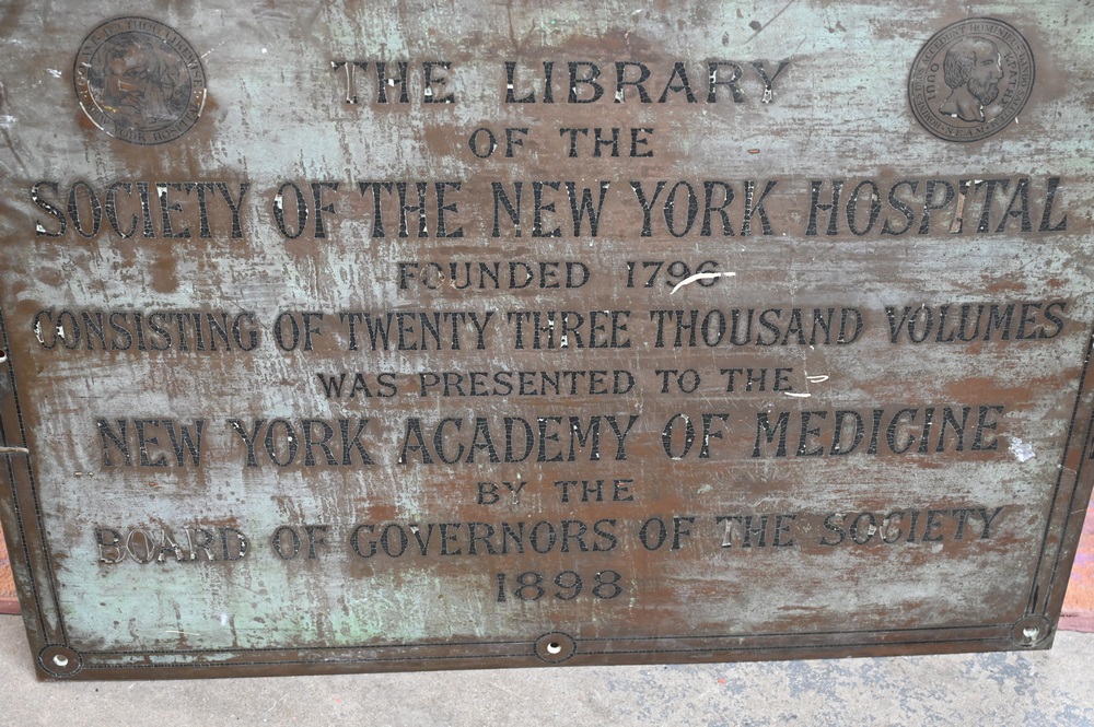 Gorham Bronze Enameled Plaque, The Library of the Society of the New York Hospital, founded 1796, consisting of twenty three thousand volumes, was presented to The New York Academy of Medicine, by the Board of Governors of the Society 1898, marked Gorham. 30″ x 42″