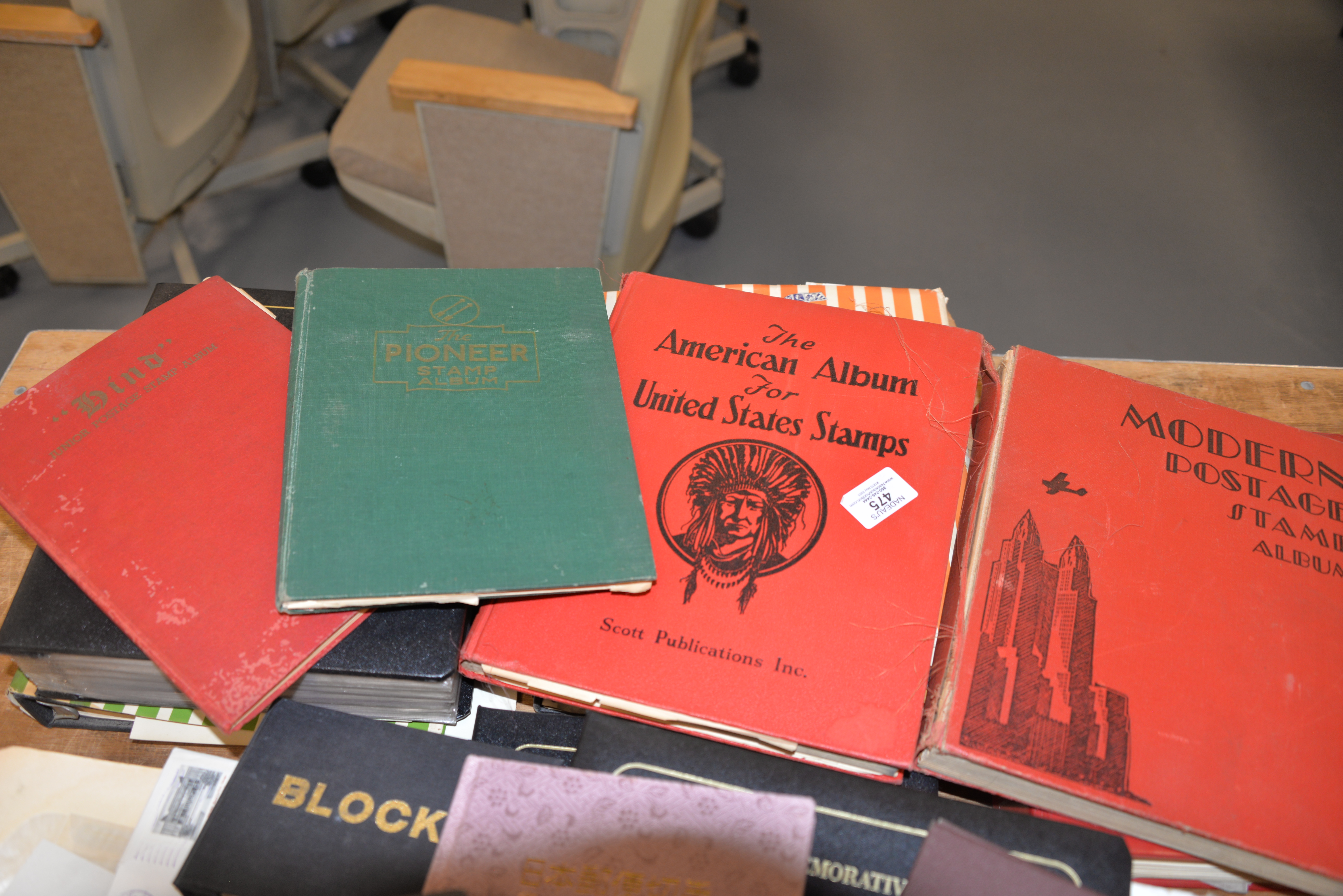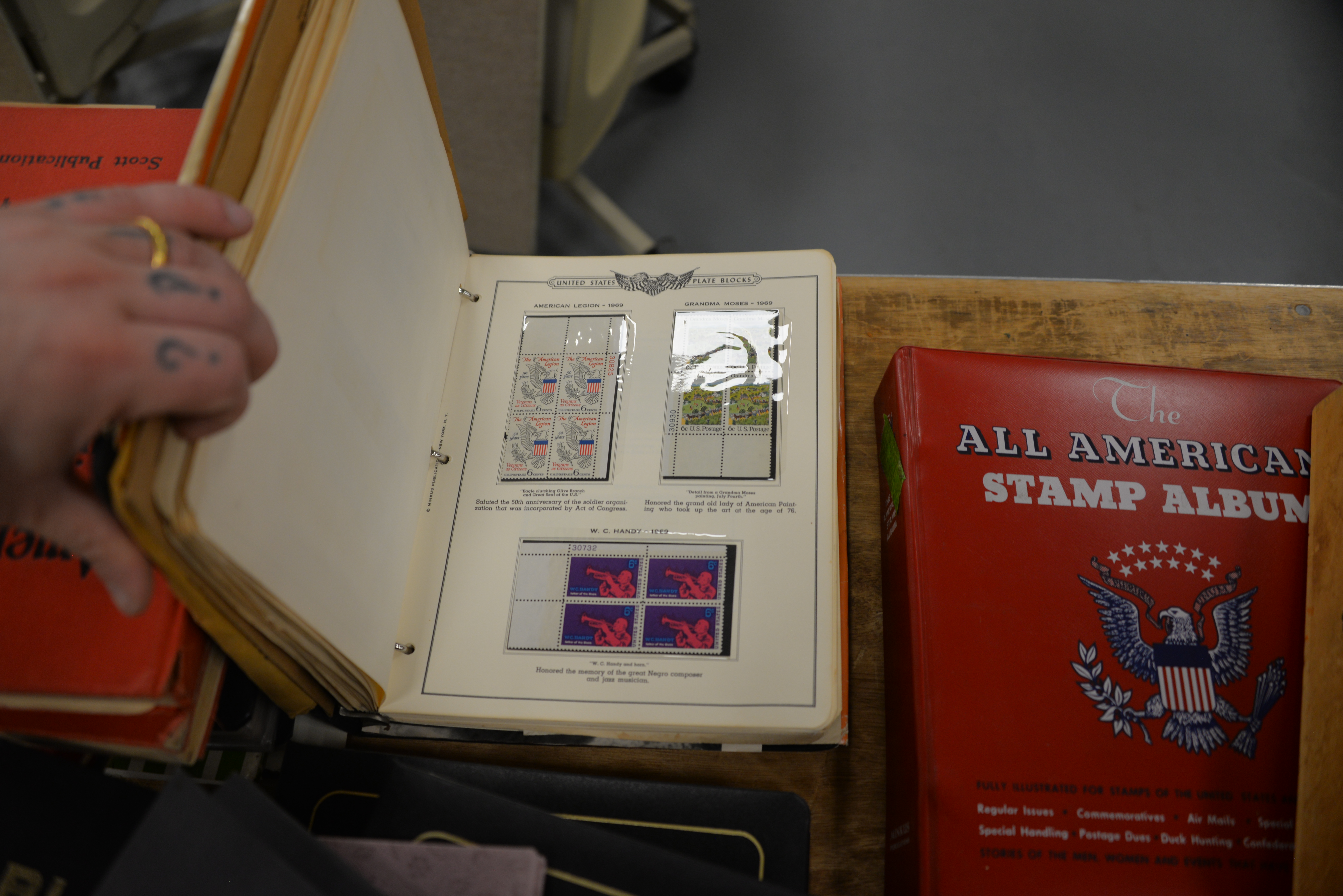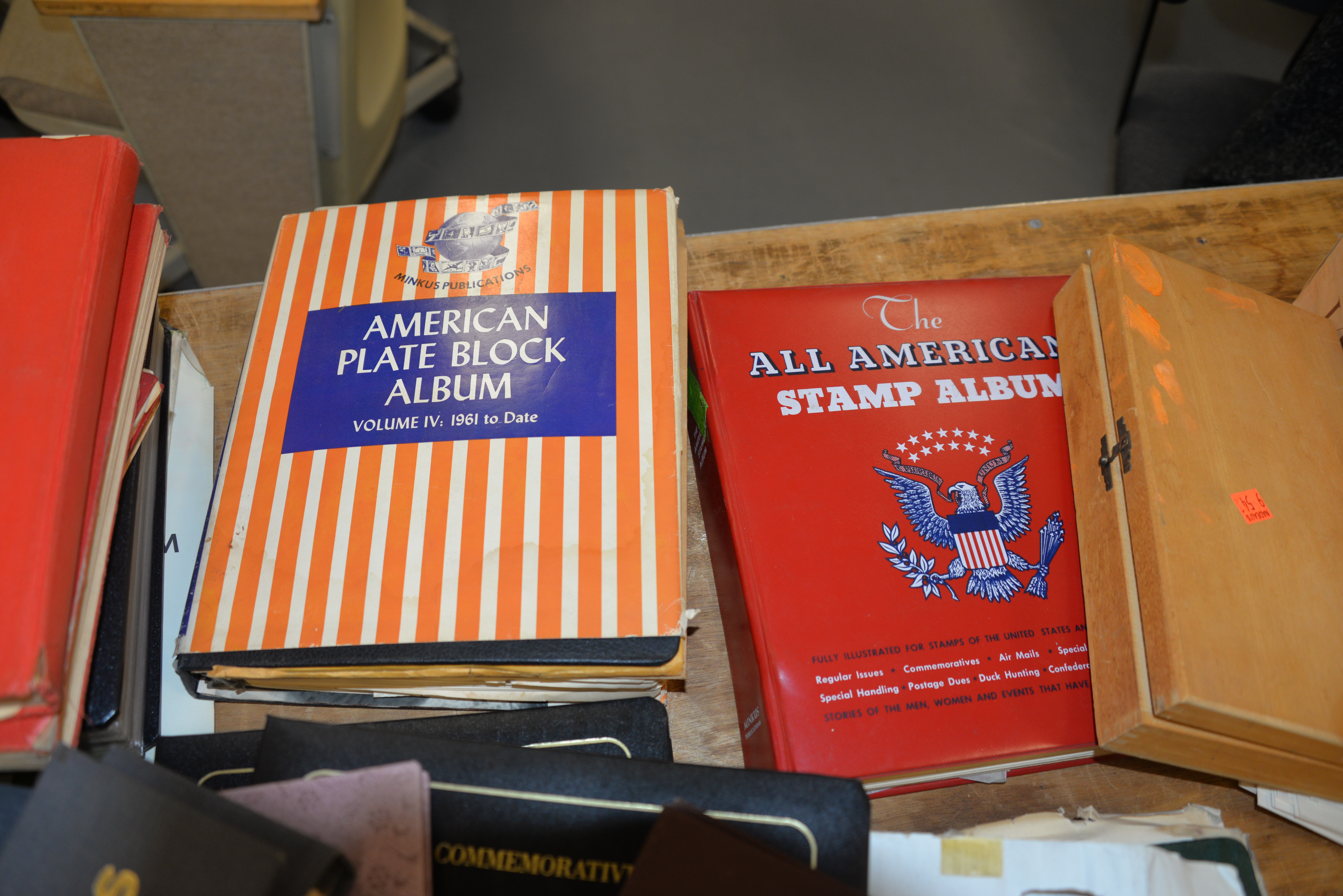 to include The American Album of United States Stamps published by Scott Publications, The All American Stamp Album, Minkus Publications, Inc., many pages filled with stamps