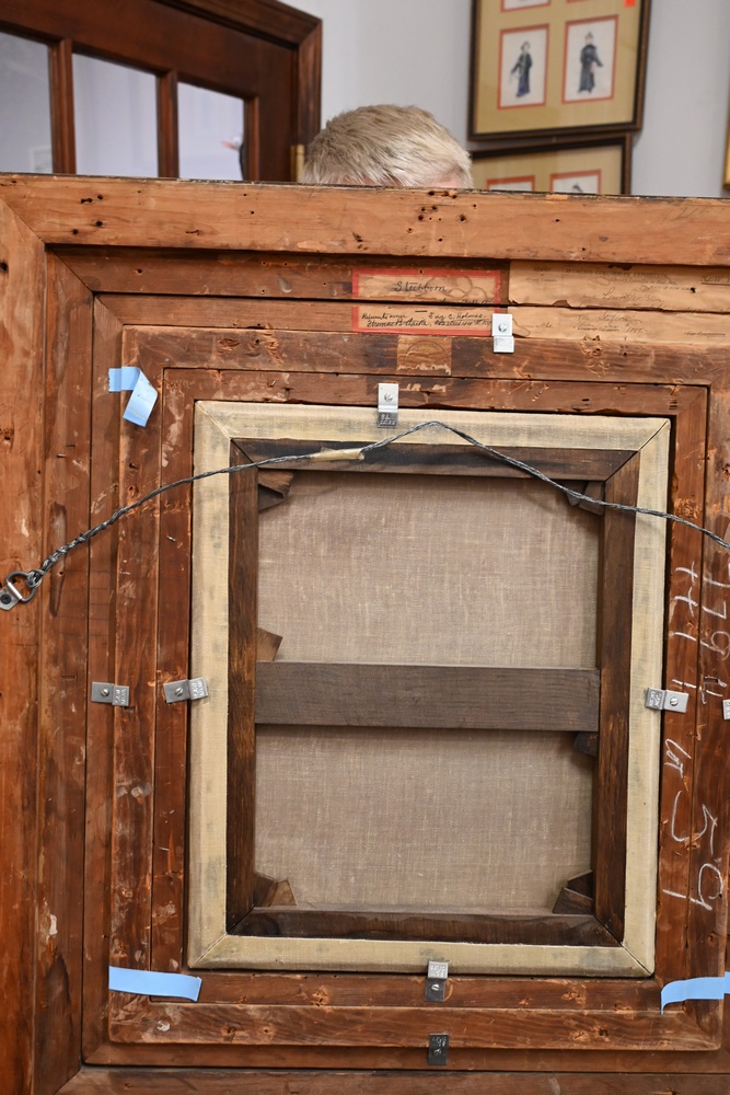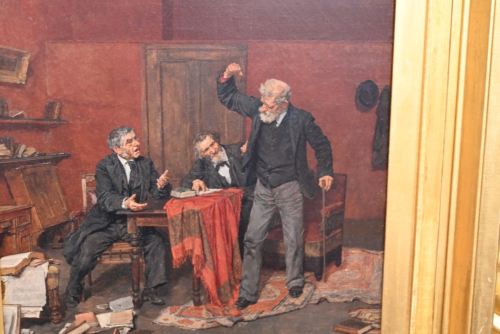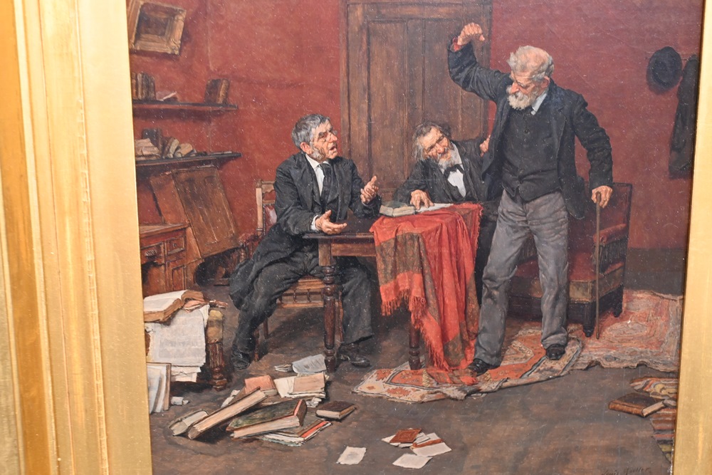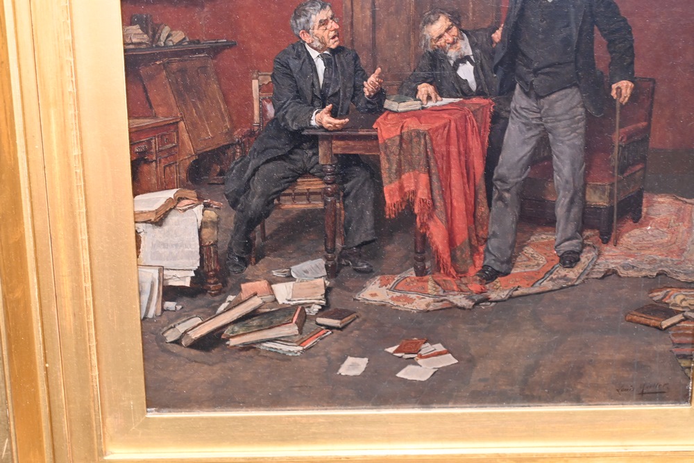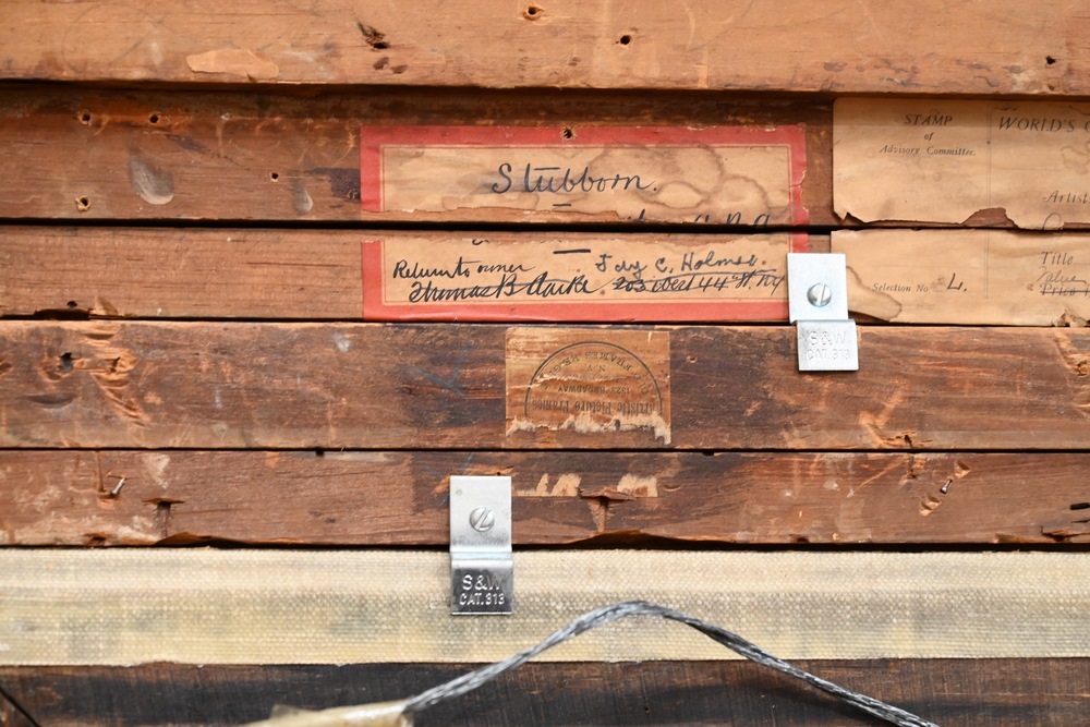 Lot 475: Louis Henry Charles Moeller American, 1855 – 1930 “Stubborn” oil on relined canvas signed lower right “Louis Moeller”, titled in labels on the reverse, having an artist label and a World’s Columbian Exposition 18 1/4 x 15 inches