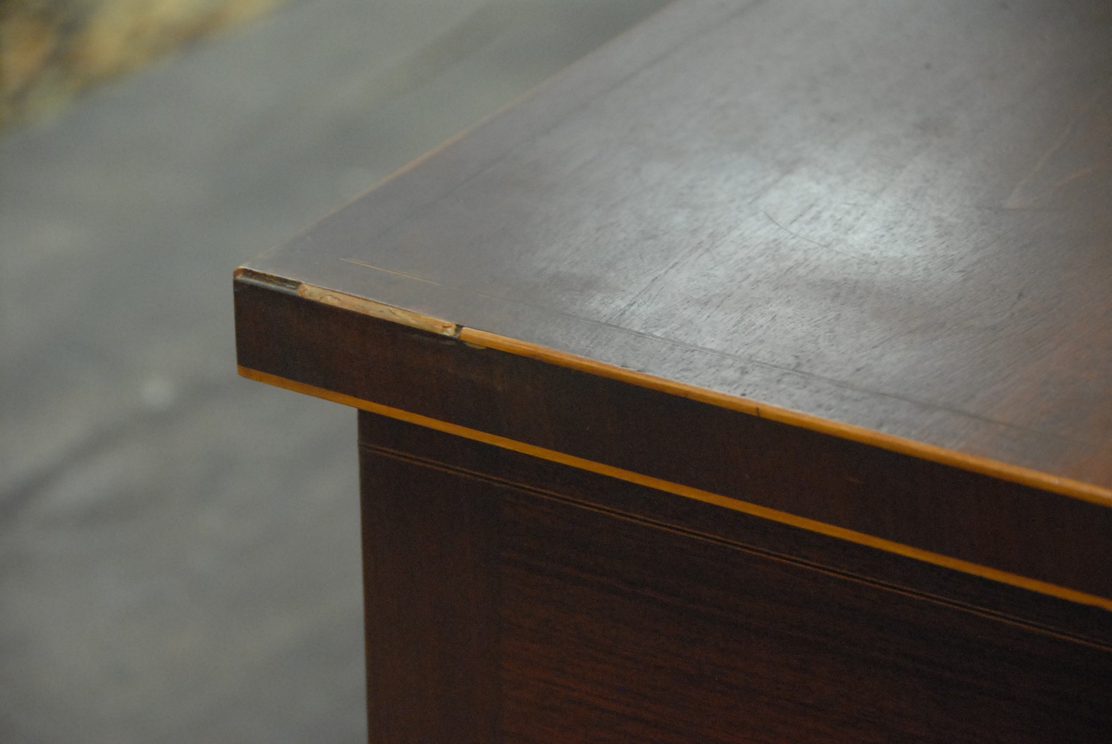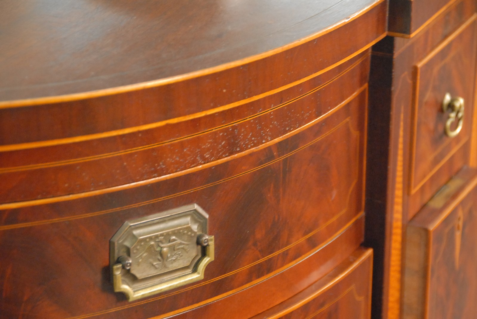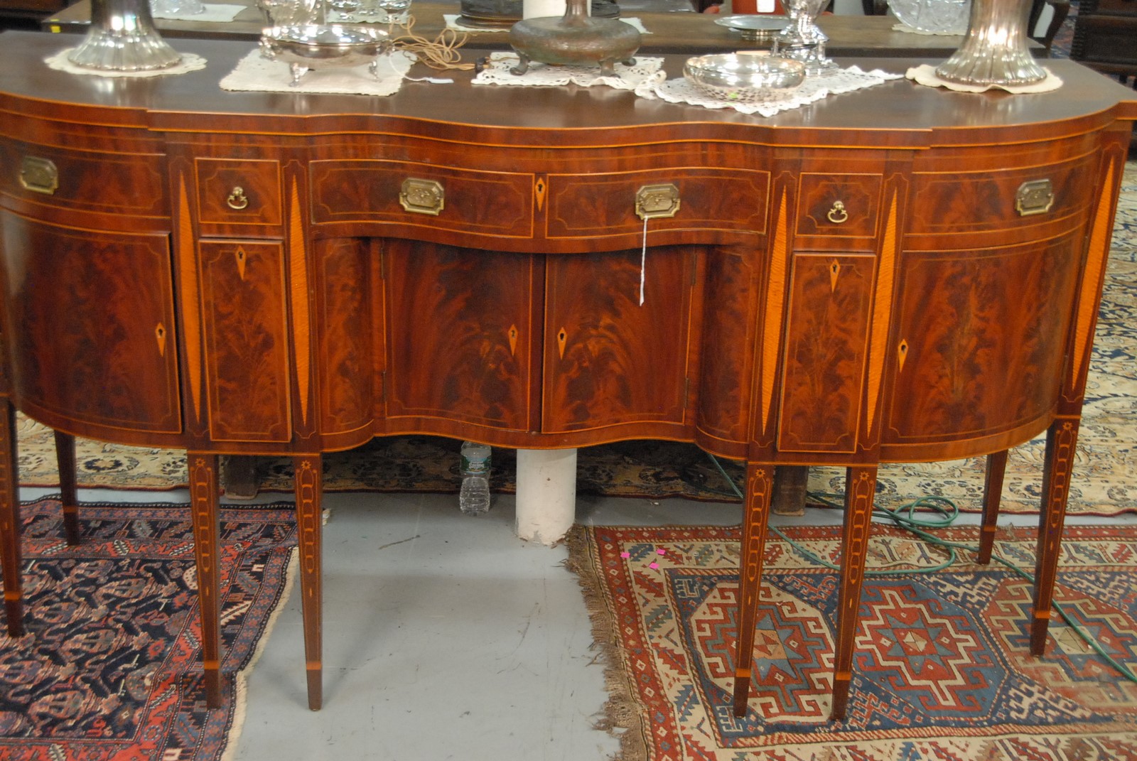 Margolis mahogany Federal style sideboard having shaped top over conforming case with serpentine top drawer over two serpentine doors all flanked by two small drawers, two bottle drawers, two drawers, and two doors, all set on square tapered legs, front with panel, diamond, circular, and line inlays. ht. 41 1/2 in. wd. 77 1/2 in. dp. 27 1/2 in.