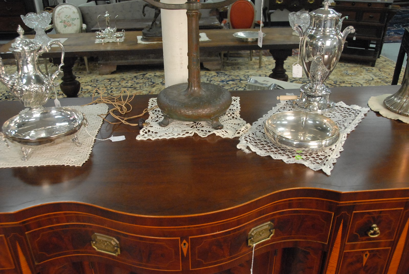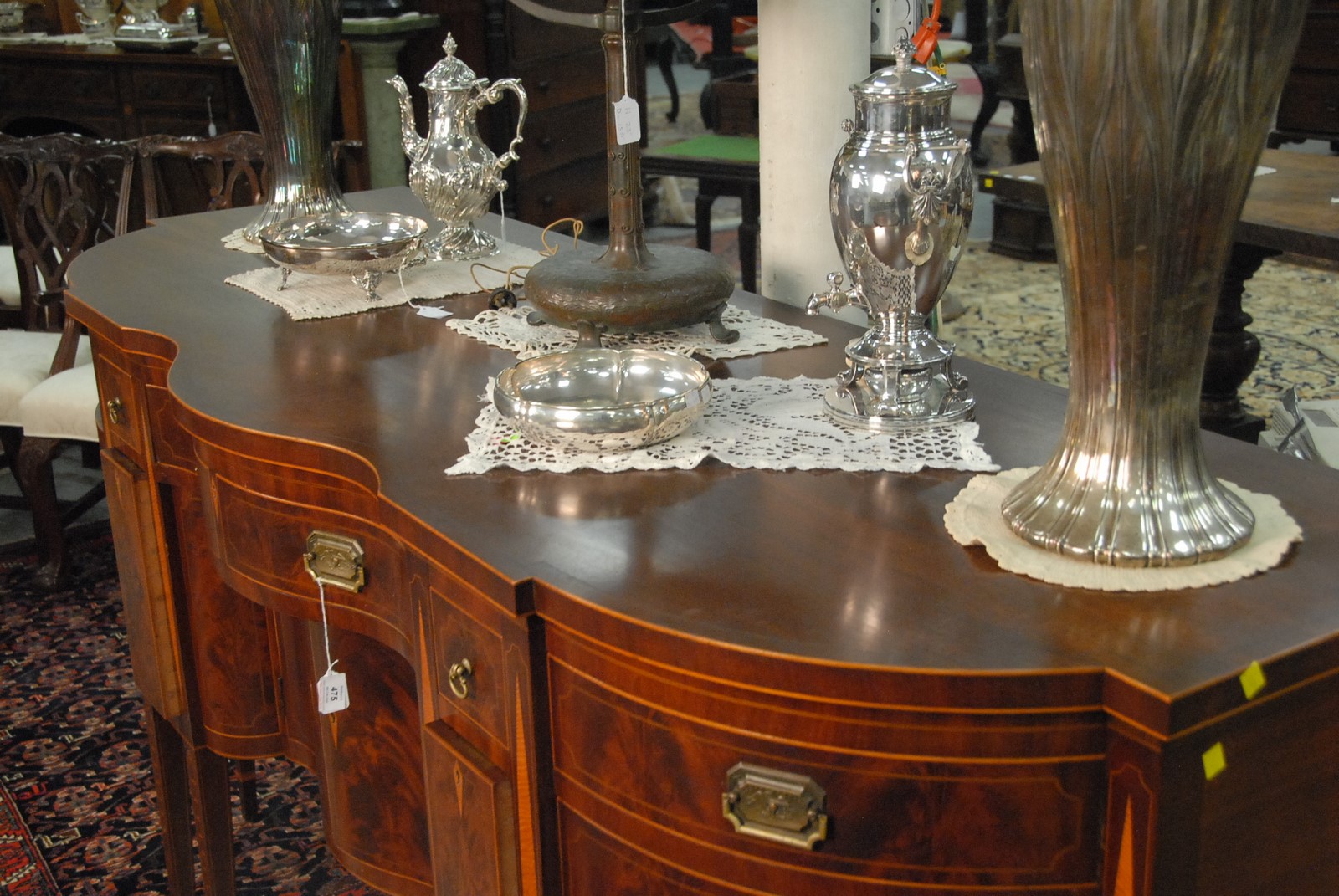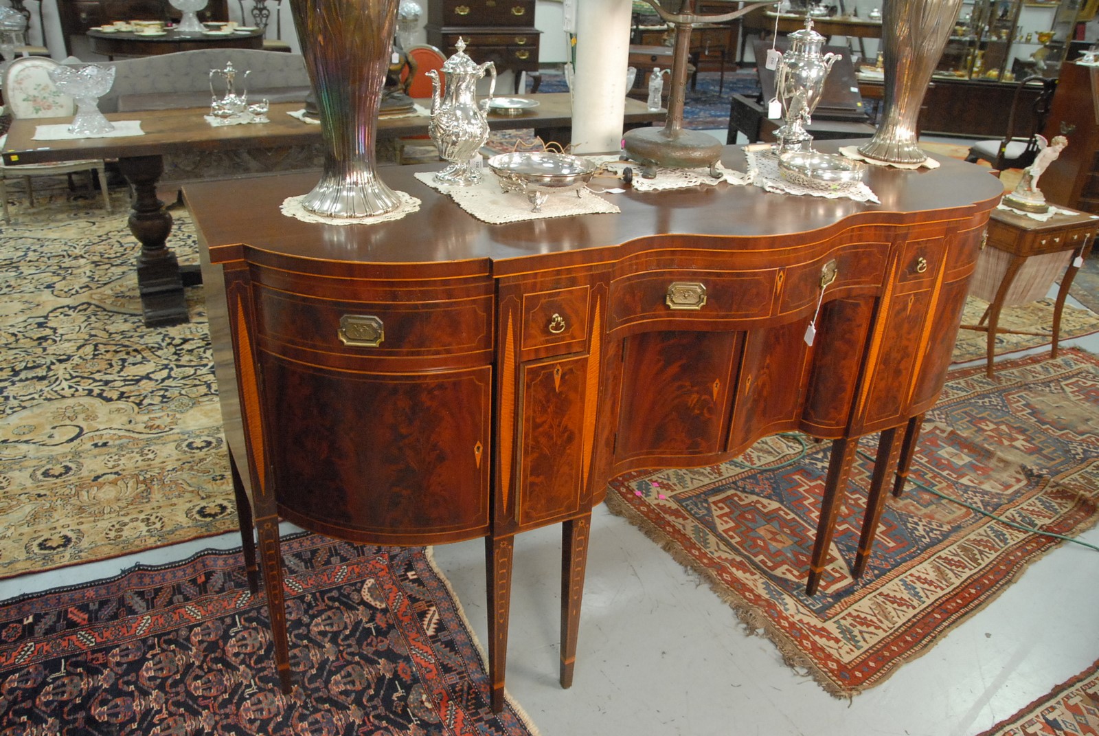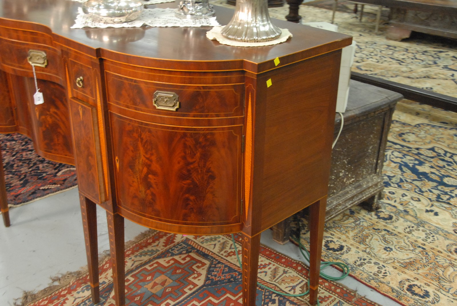 Lot 475: Margolis mahogany Federal style sideboard having shaped top over conforming case with serpentine top drawer over two serpentine doors all flanked by two small drawers, two bottle drawers, two drawers, and two doors, all set on square tapered legs, fr