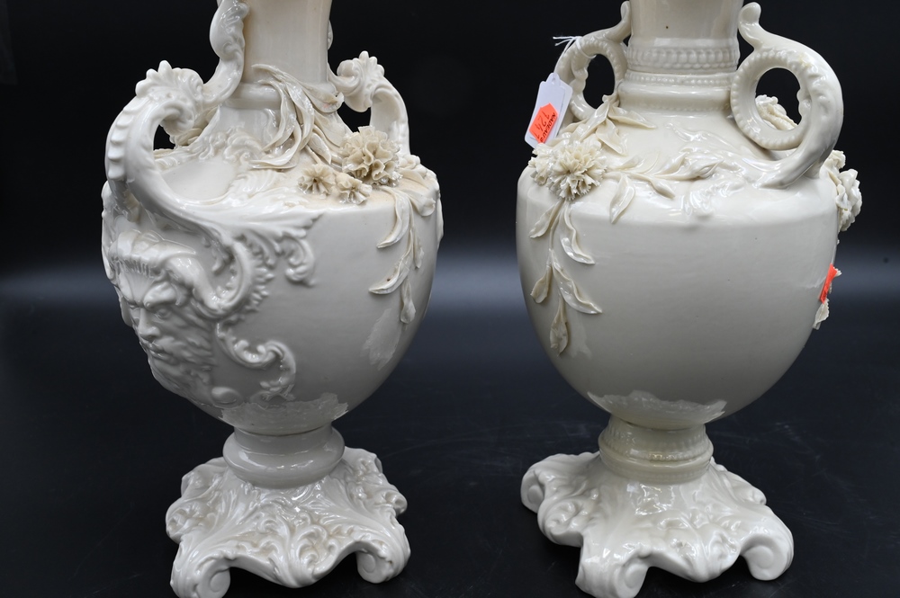 Near Pair of Belleek Rose Island Vases, encrusted with spray of roses, one having embossed mark under handle, both having black mark on bottom, height 13 inches. Provenance: Collections of Norma Reilly, New Jersey.