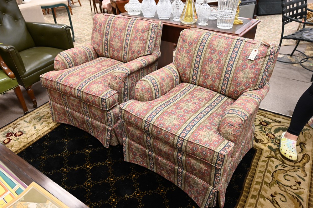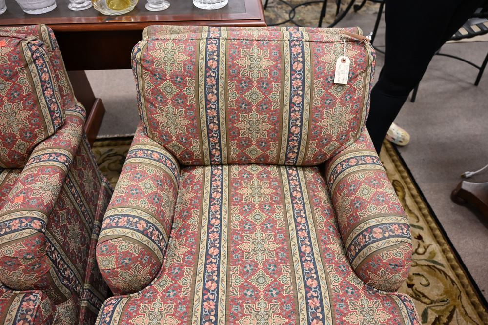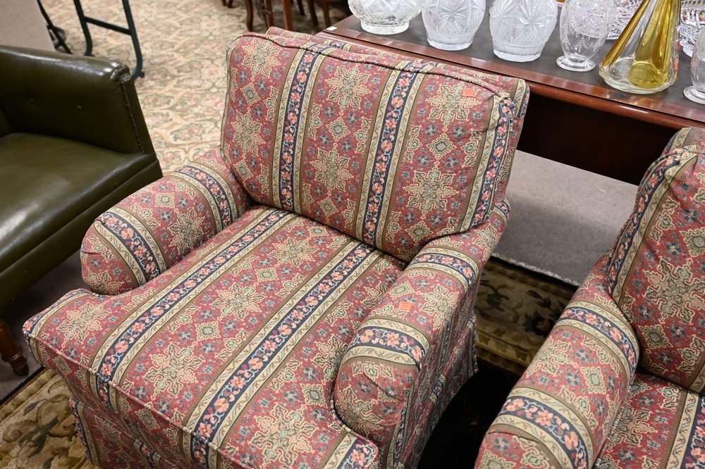Lot 475: Pair Milan Lounge Chairs by Fairfield Chair Company, in custom upholstery, height 31 inches, width 28 1/2 inches.