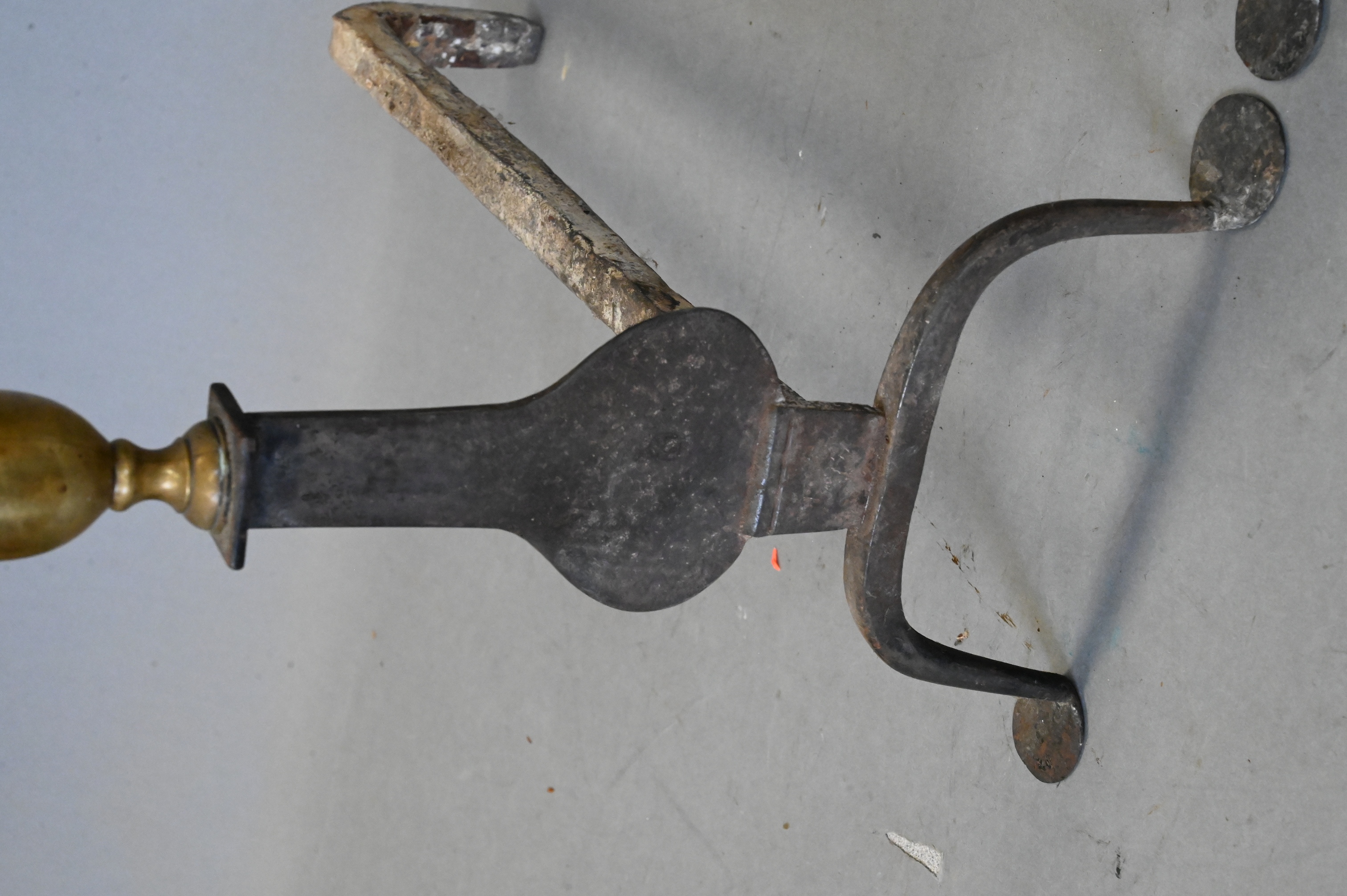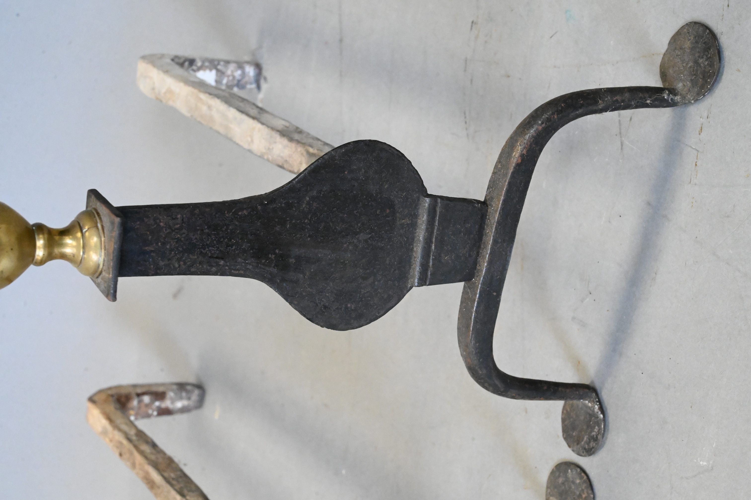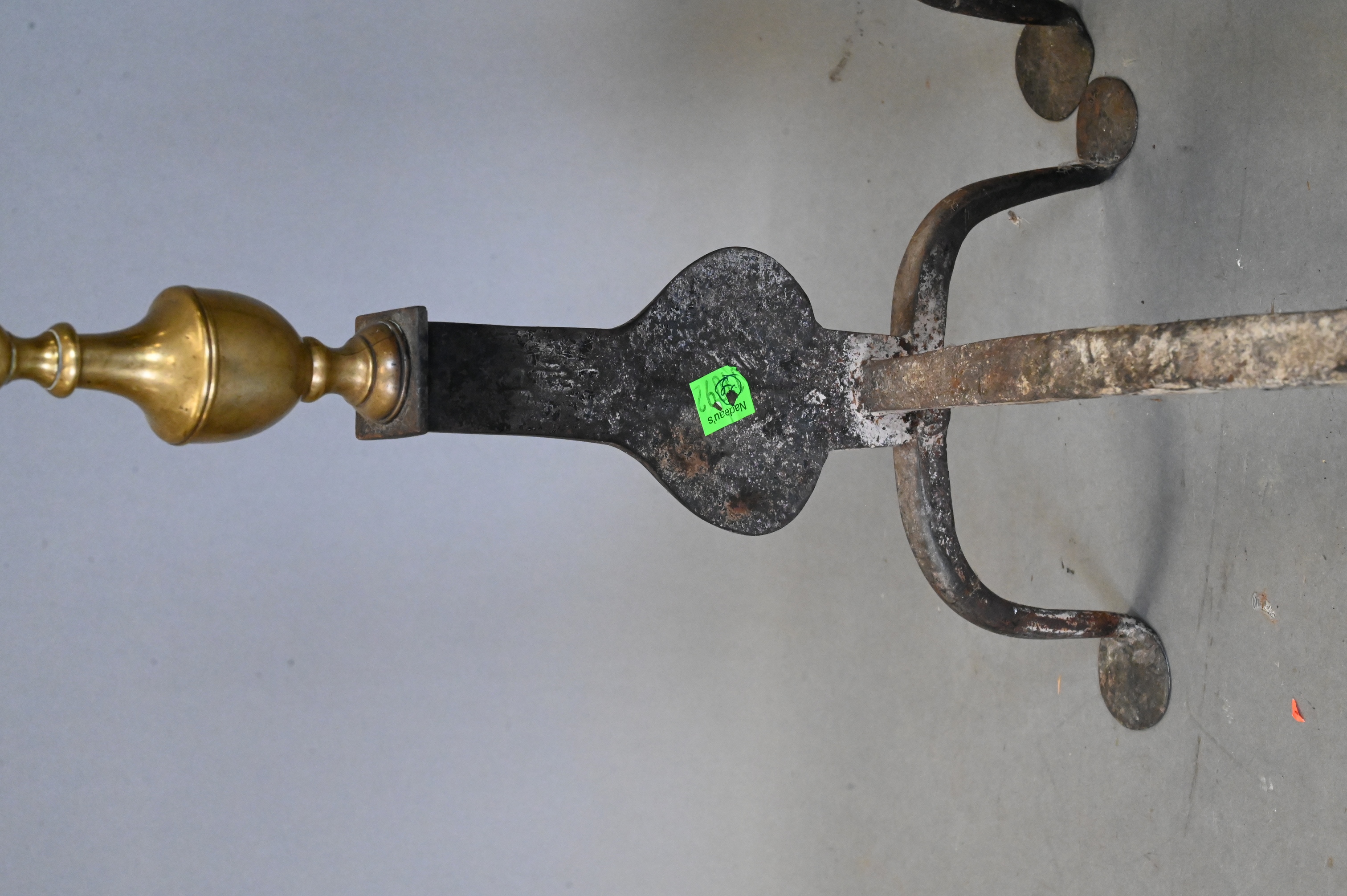 Each with baluster-turned brass finial over a wrought iron upright and log support, raised on arched legs with penny feet. Early 19th century