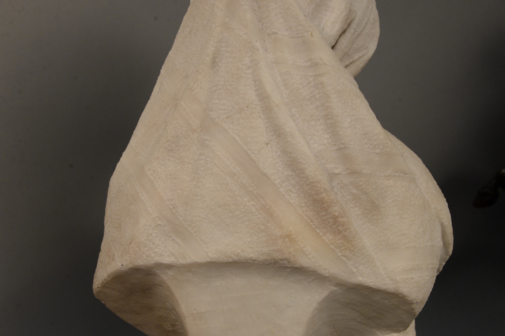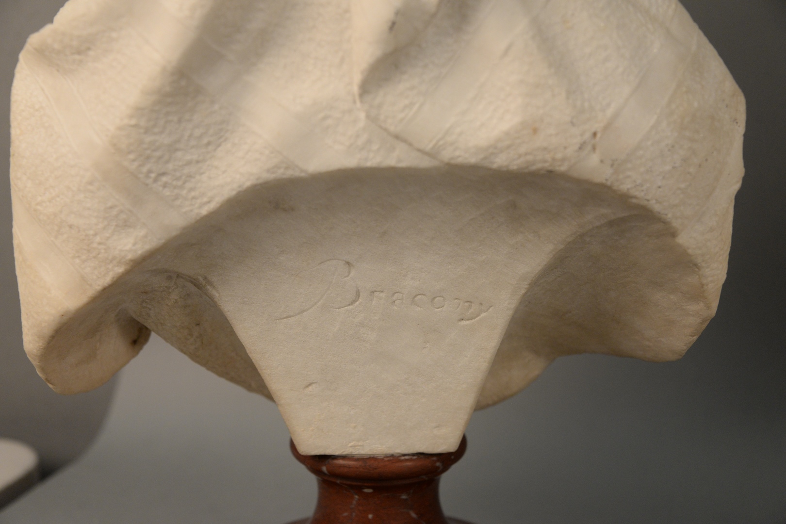 Pair of Leopold Bracony American, 20th Century pair of busts of Tunisian Man and Woman marble and bronze inscribed verso of male figure Bracony heights: 22 inches and 21 inches Provenance: The Estate of Gloria Schiff, 630 Park Avenue, New York