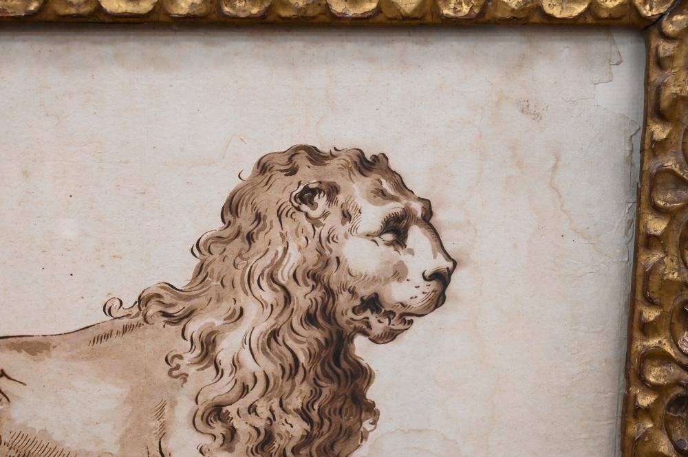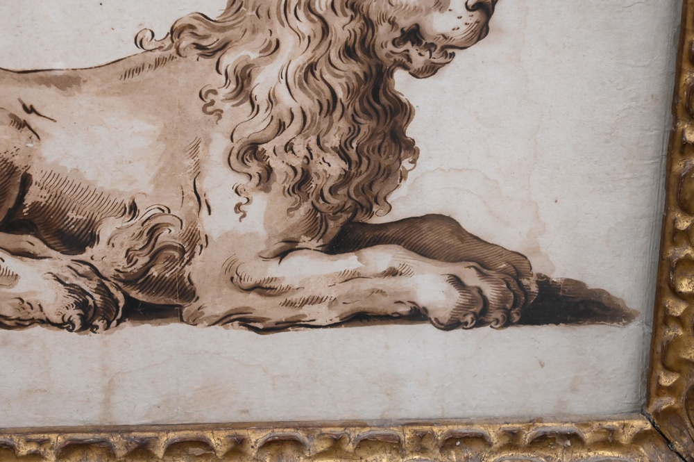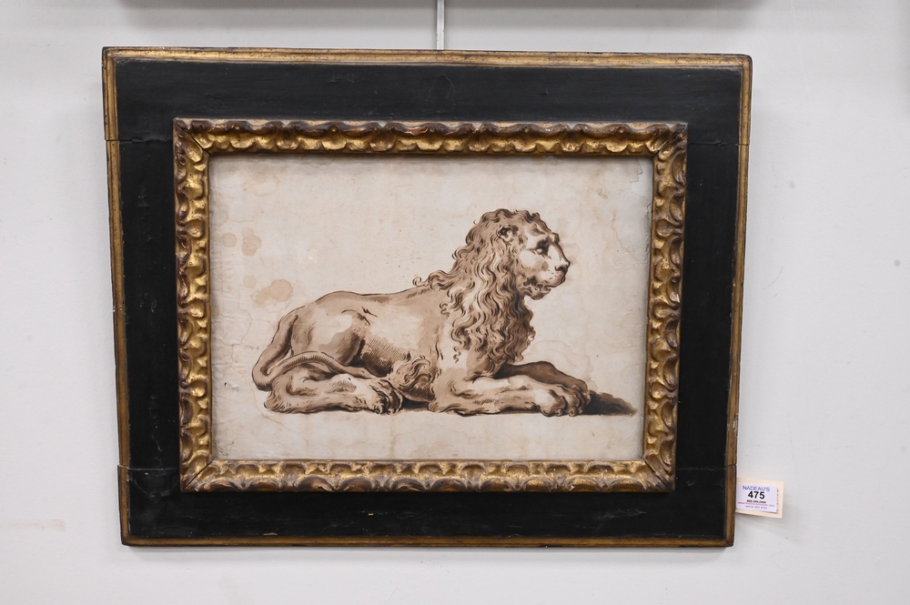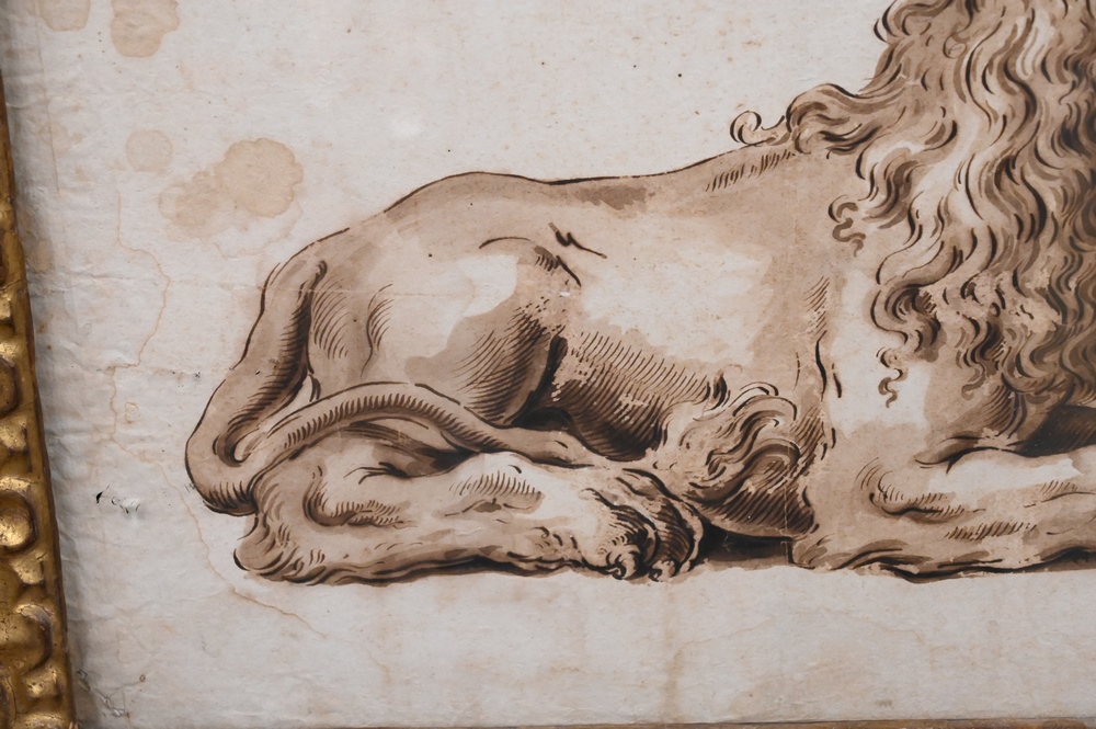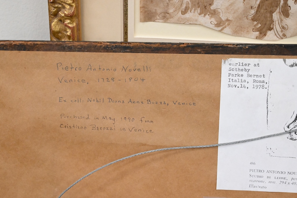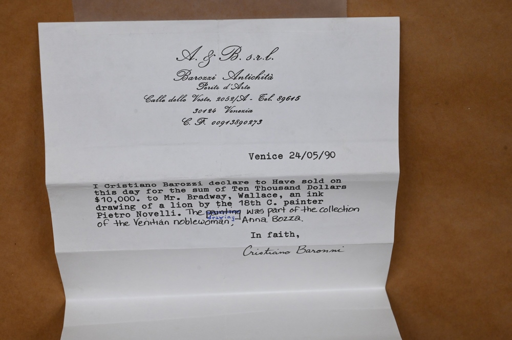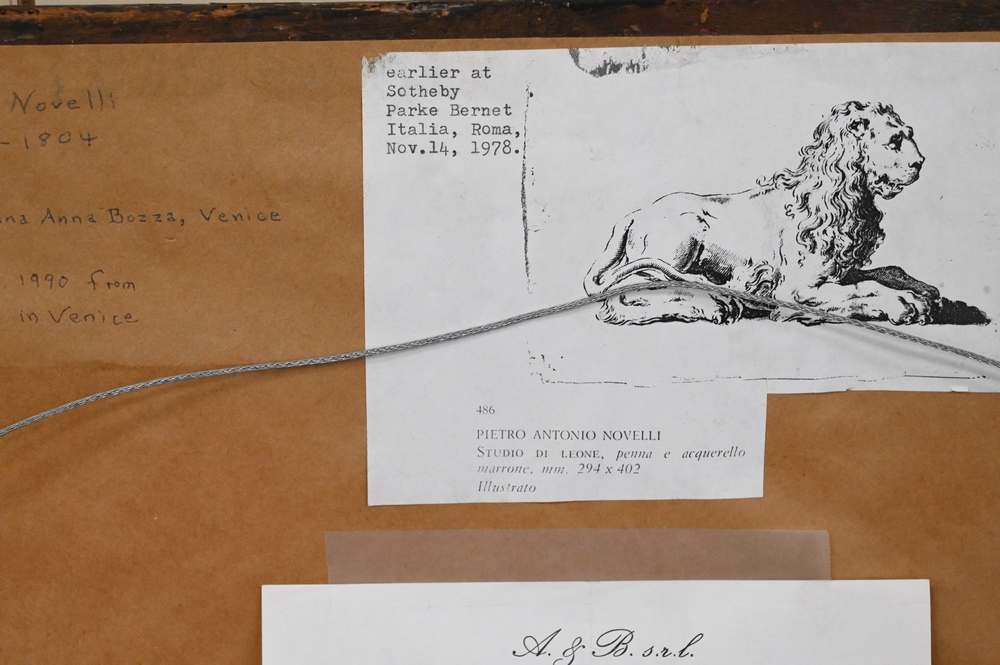 Lot 475: Pietro Antonio Novelli (Italian, 1728 – 1804), A Venetian Lion, pen and brown ink with brown wash, sight size 10 7/8″ x 15 1/2″. Provenance: (From 1978 catalog), ex coll: Anna Bozza, Sotheby’s, Rome, November 14, 1978, Lot 486, purchased by Cristiano Barozzi, Venice, May 24, 1990, receipt on back. Estate of Wallace Bradway, New Haven, CT.