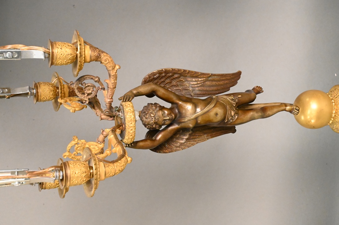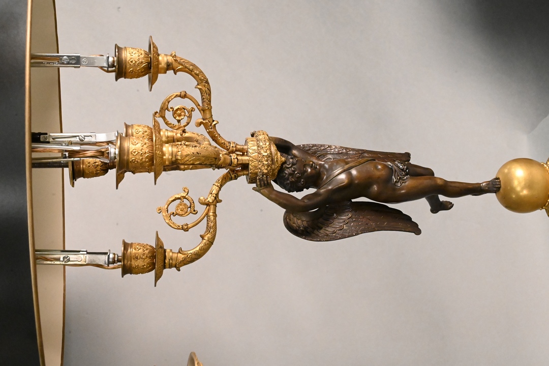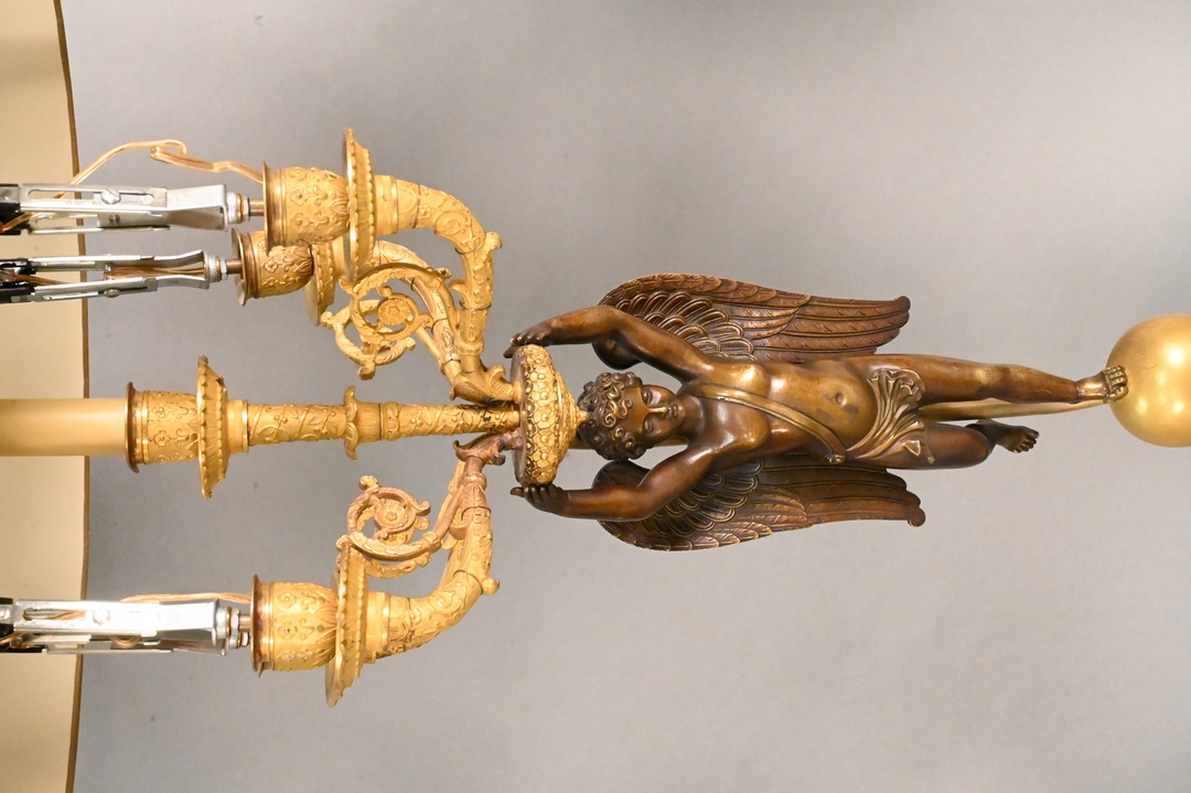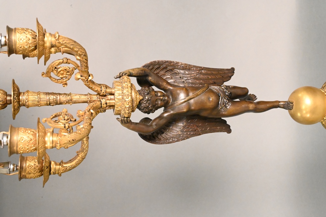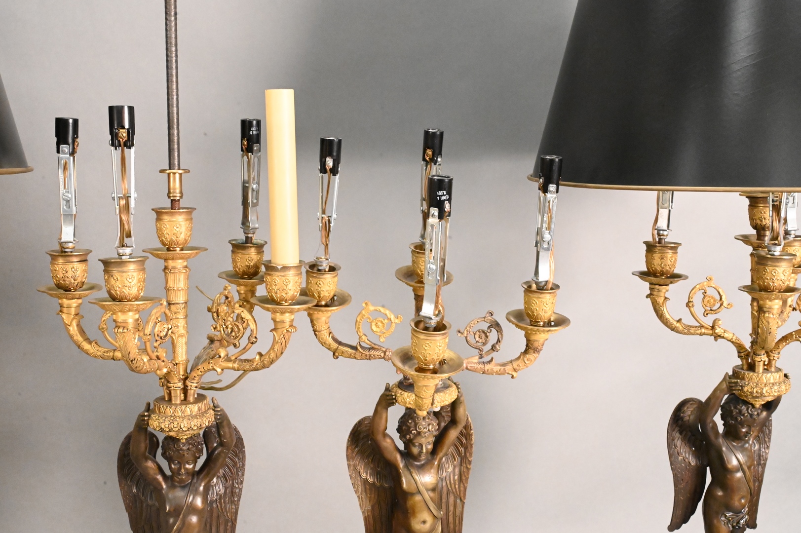 Two Similar Pairs of French Empire Ormolu and Bronze Five Light Candelabras