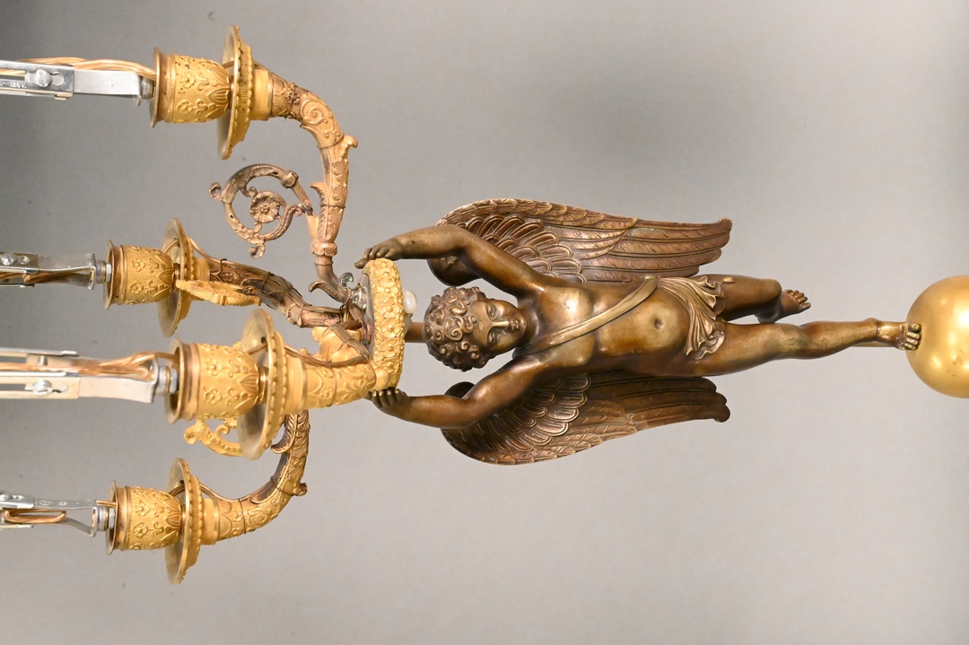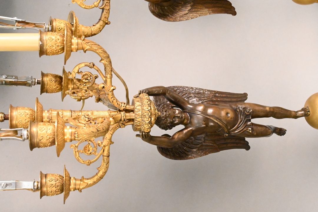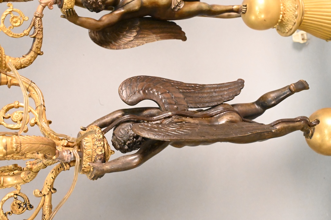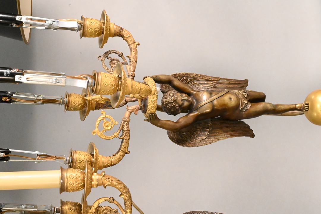 each in the form of a winged putto holding five foliate and floral molded scrolled candle arms ending in urn form sockets, supported on a sphere and a baluster-standard molded with foliage, raised on a further plinth, electrified and drilled