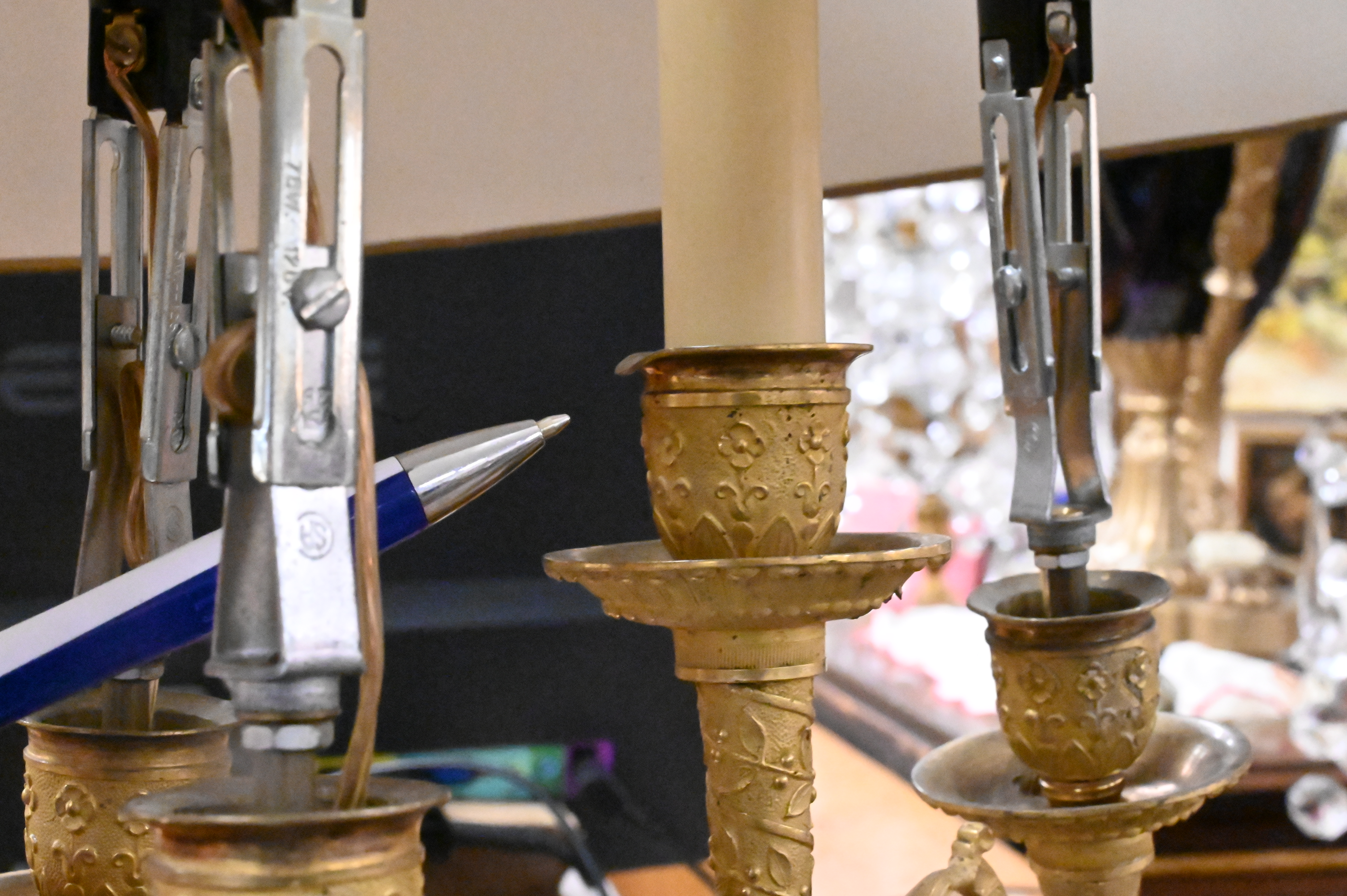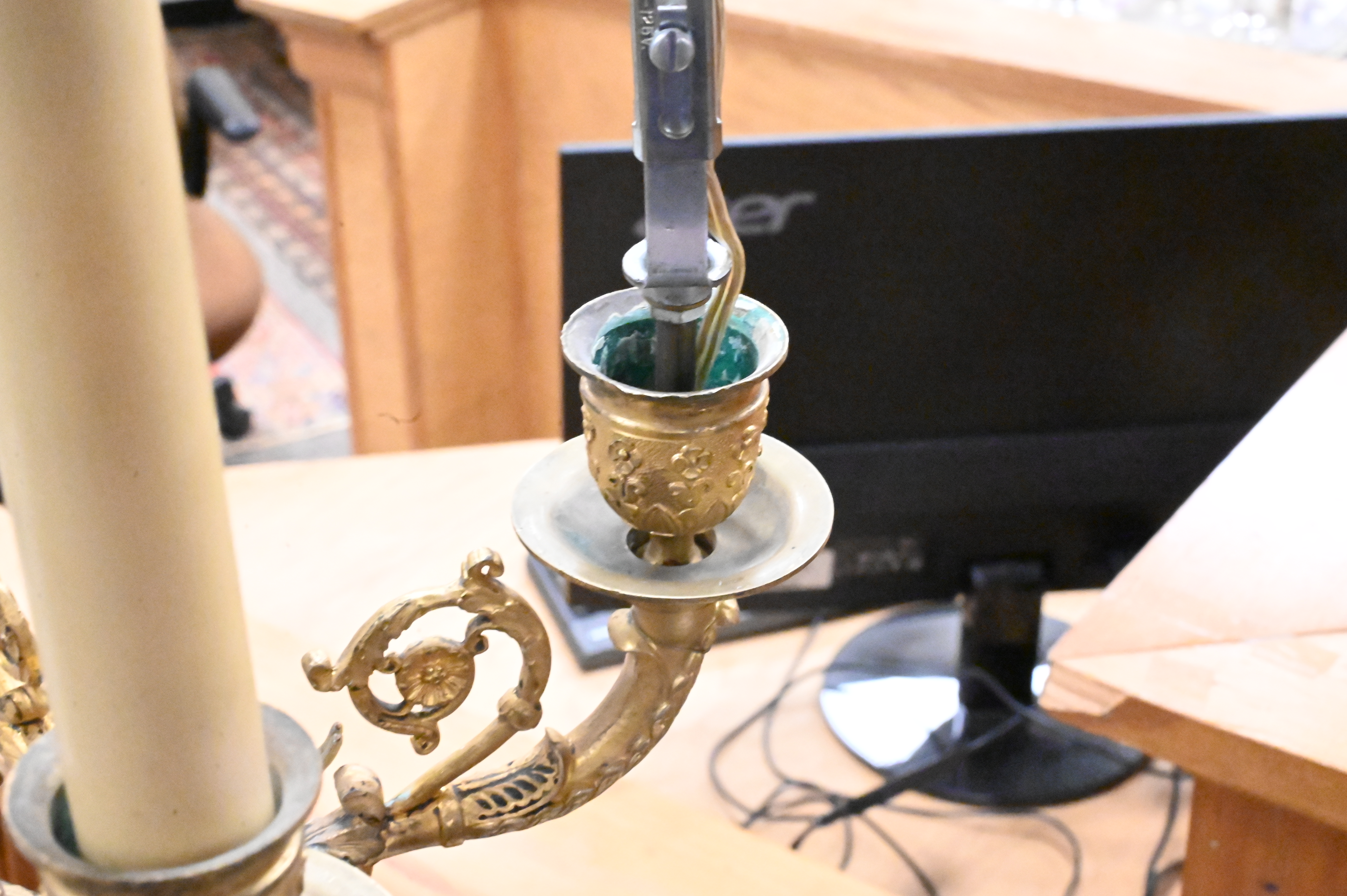 Condition: Overall fair to good condition, one candelabra partially disassembled, externally wired, rubbing, wear, losses, missing one center candle and shade holder