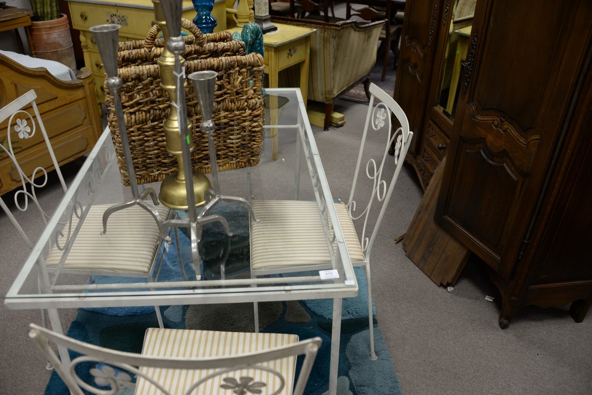 Wrought iron glass top table and four chairs. ht. 29in., top: 25 x 48