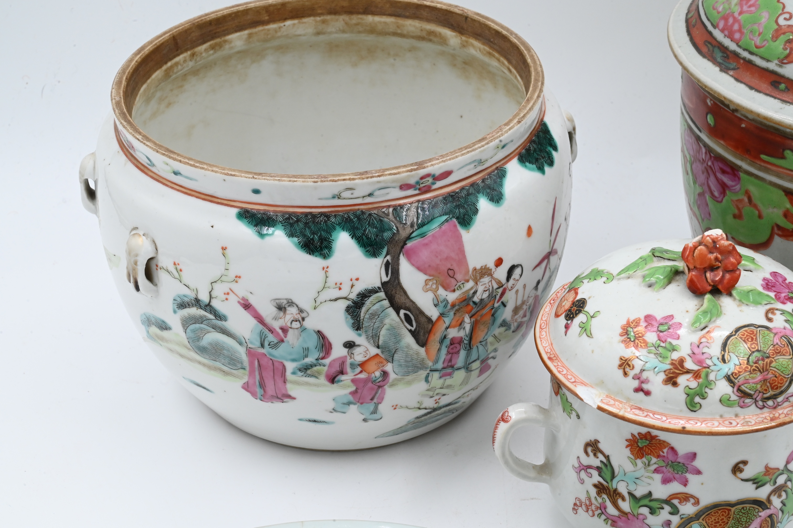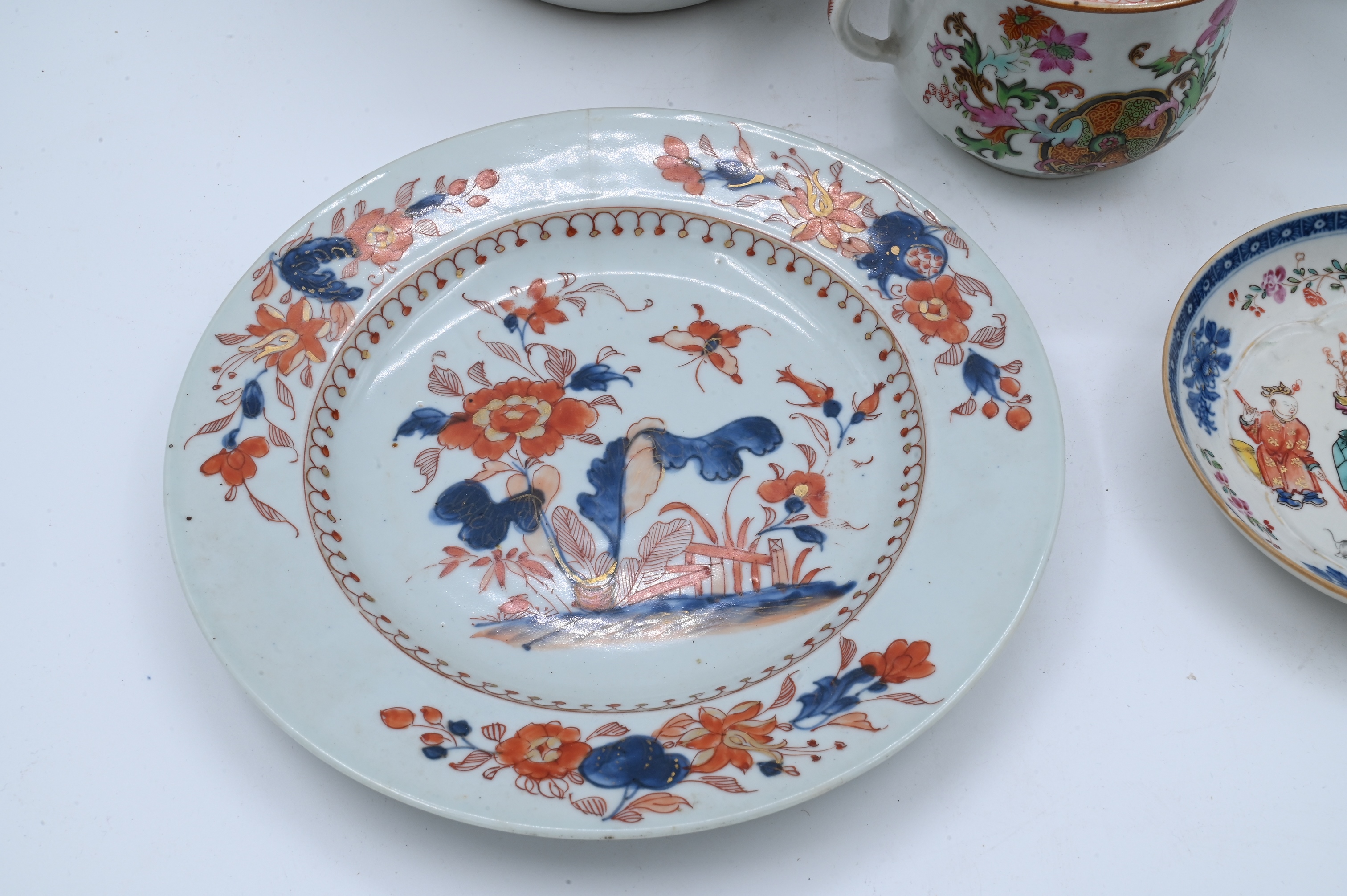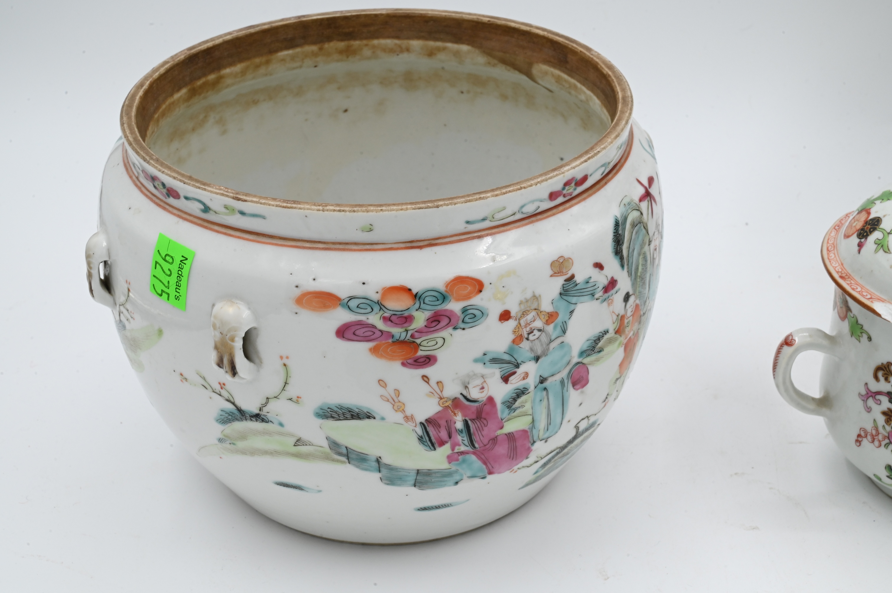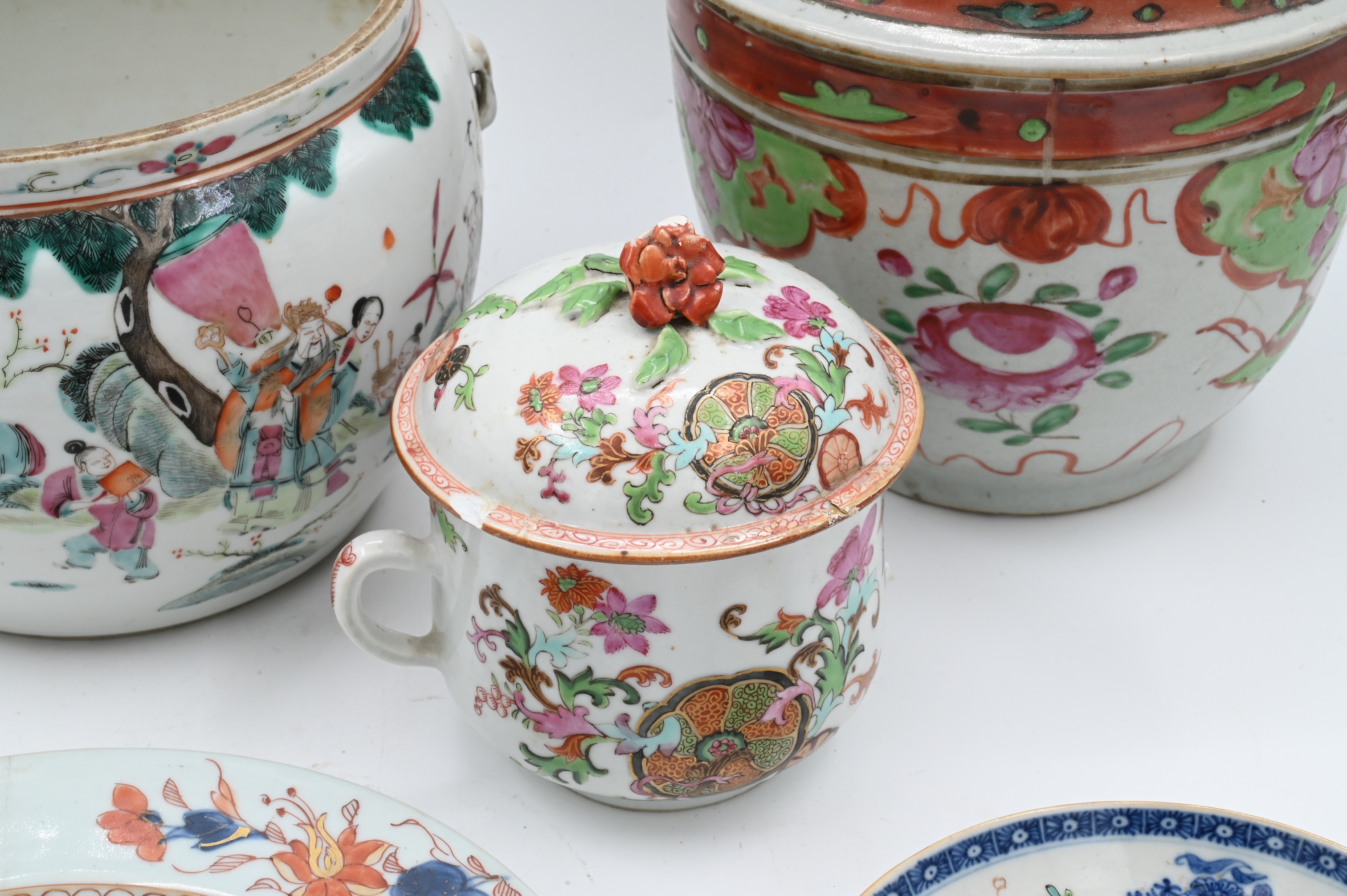 famille rose ginger pot having painted garden scene, small cache pot with cover painted with wild flowers, Chinese covered ginger pot, saucer, and an Imari plate