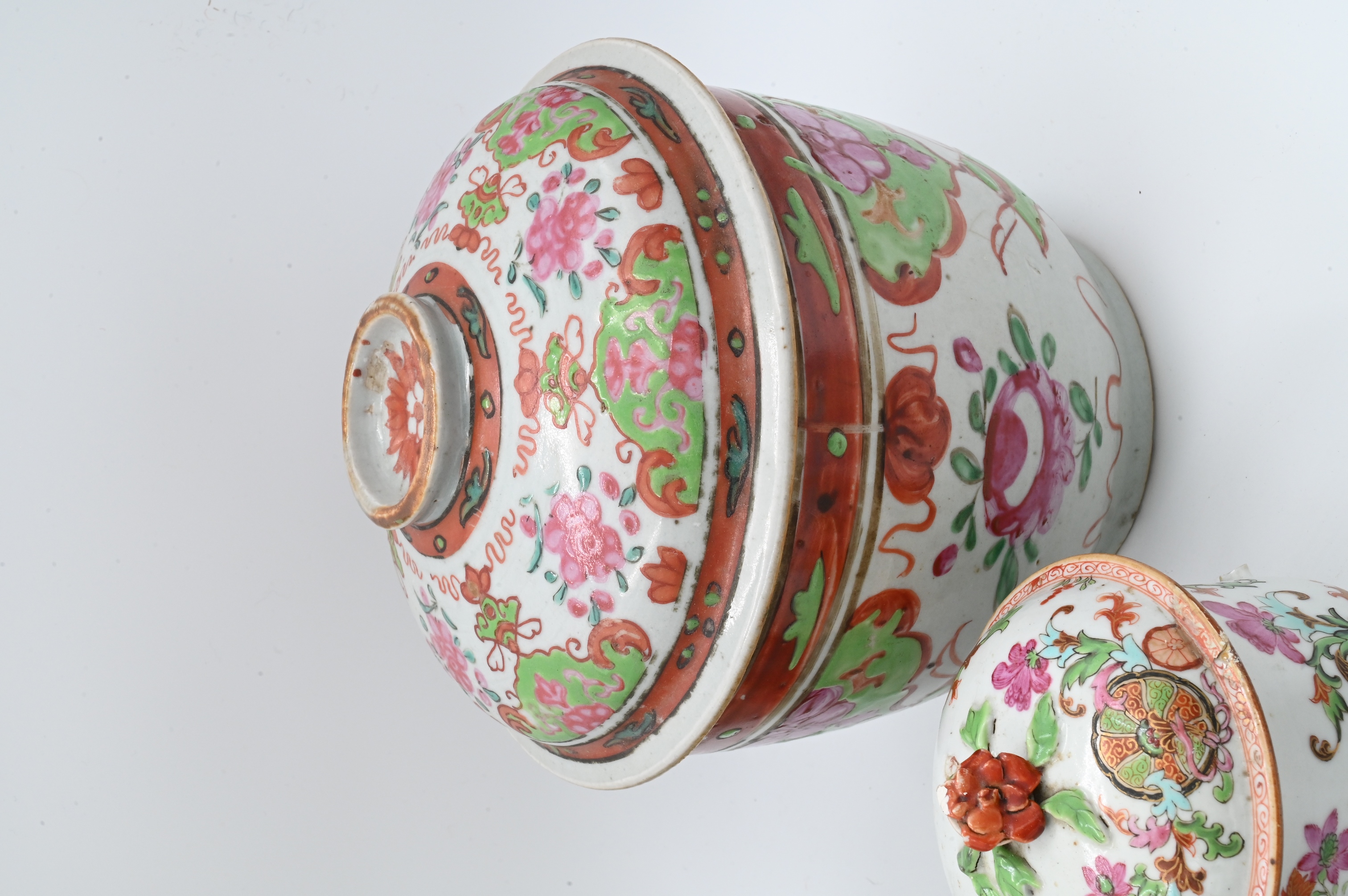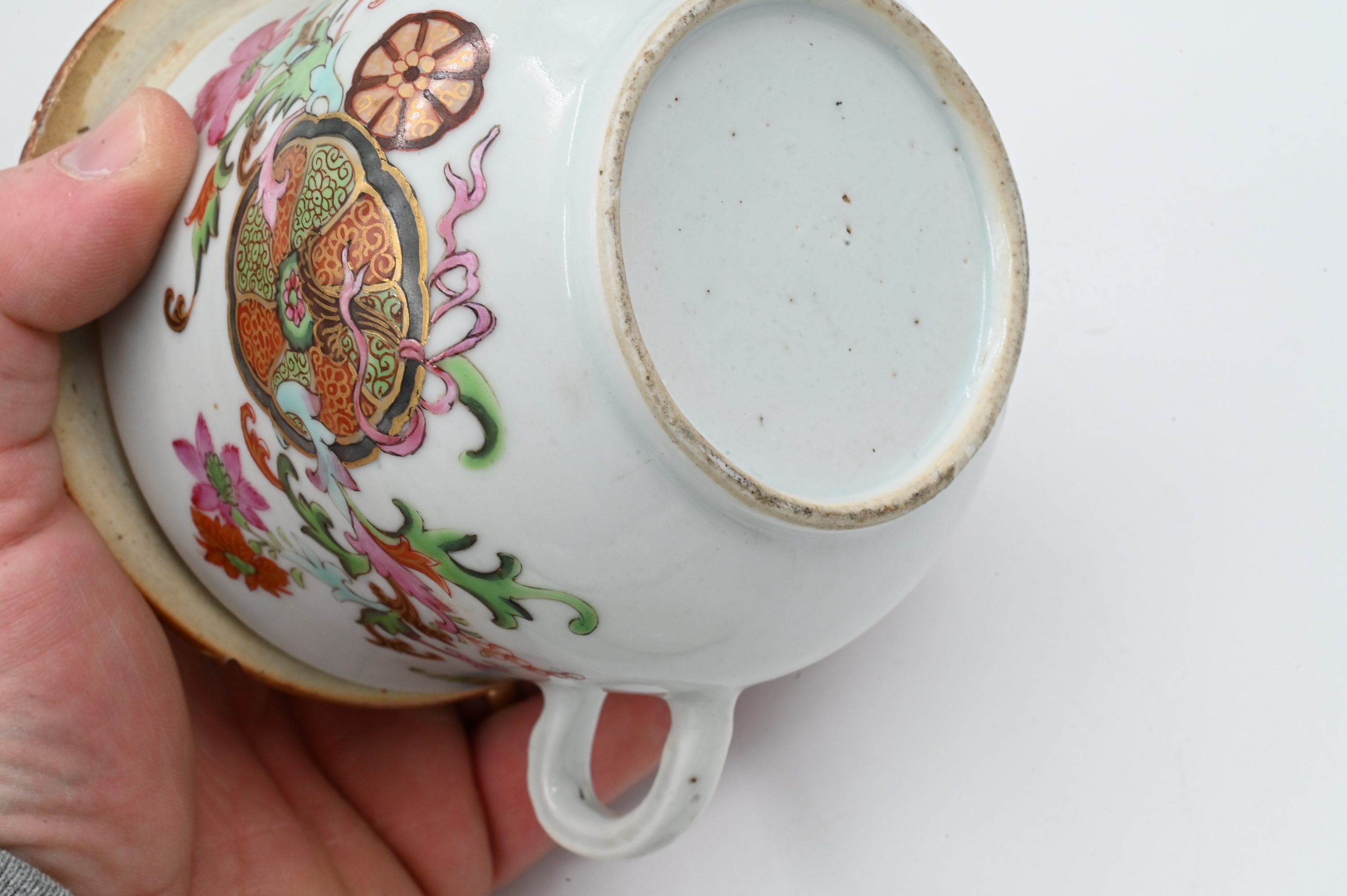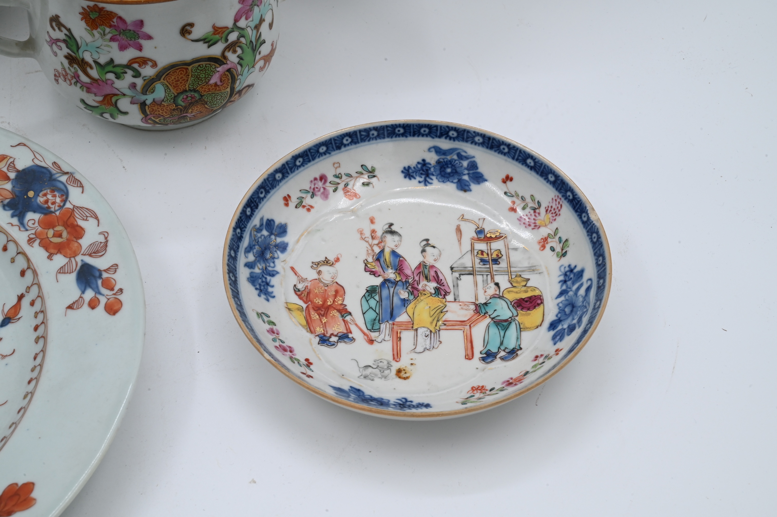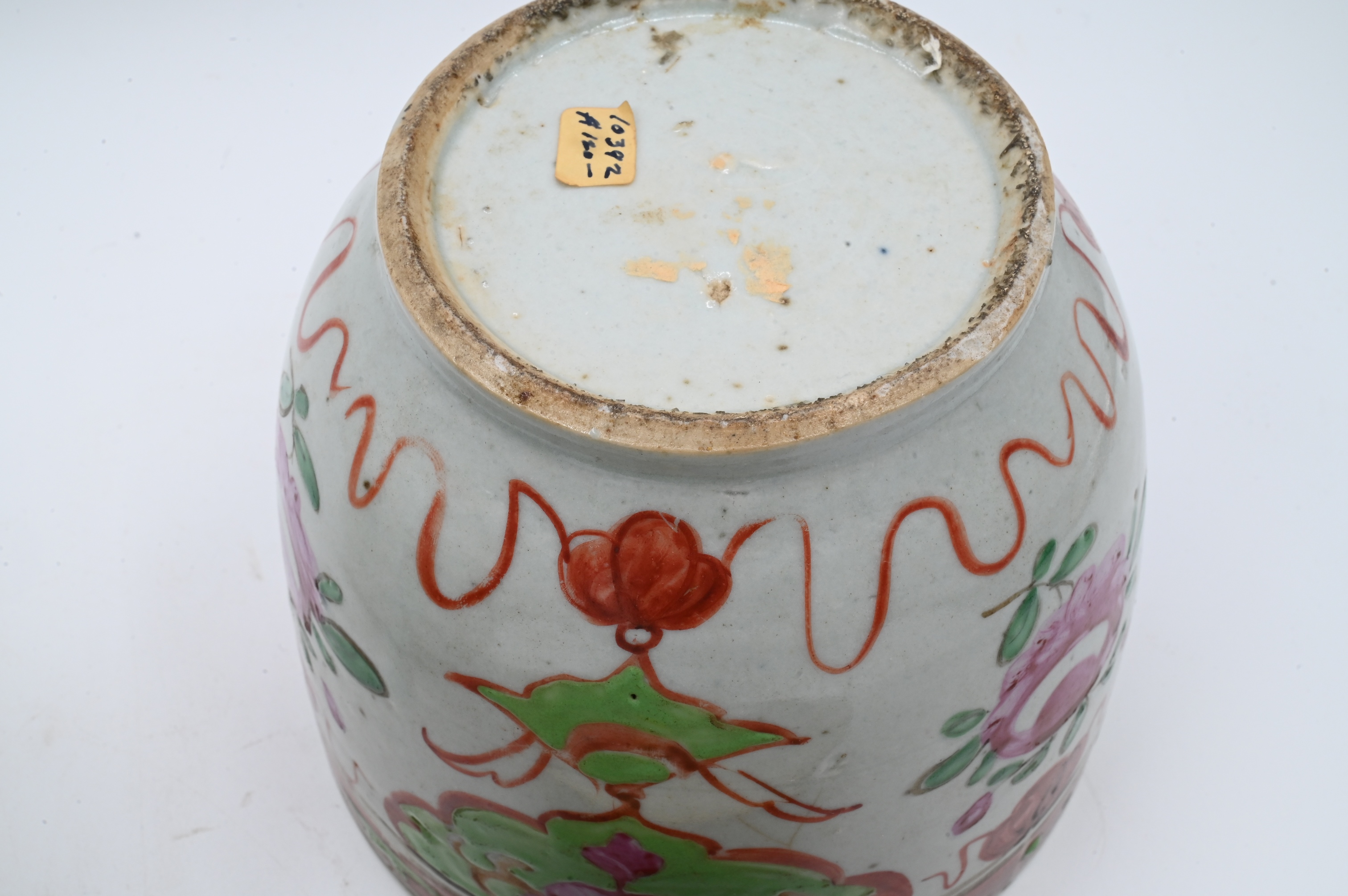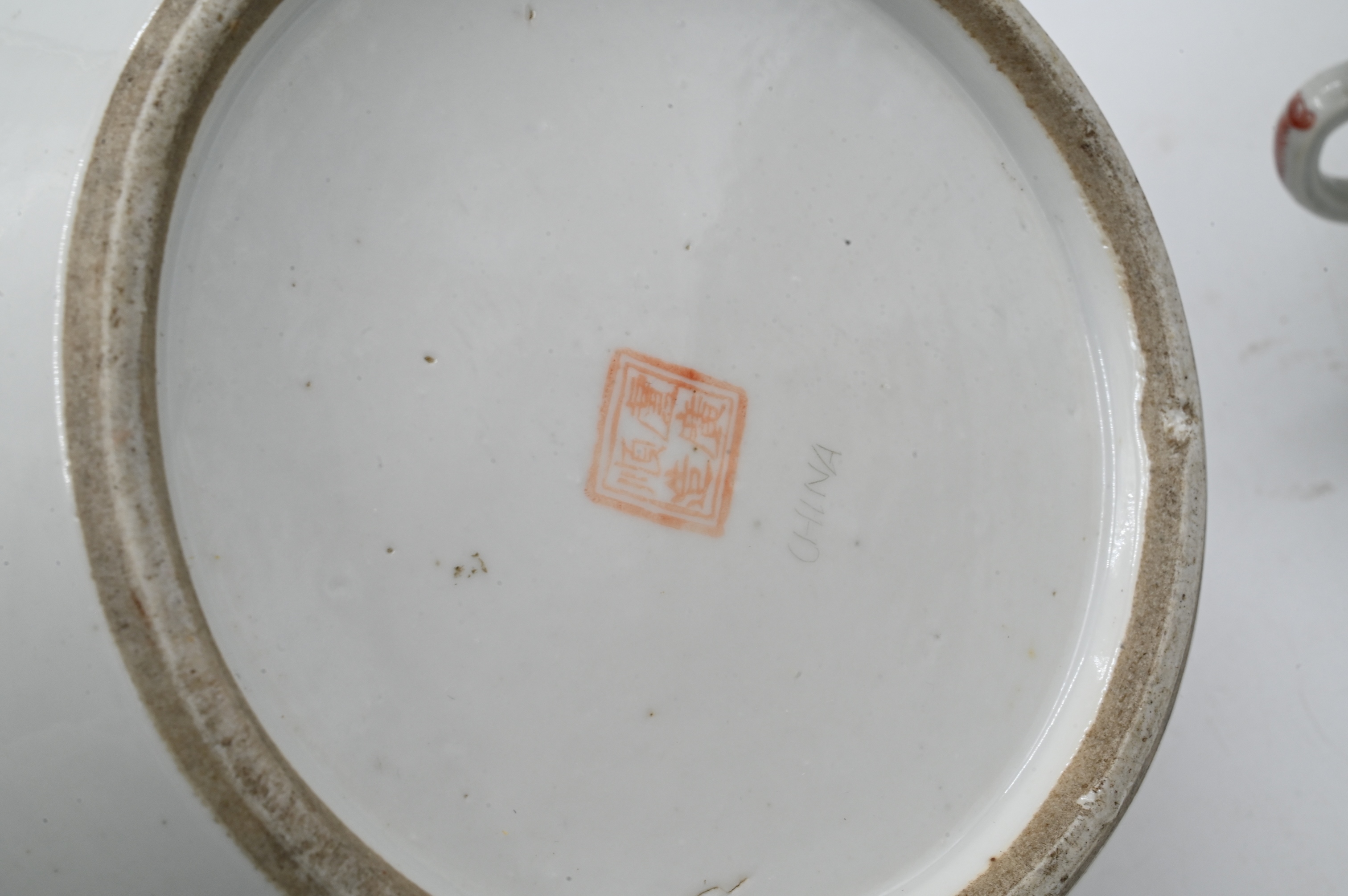 famille rose ginger pot having painted garden scene, small cache pot with cover painted with wild flowers, Chinese covered ginger pot, saucer, and an Imari plate