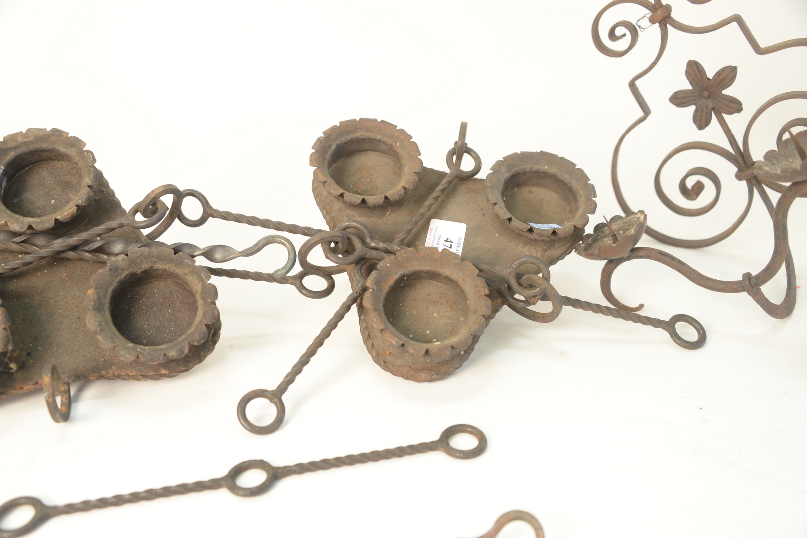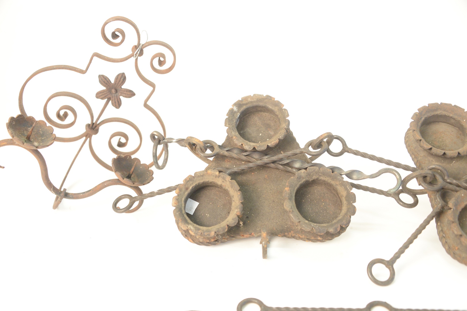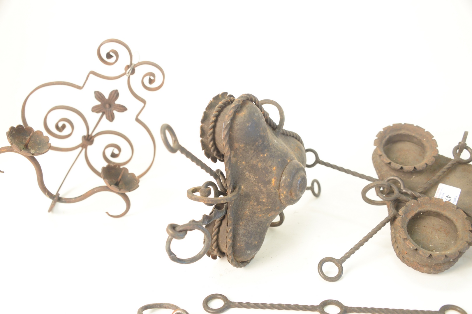 Lot 476: Four Piece Group to include pair of Addison Meisner school iron archaic style hanging lamps, pair of iron candle sconces, height 12 …
