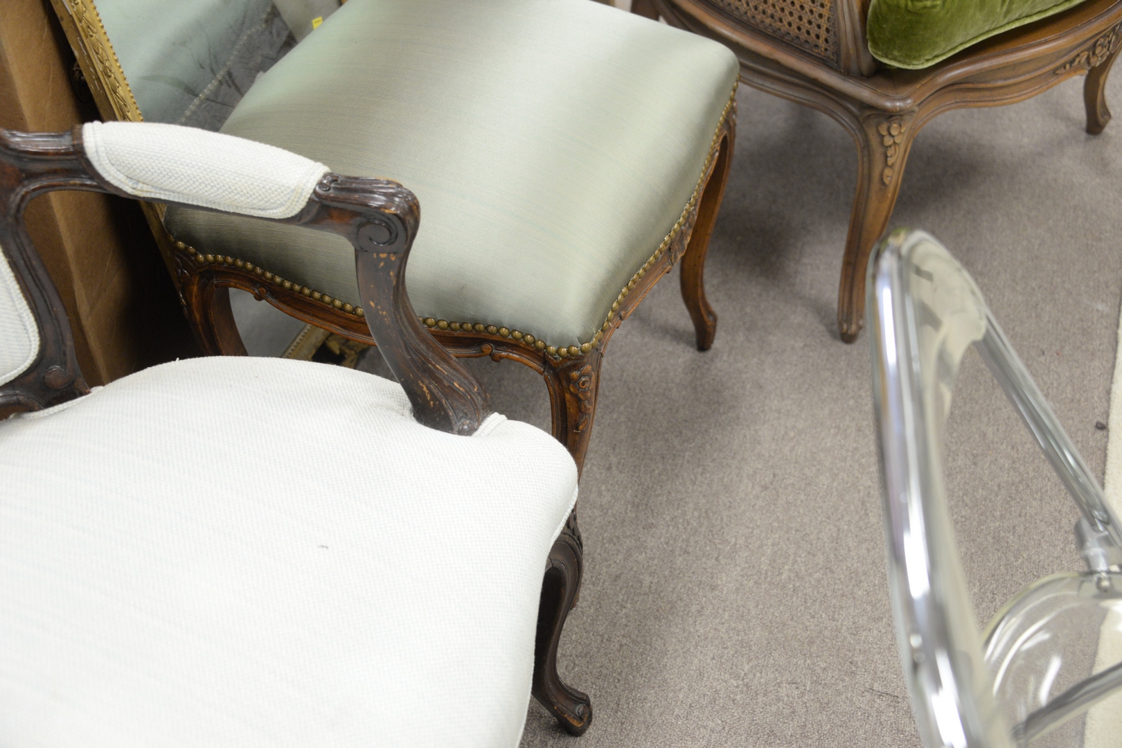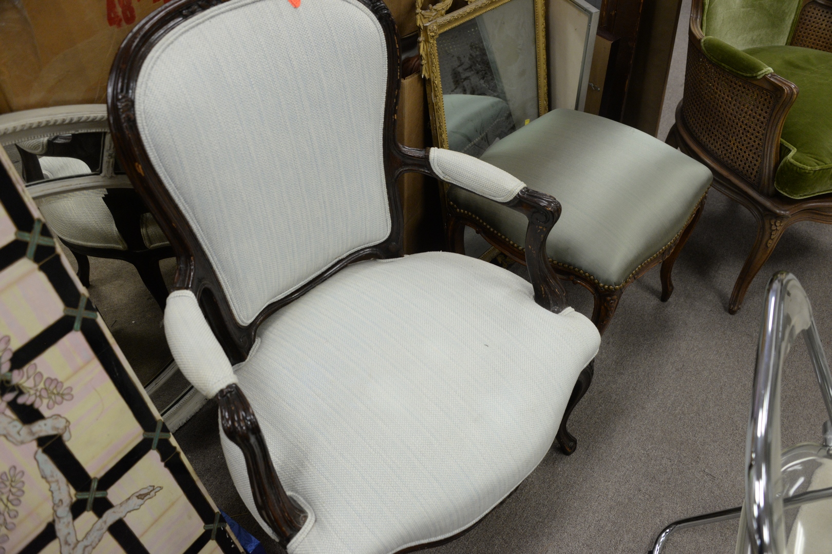 Lot 476: Four Piece Outdoor Lot, to include sofa/glider with cushions, along with a pair of end tables and a coffee table, sofa length 73 inches.