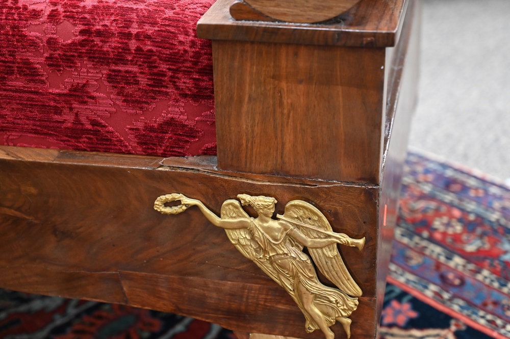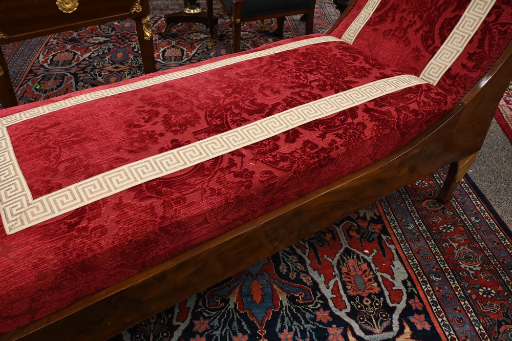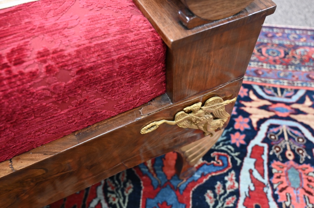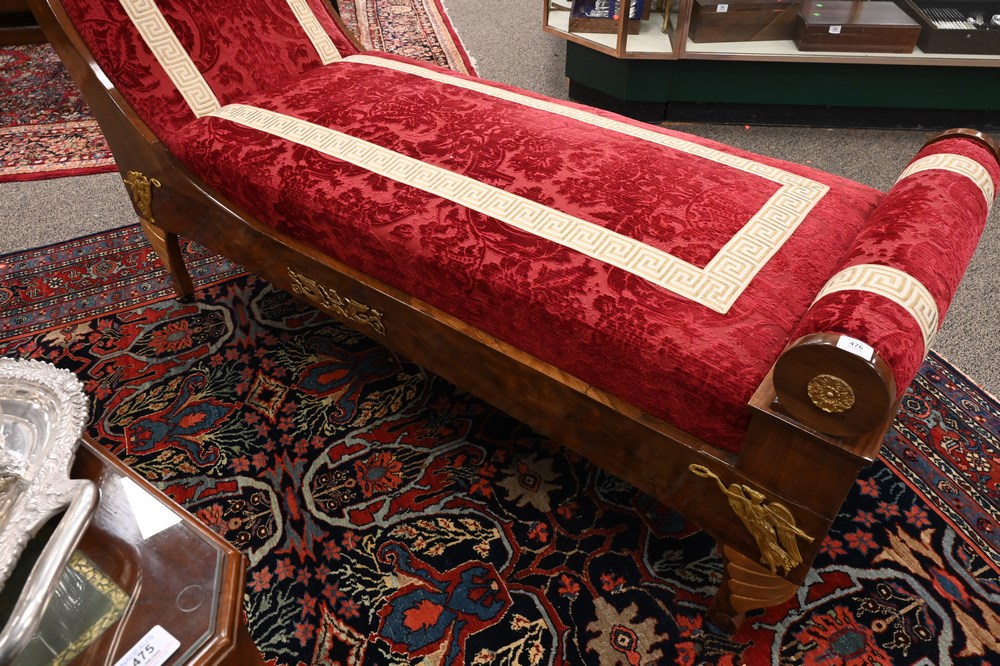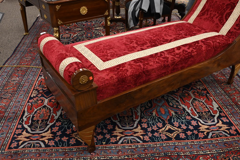 Lot 476: French Empire Mahogany Daybed, having custom upholstery and gilt bronze mounts on gilt decorated legs, circa 1840, height 44 inches,…
