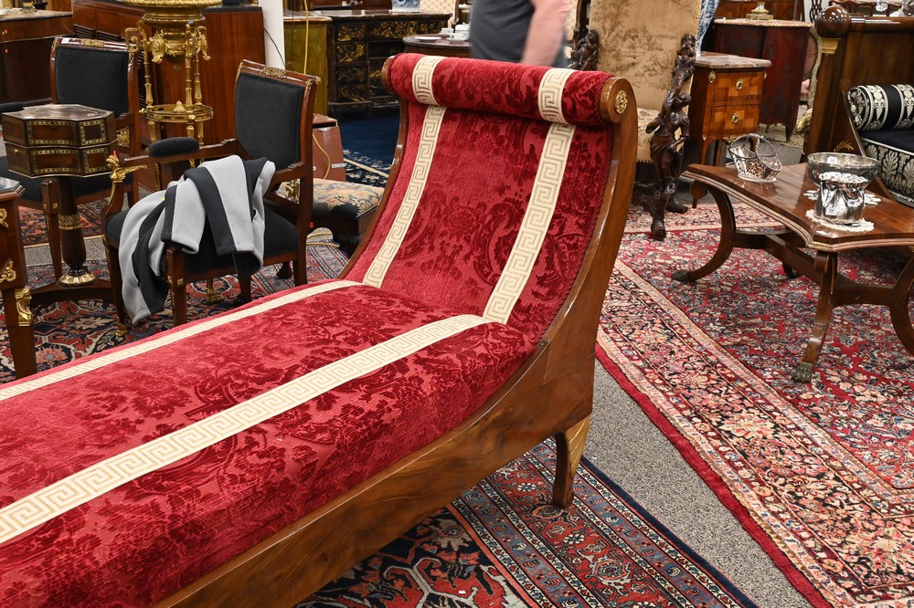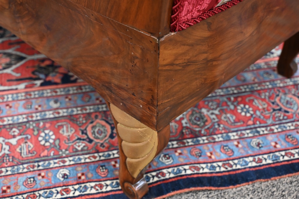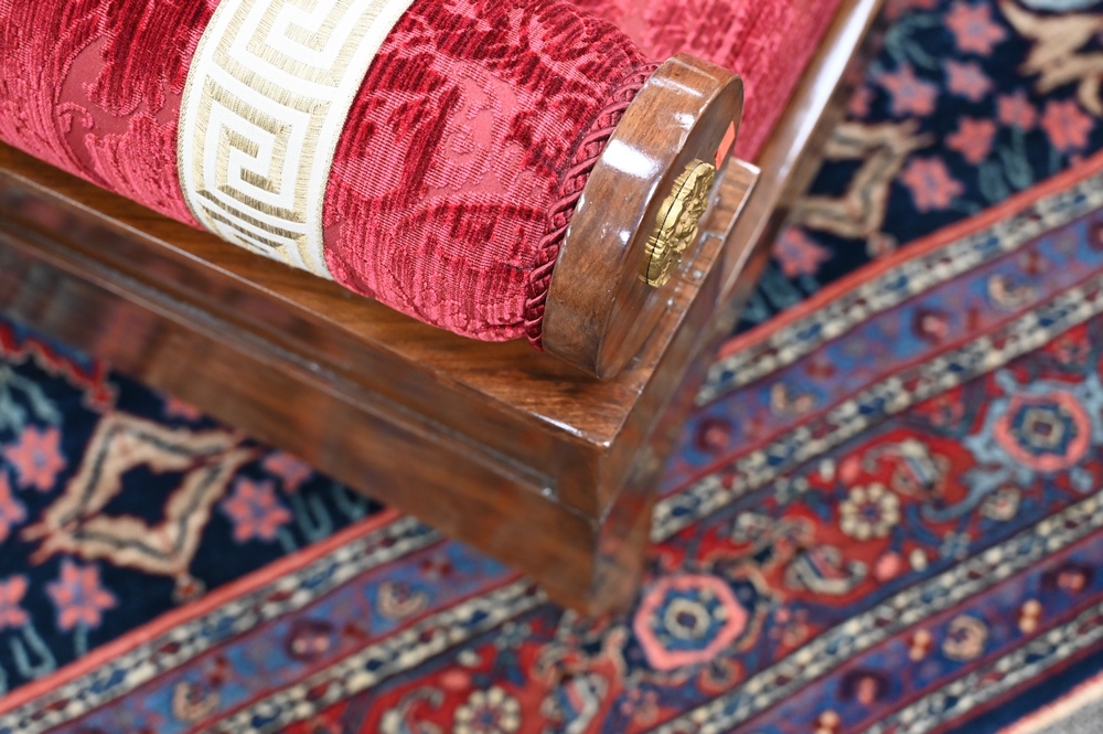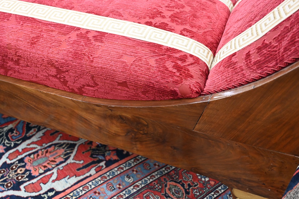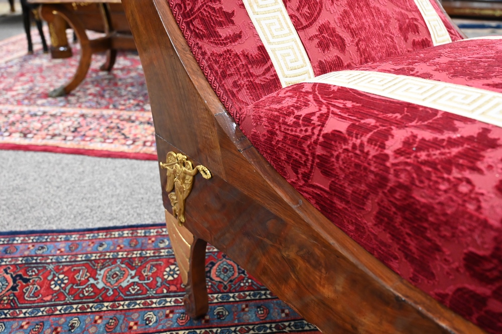Lot 476: French Empire Mahogany Daybed, having custom upholstery and gilt bronze mounts on gilt decorated legs, circa 1840, height 44 inches,…