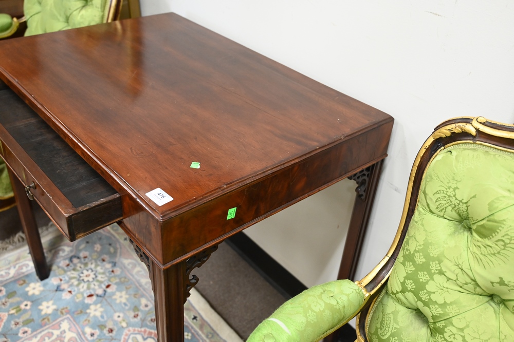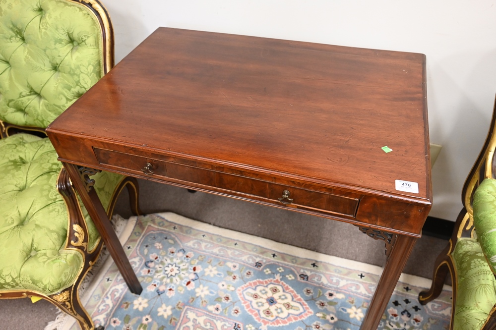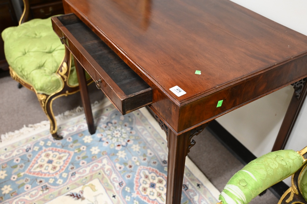 Lot 476: George III Mahogany Table, having drawer on square molded legs, 19th century, height 31 inches, top 22 x 32 inches, (legs ended out).