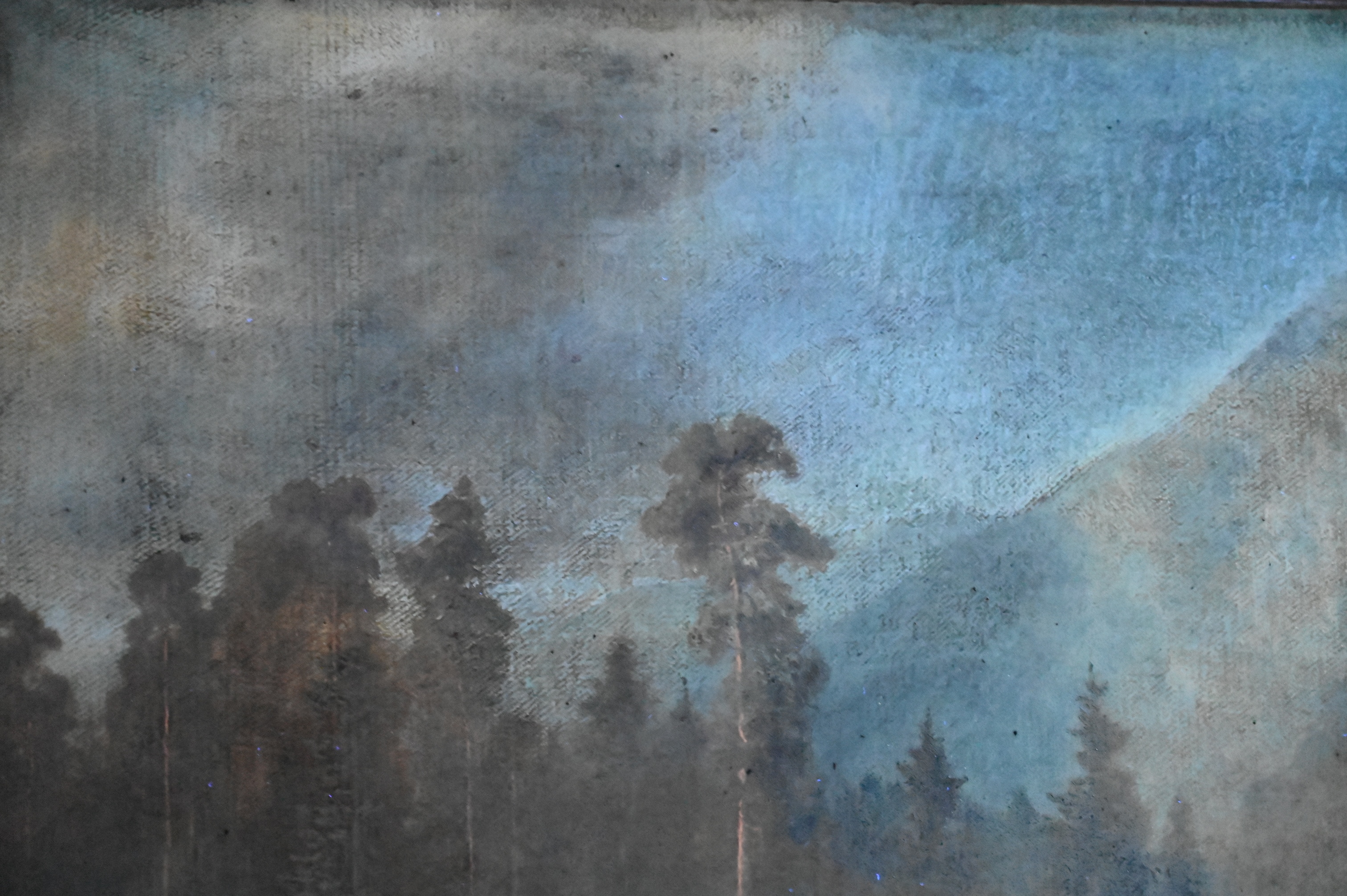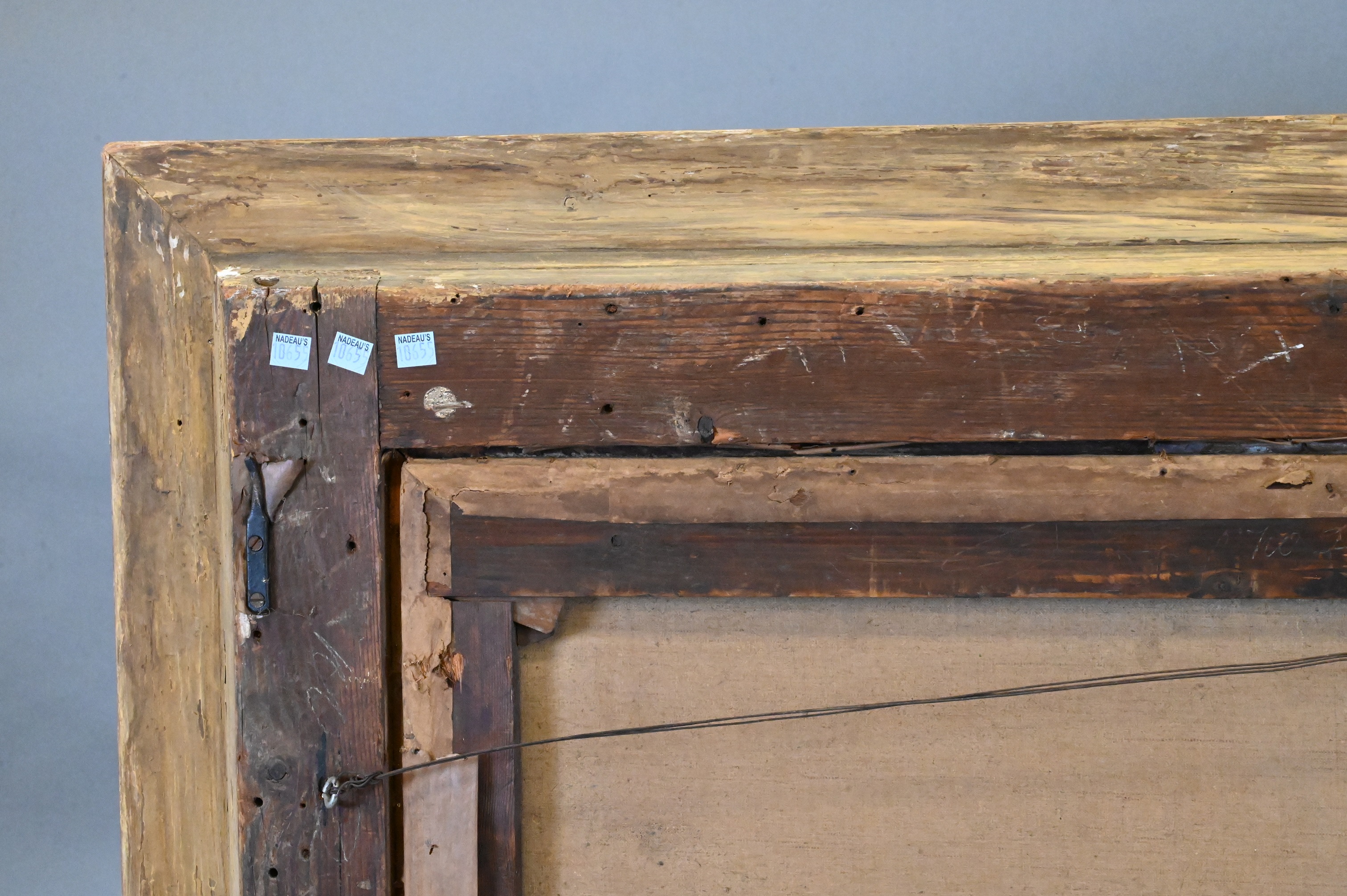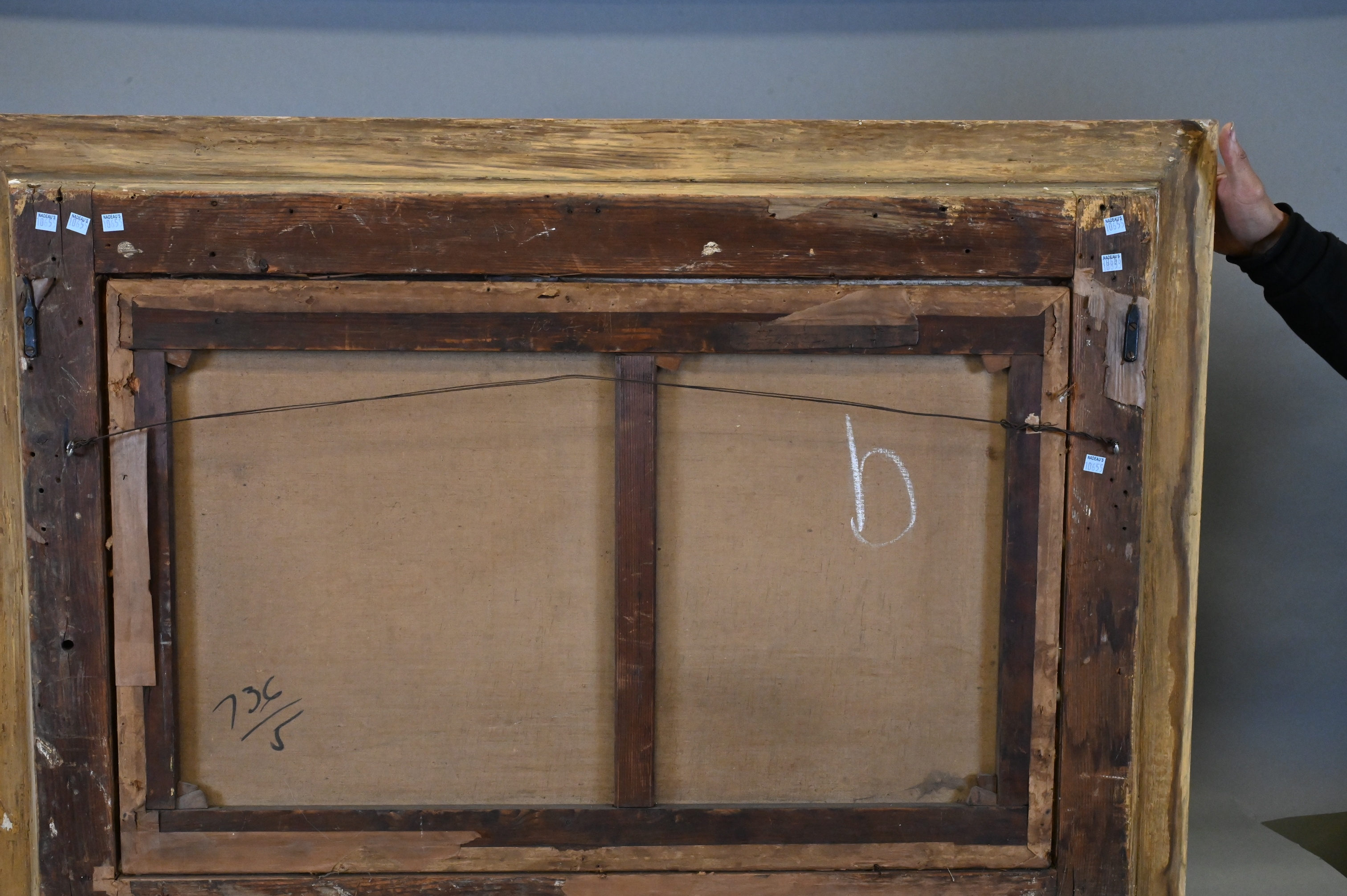 Condition: presents well, relined and restretched canvas, craquelure throughout, heavy varnish throughout hindering the view of any inpainting underneath, surface grime