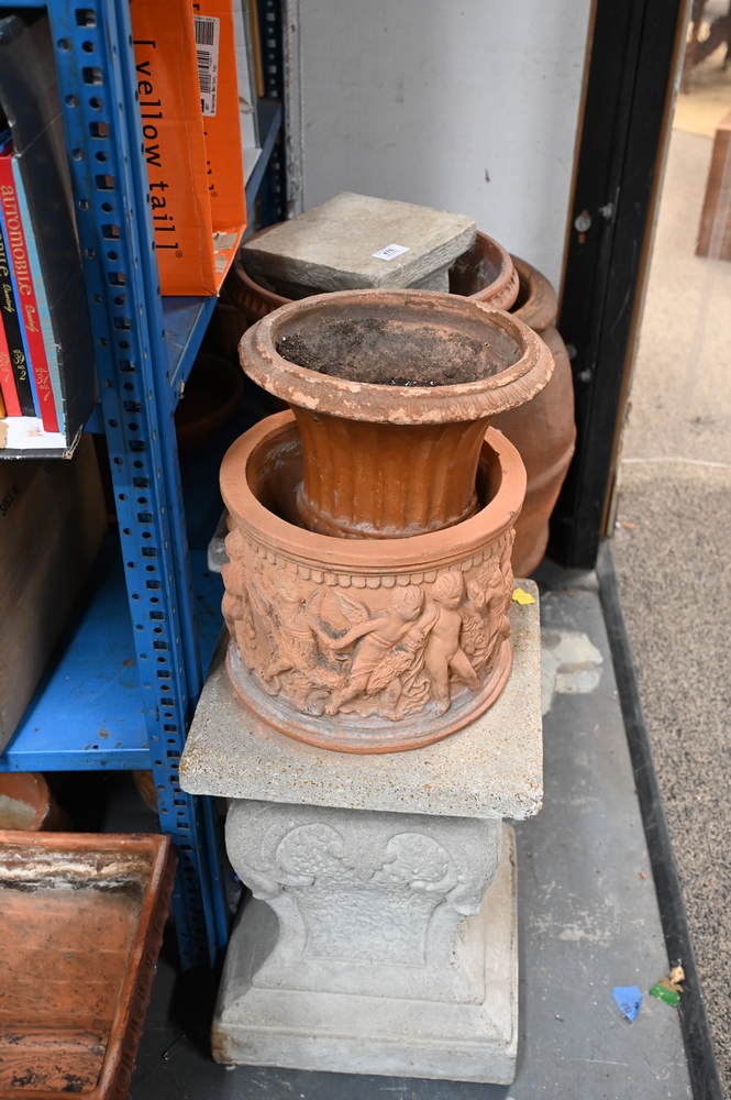 Lot 476: Large Outdoor Pottery Grouping, to include pair of cement pedestals along with various size planters, pedestals height 20 inches.