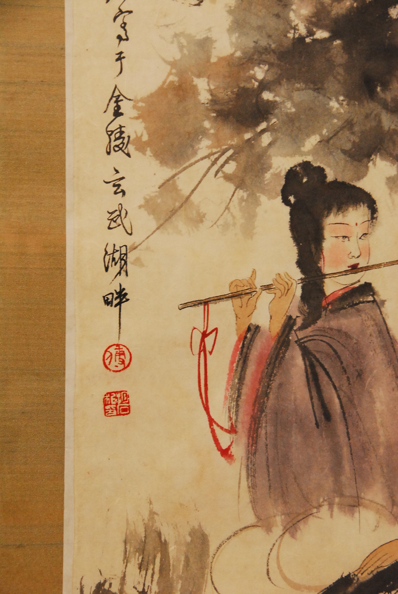 Large painting of scholar and two women, 31 x 19 1/2.