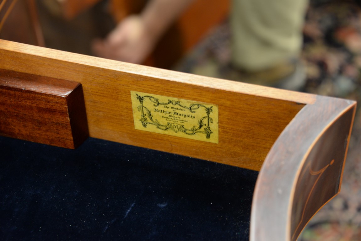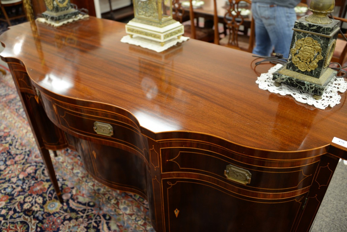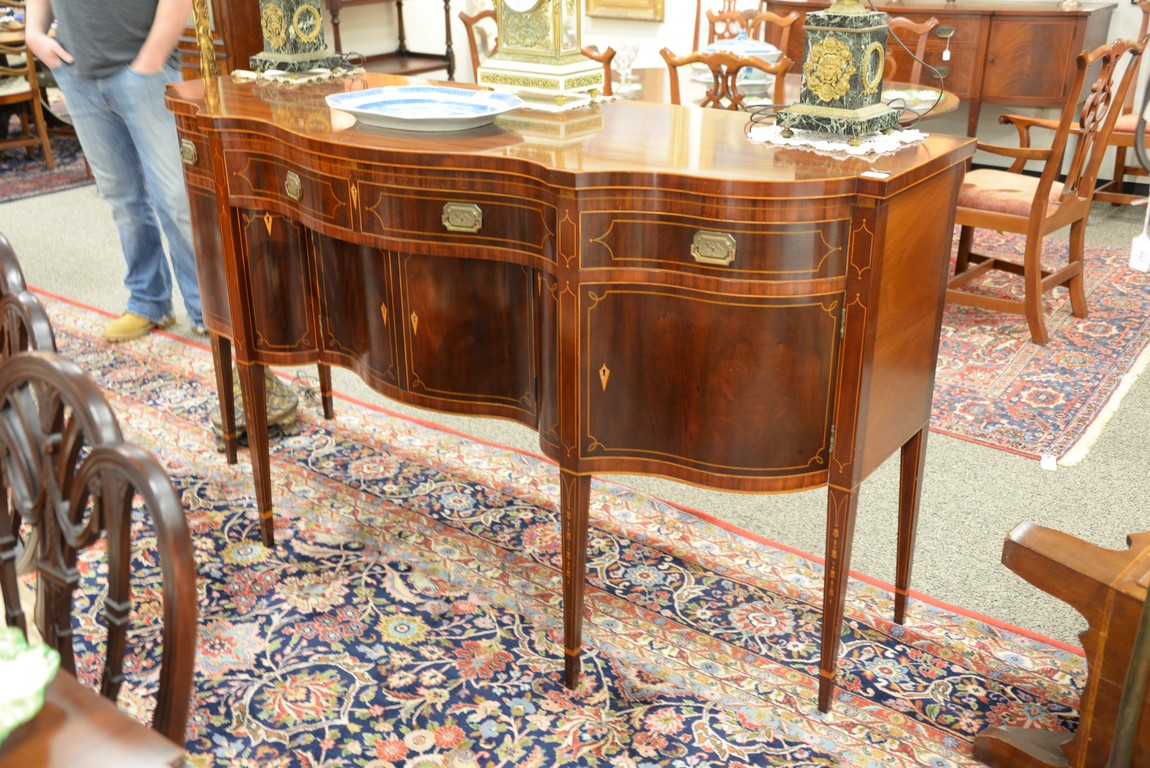 Lot 476: Margolis mahogany sideboard, Federal style with shaped top over conforming case with one center drawer flanked by two drawers over t…