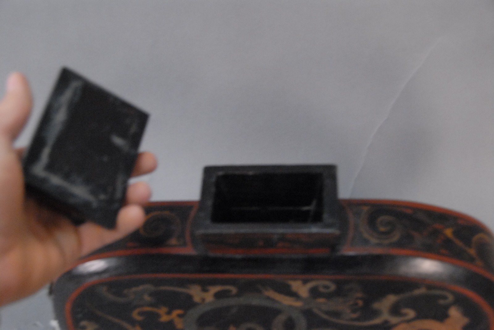 Painted lacquer Bianhu vessel with painted dragon and tiger design.