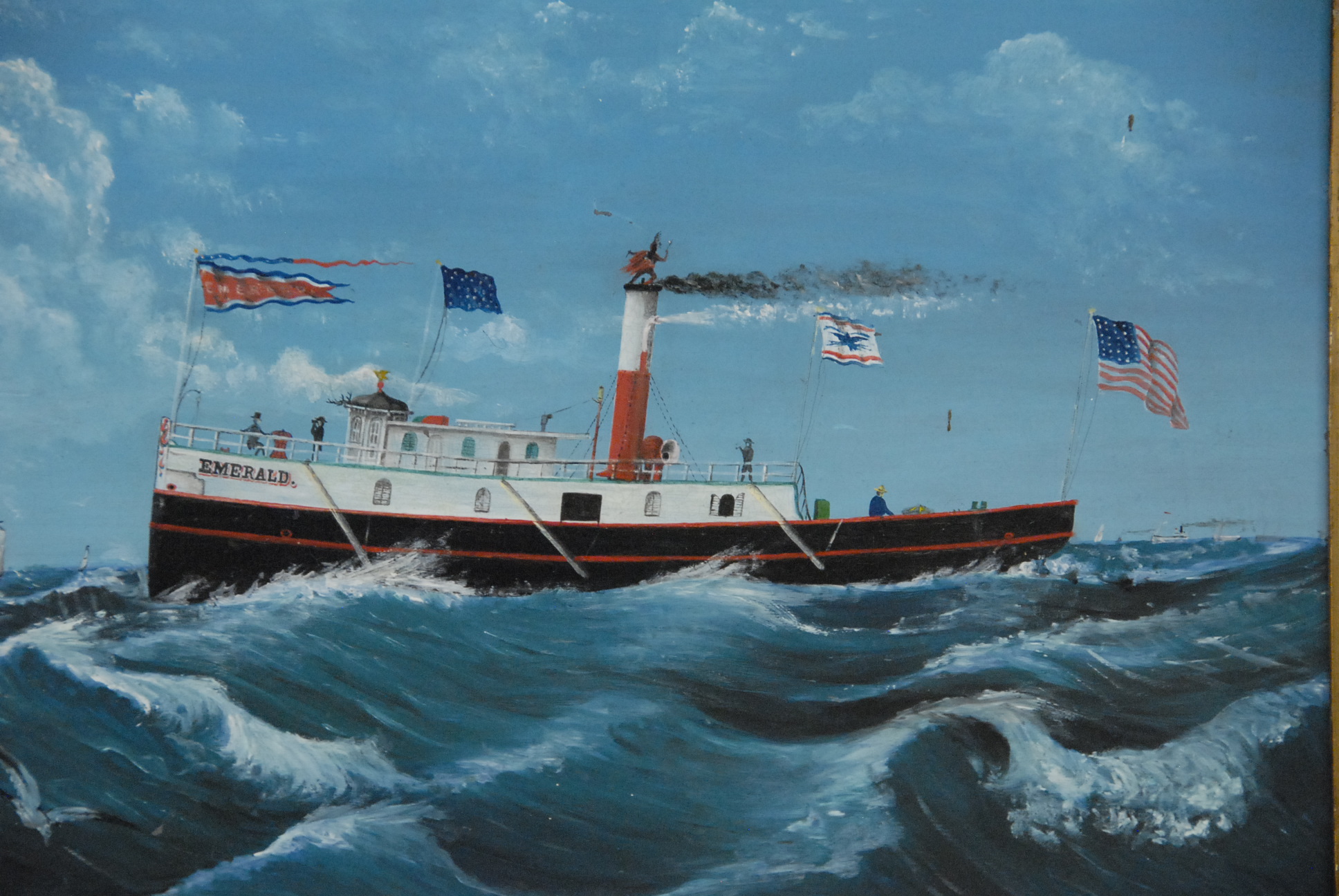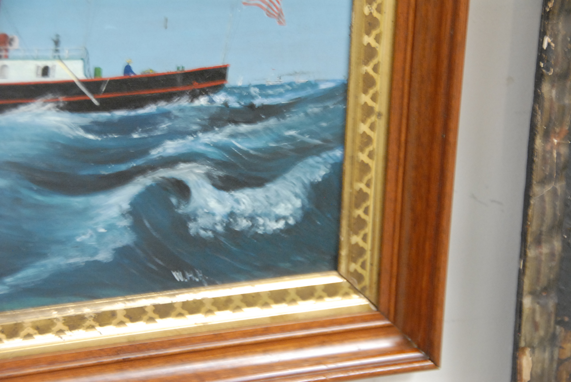 STEAM BOAT WITH AMERICAN FLAG oil on tin signed lower right W. H. H.