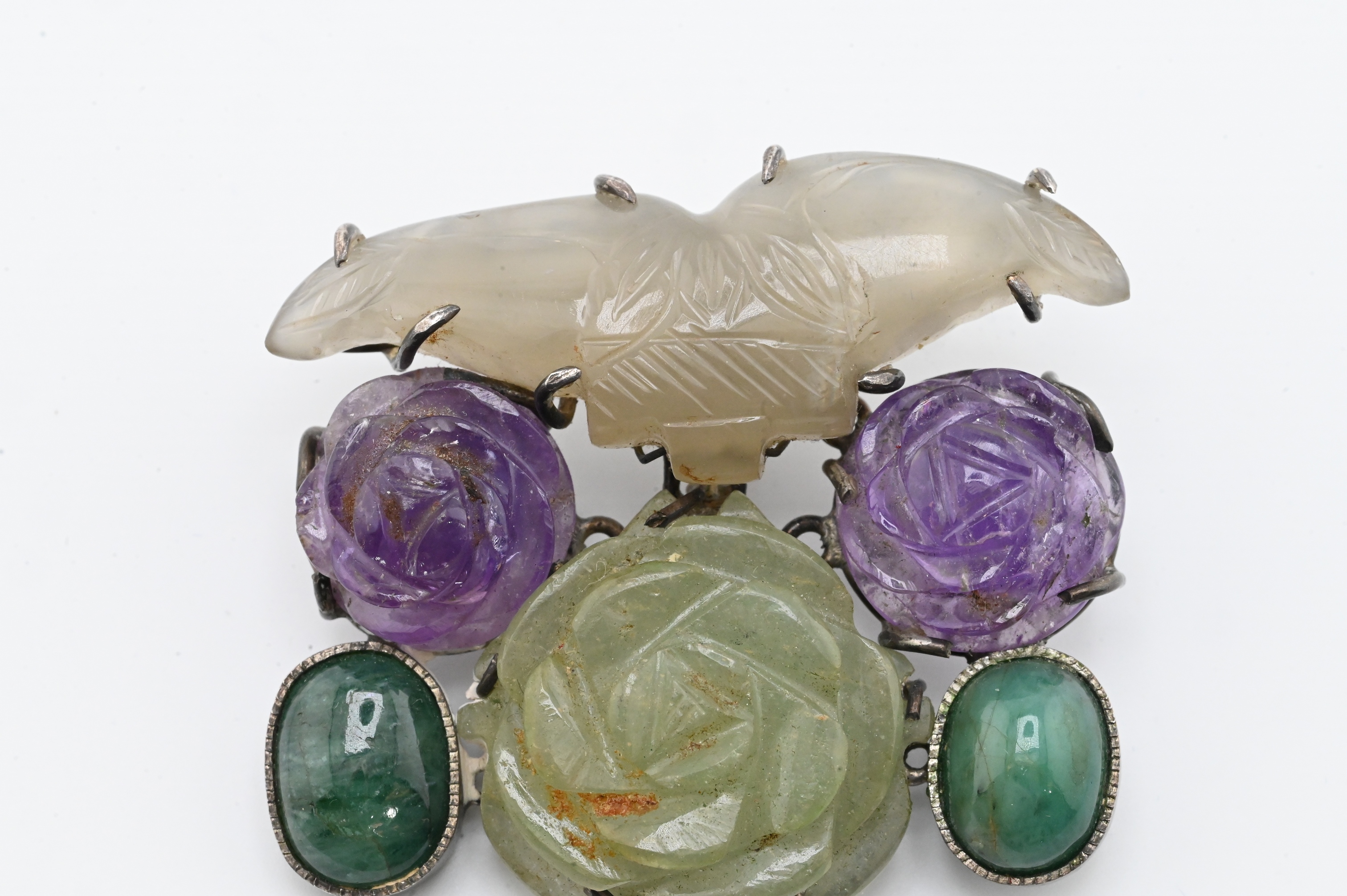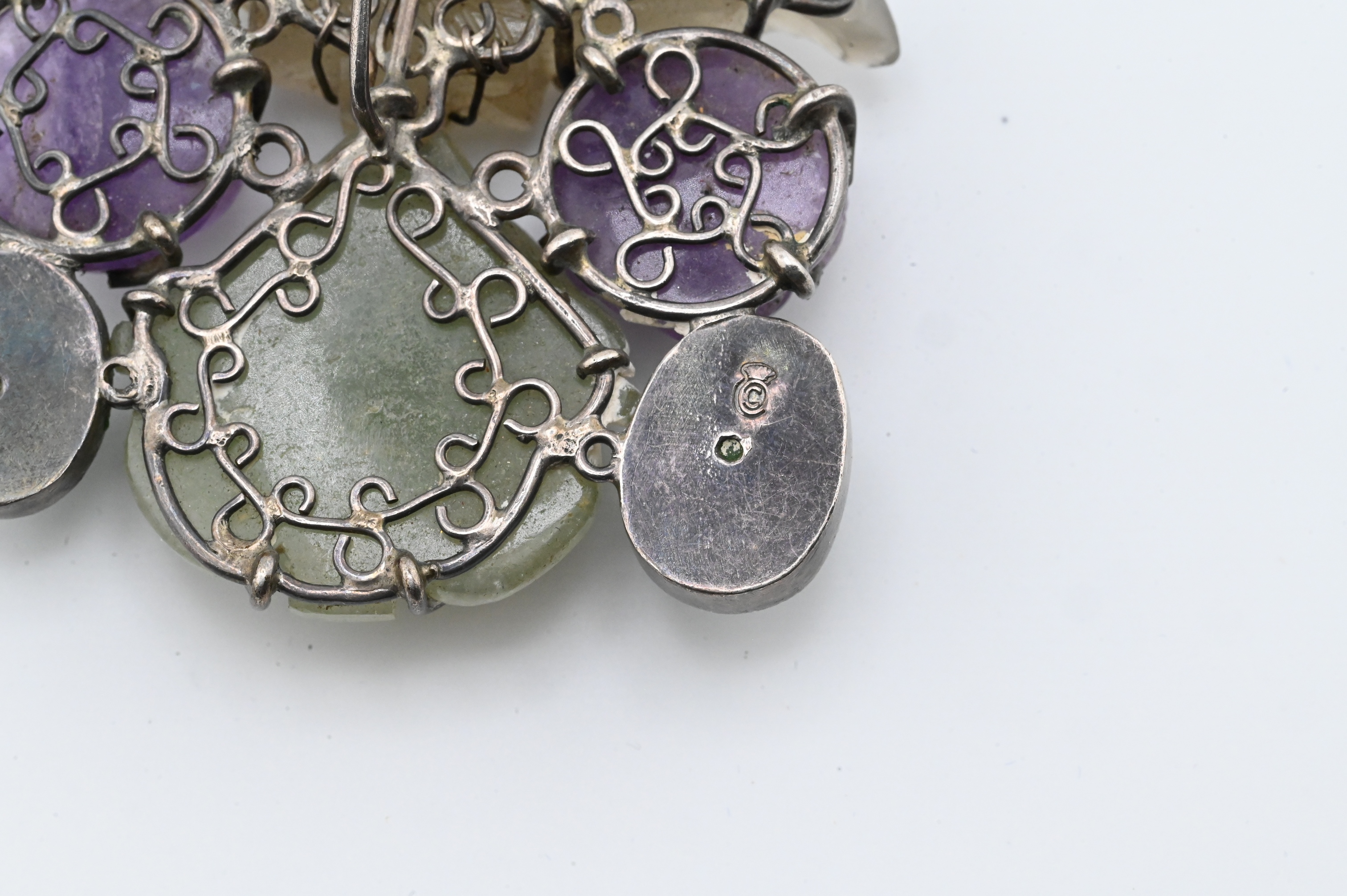 having floral design with purple quartz, jadeite, and silver mount