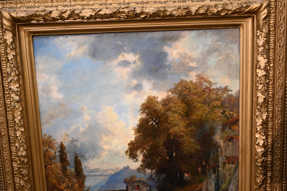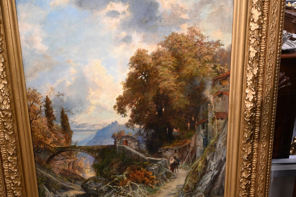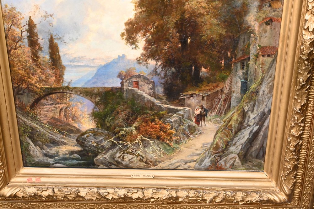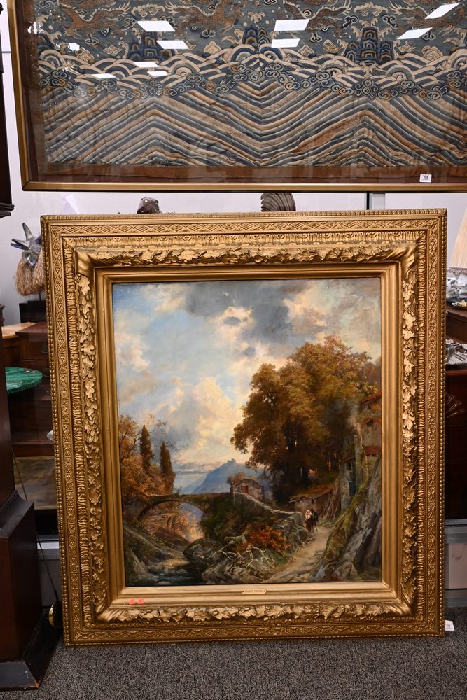 Lot 477: Ernest Julius Prayer German, 1842 – 1917 mountain side village oil on canvas signed and dated lower right “Ernest Prayer, 1880” 43 x 37 inches