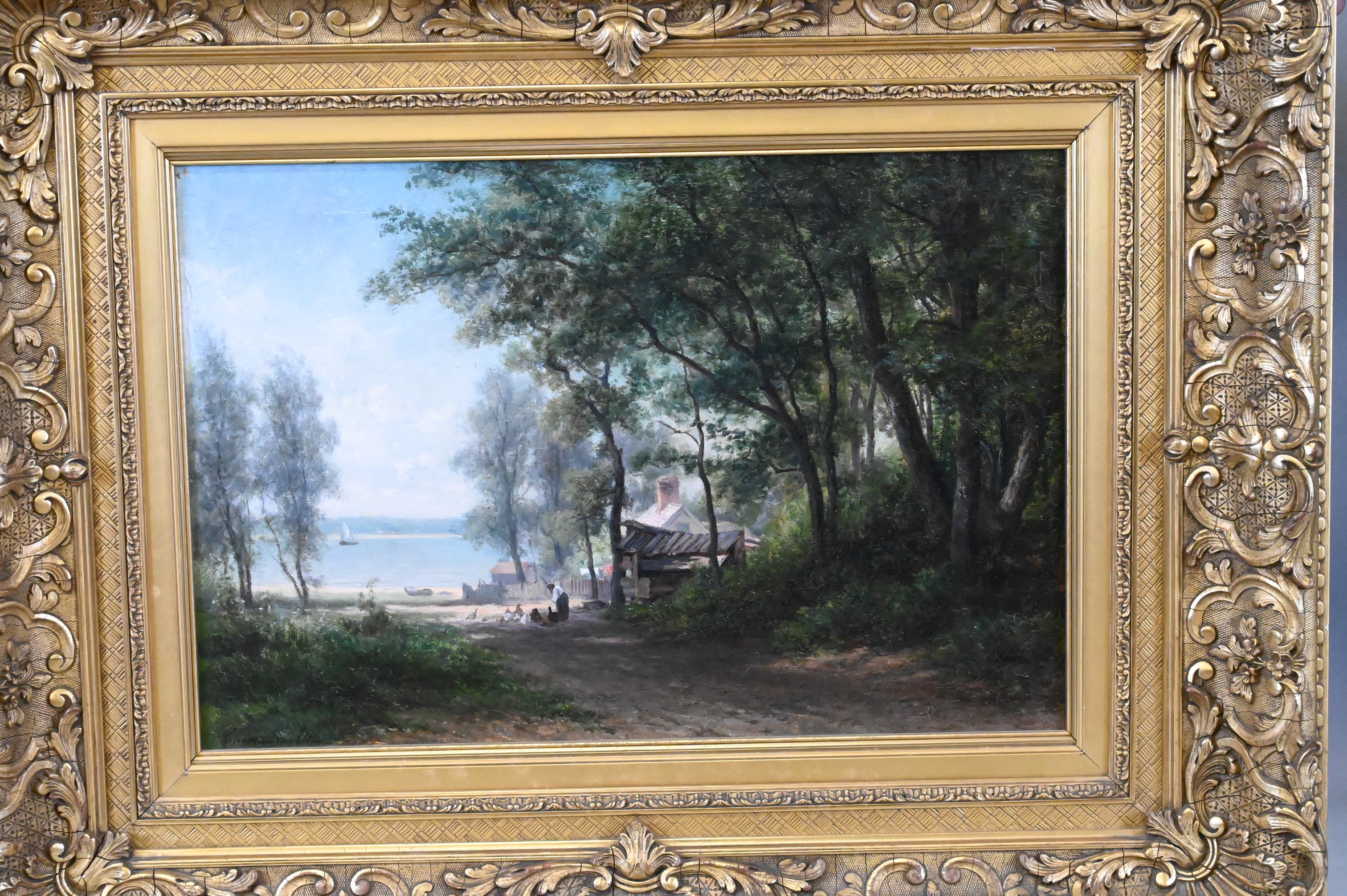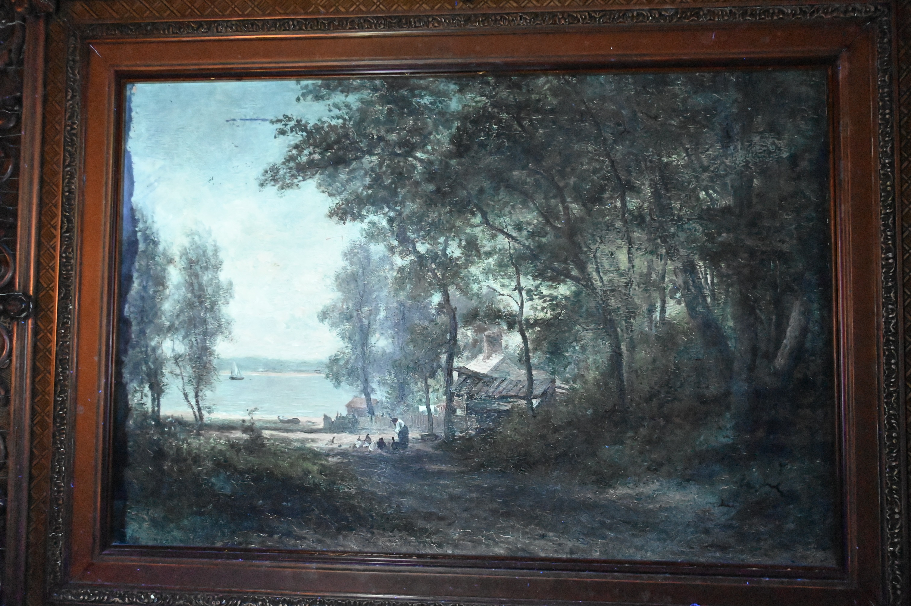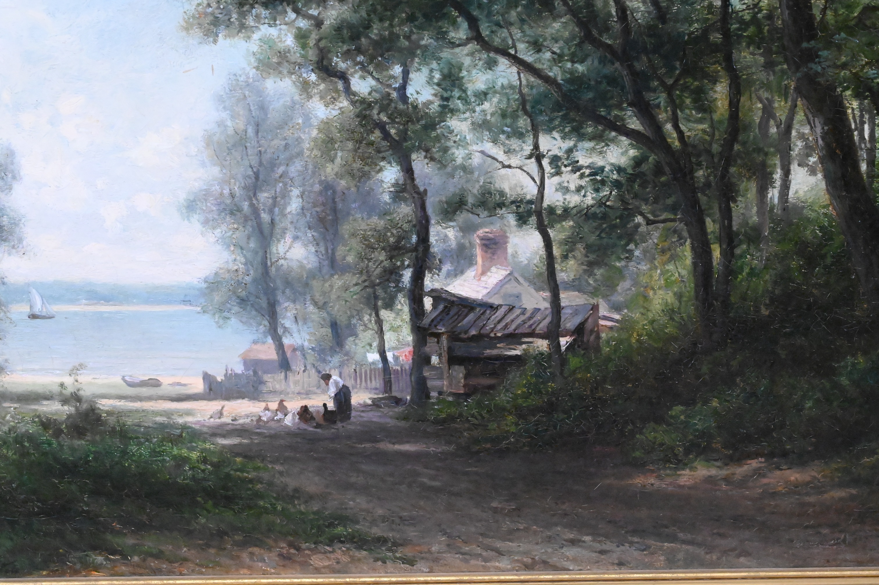 Depicting a forest landscape with a woman, chickens and sailboat in the background