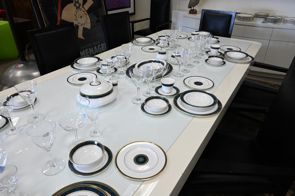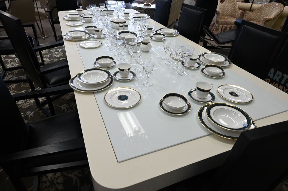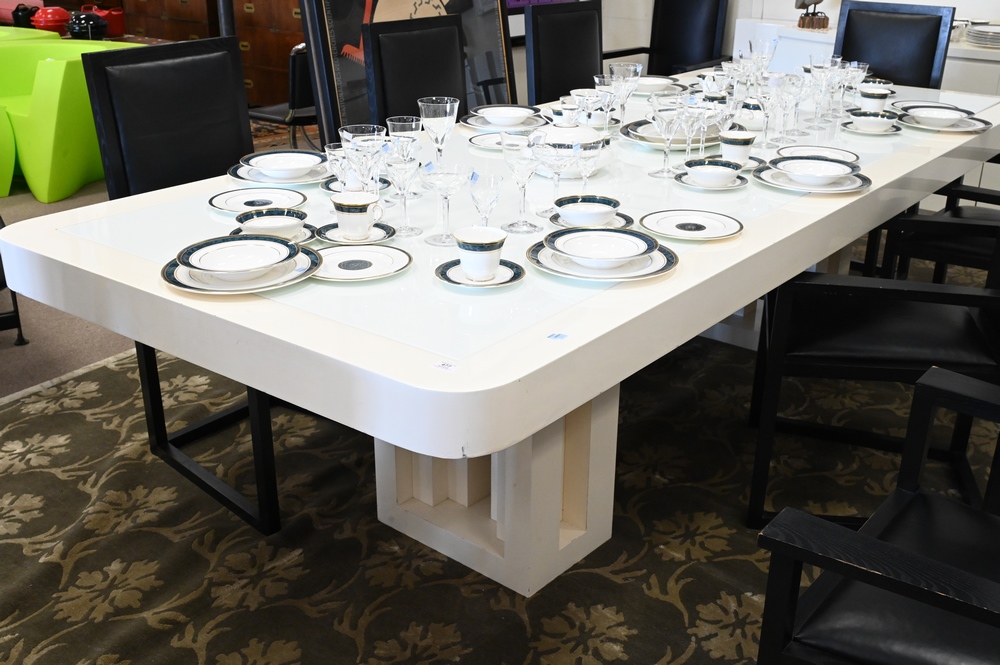 Lot 477: Large Contemporary Custom Ivory Lacquered Dining Table, having ivory lacquered and glass top on pedestal base, similar to Enrique Garcel, height 29 1/2 inches, top 48″ x 120″.