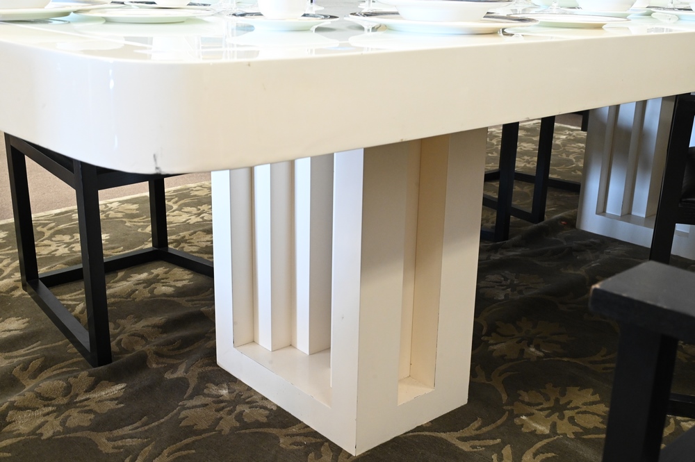 Large Contemporary Custom Ivory Lacquered Dining Table, having ivory lacquered and glass top on pedestal base, similar to Enrique Garcel, height 29 1/2 inches, top 48″ x 120″.