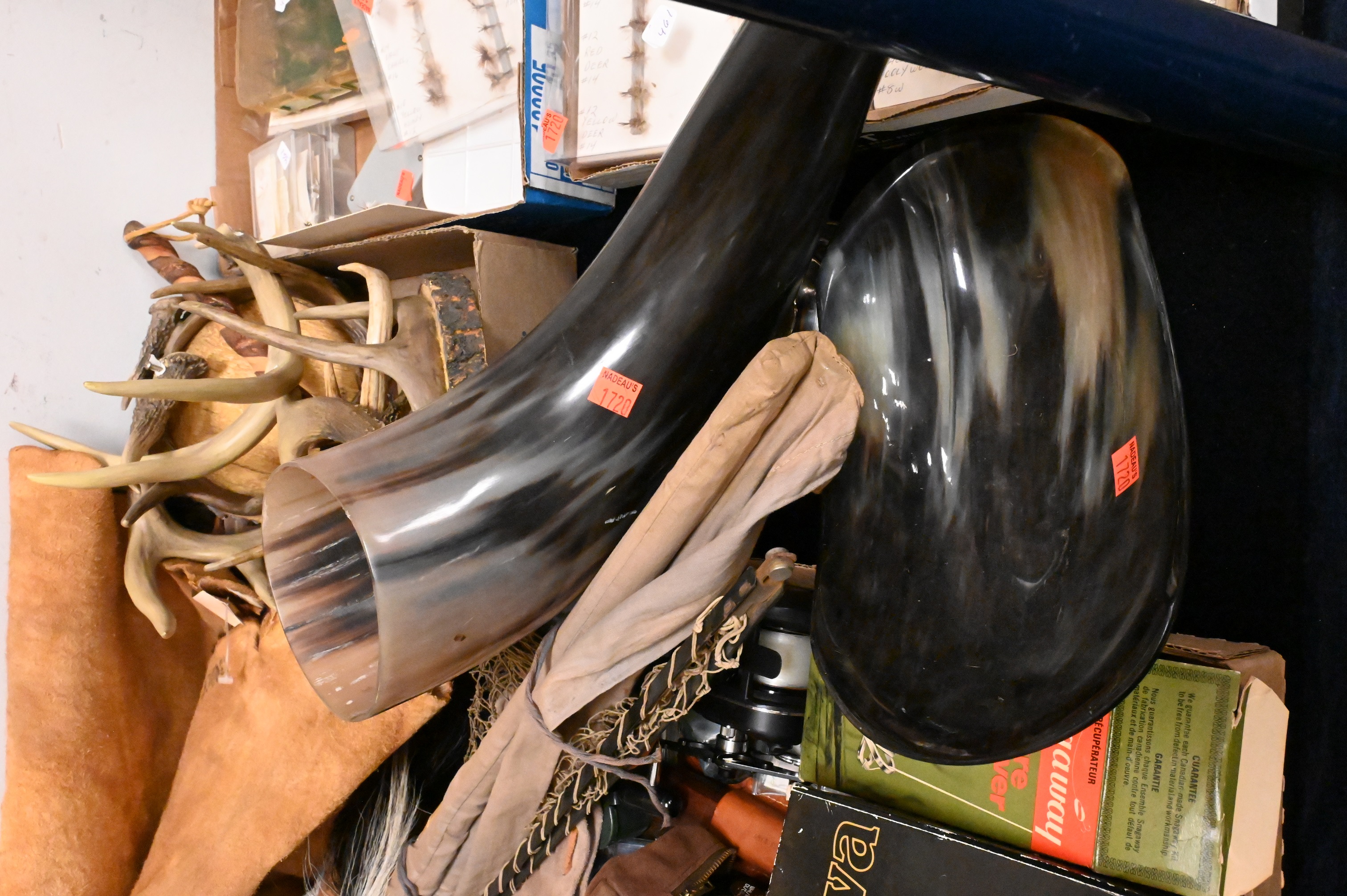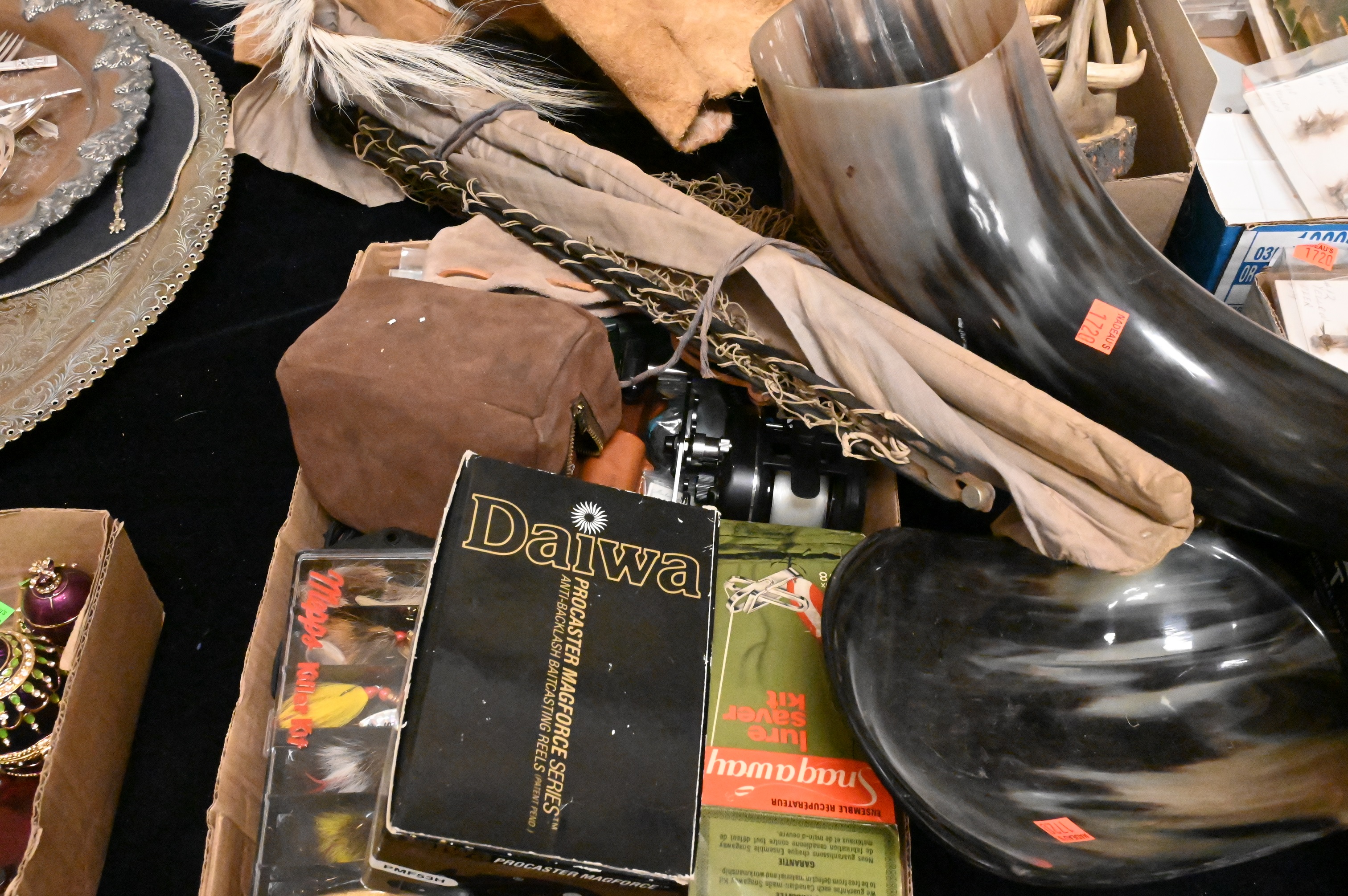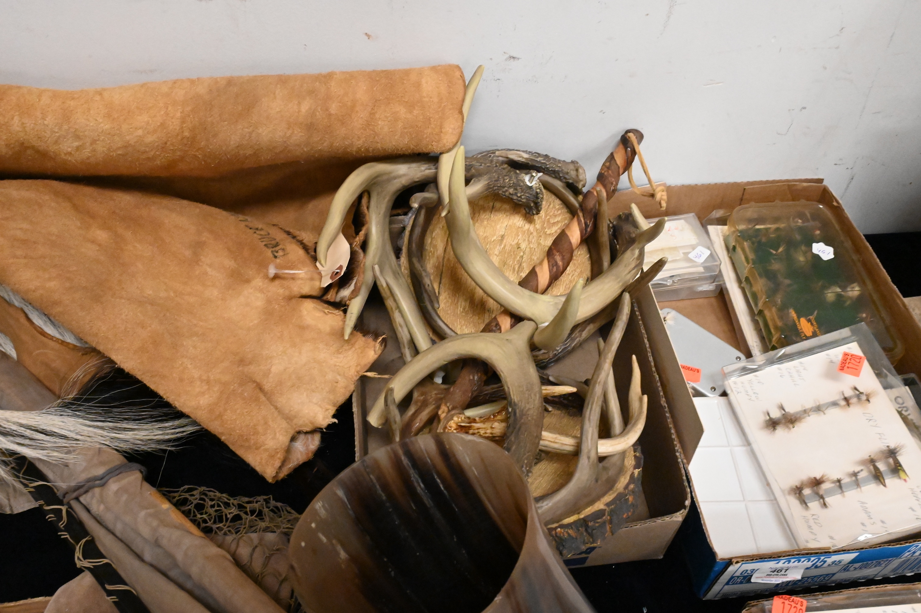 to include net, faux antlers, animal hides, flies, reels, etc.
