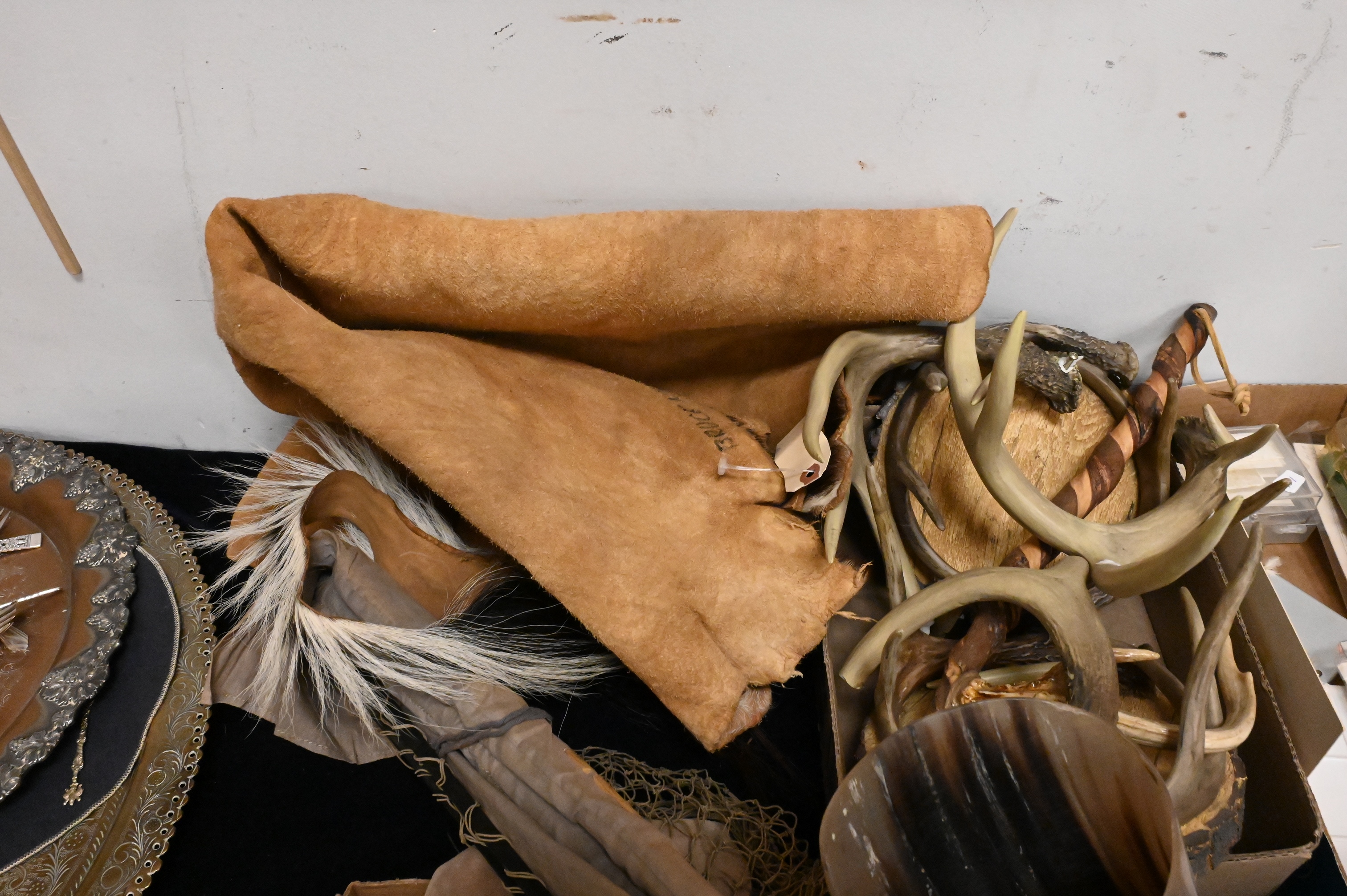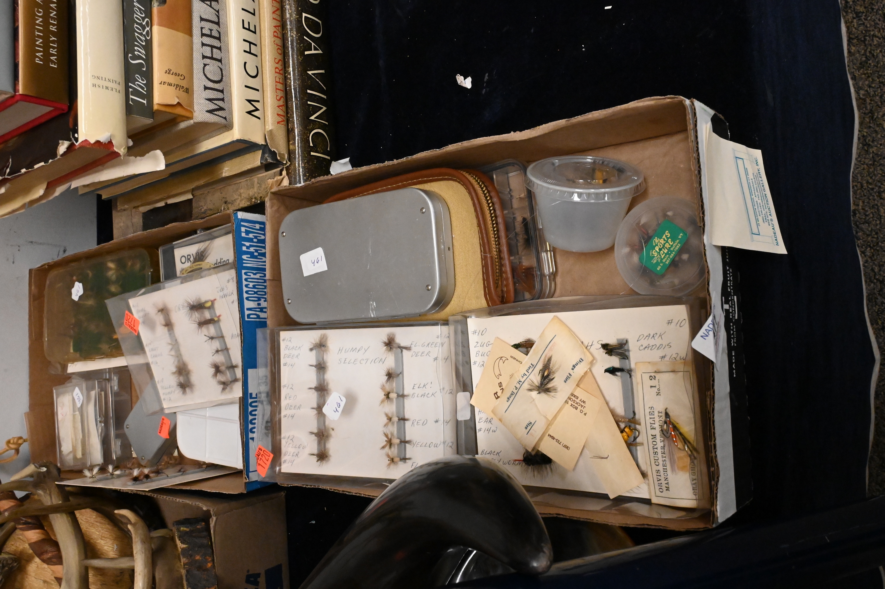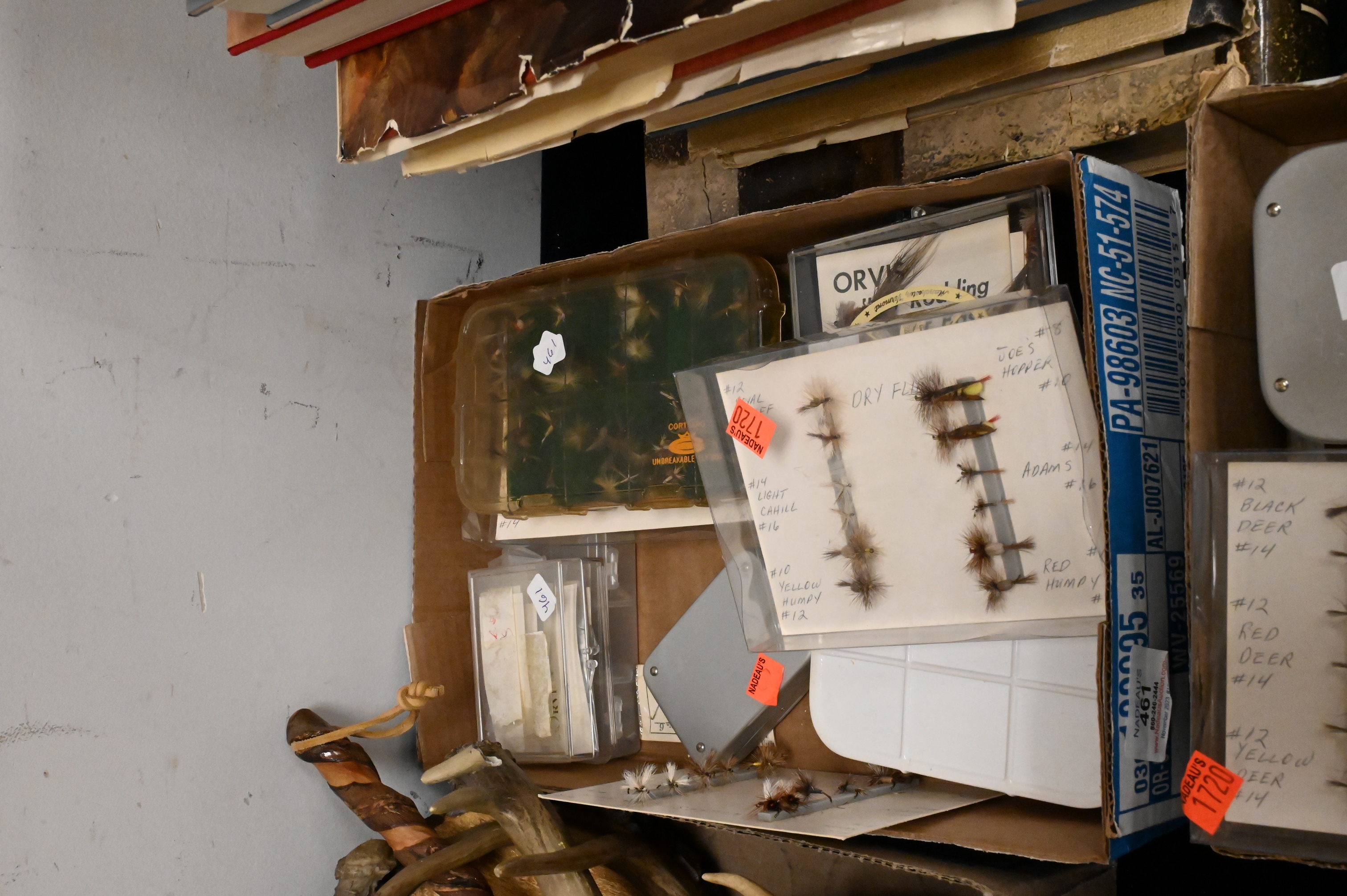 to include net, faux antlers, animal hides, flies, reels, etc.